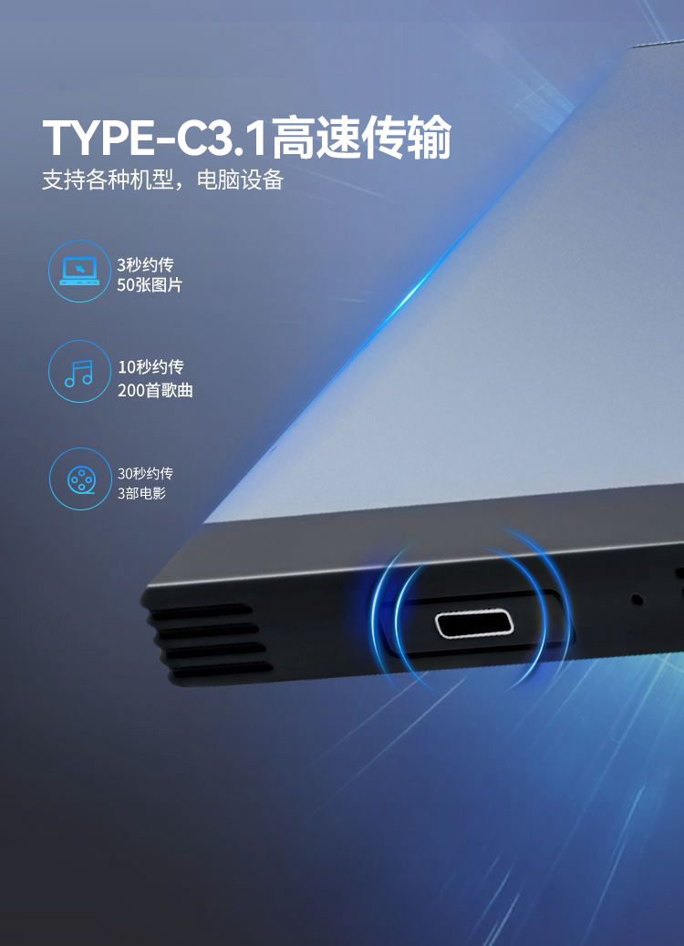 采用TypeC3.1接口 5Gbp/s高速传输 电镀金属效果,美观大气 专属礼盒包装,送礼佳品 专属订制,满足个性化服务 产品尺寸:130*80*13mm 包装尺寸:106*158*38mm 单品重量:159g