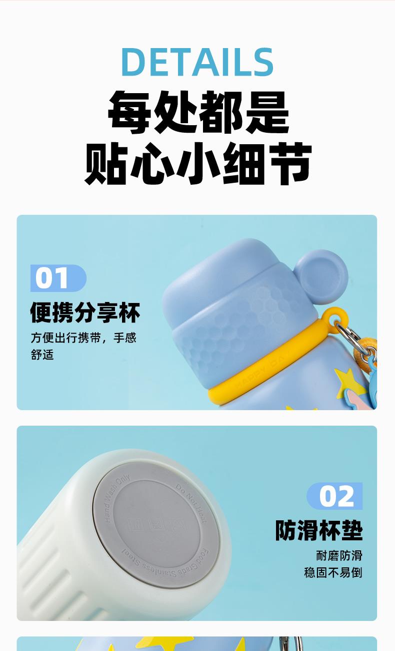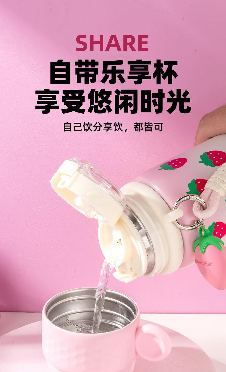 容量:480ml 彩盒尺寸:8..5*8.5*21.5cm 材质:PP、硅橡胶、不锈钢(食品接触用) 卖点: ①乐享三饮杯,酷饮全新定义 ②自带乐享杯享受悠闲时光,自己饮分享饮,都皆可 ③6层锁温设计,12小时长效保温 ④甄选健康材质SUS316不锈钢,不易腐蚀,耐高温,低温,易清洗 ⑤360°密封不漏水,出行无忧,每处都是贴心小细节
