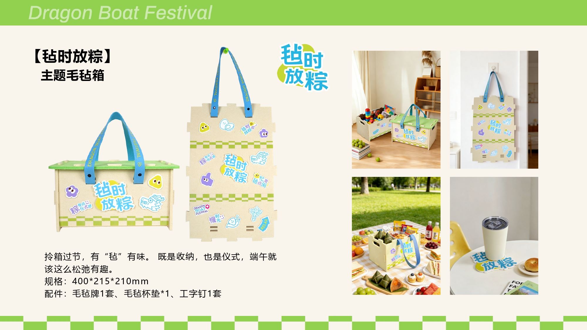 产品配置 毛毡收纳箱*1, (400*215*210mm) 养生壶小家电*1 毛毡配套*1,(毛毡牌、工字钉) DIY贴纸*1 真真老老粽子*2, (蛋黄鲜肉粽/红袍豆沙粽) 三宝咸鸭蛋*2