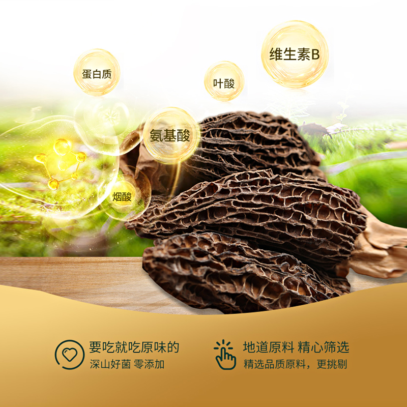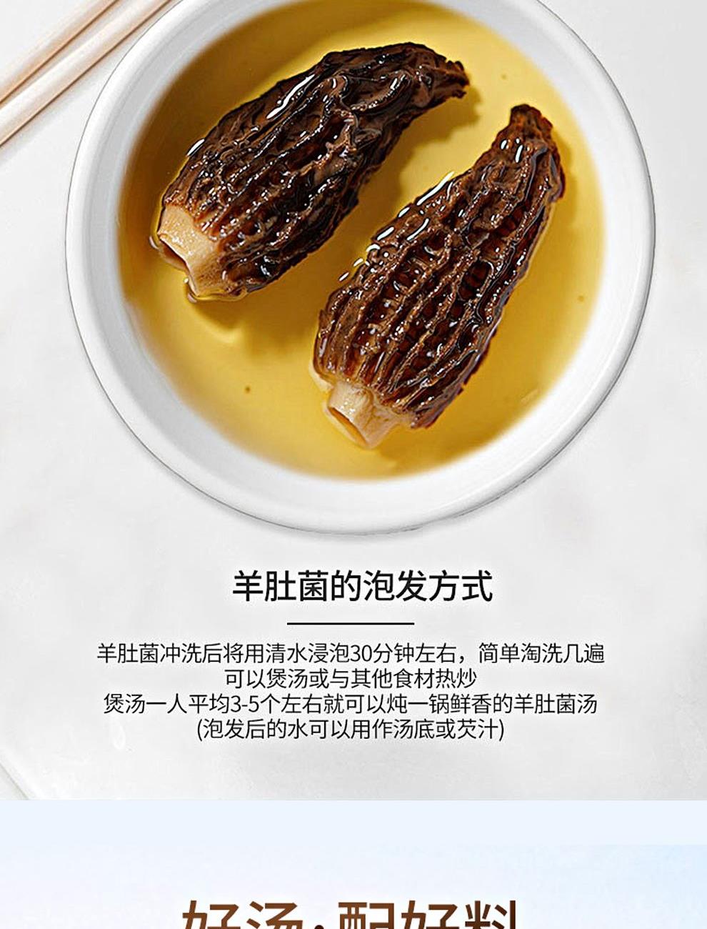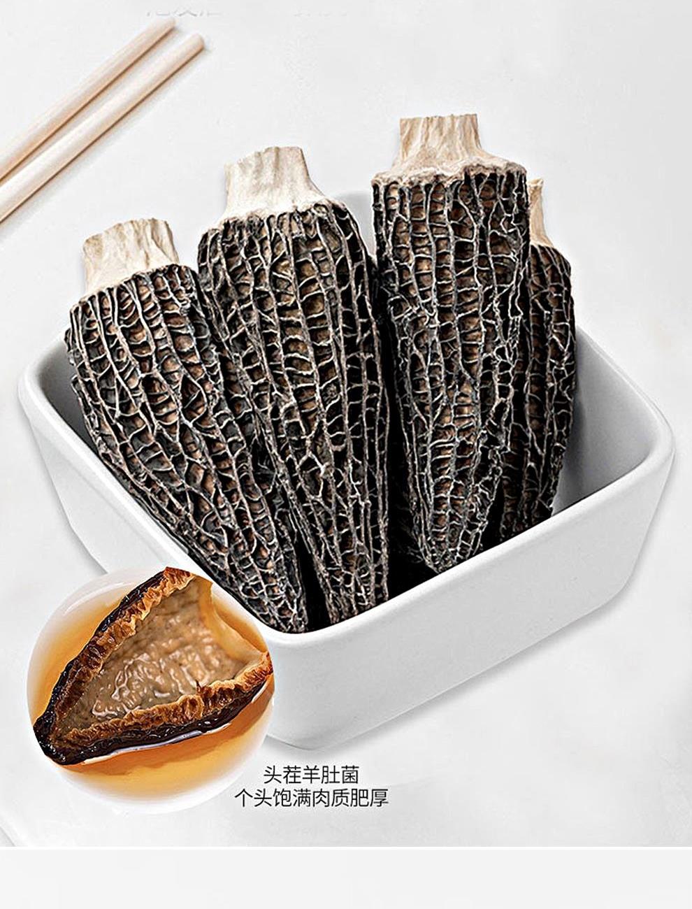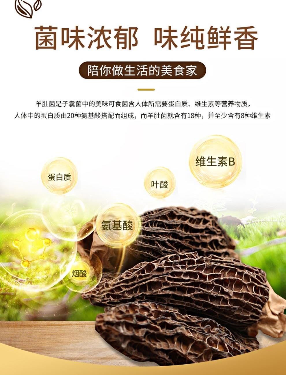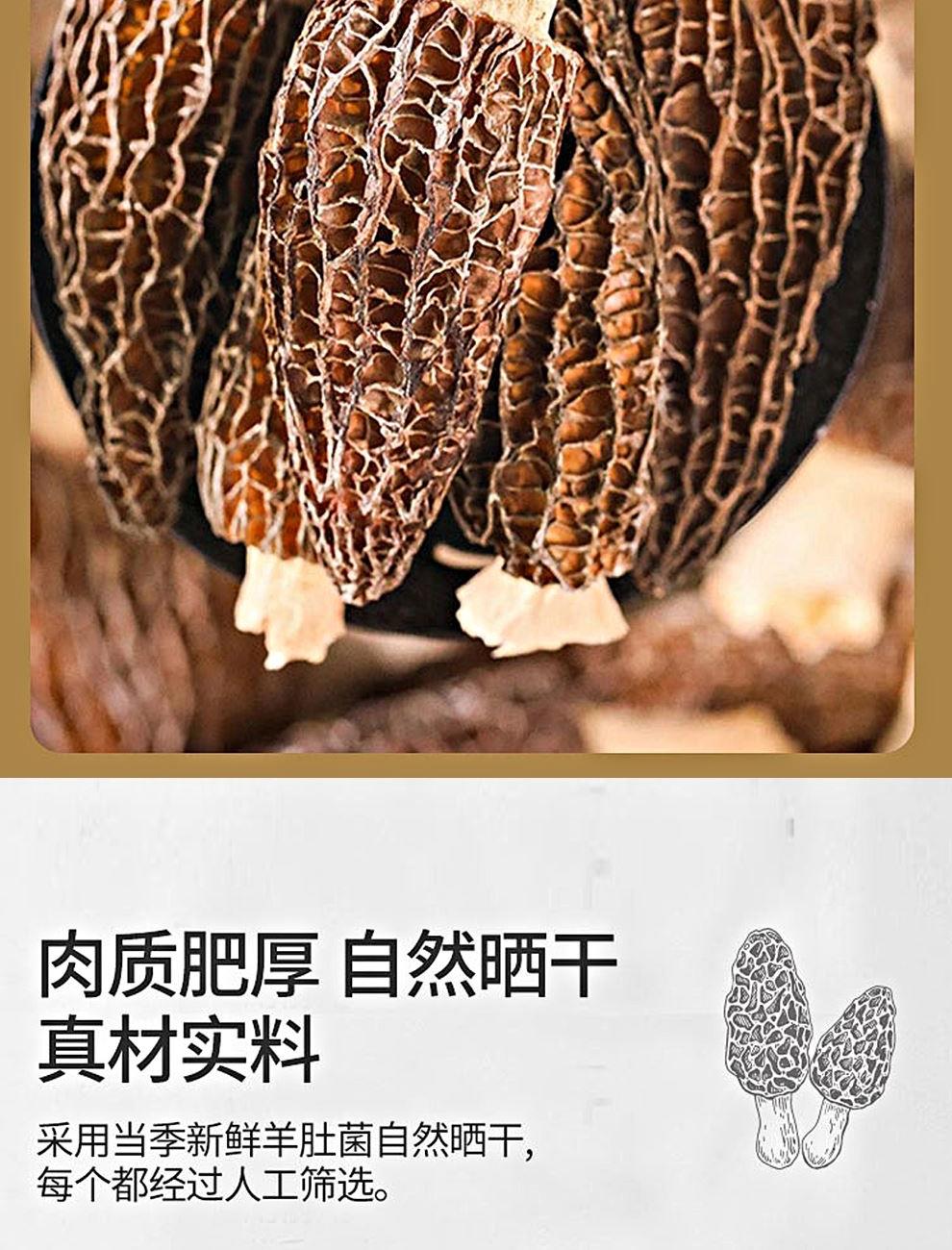 规格:100克 卖点: 自然产量有限:羊肚菌是一种菌类。在自然环境下,它的生长条件比较苛刻,需要特定的土壤、气候等条件,所以产量相对较低,这也使得羊肚菌在市场上比较珍贵。