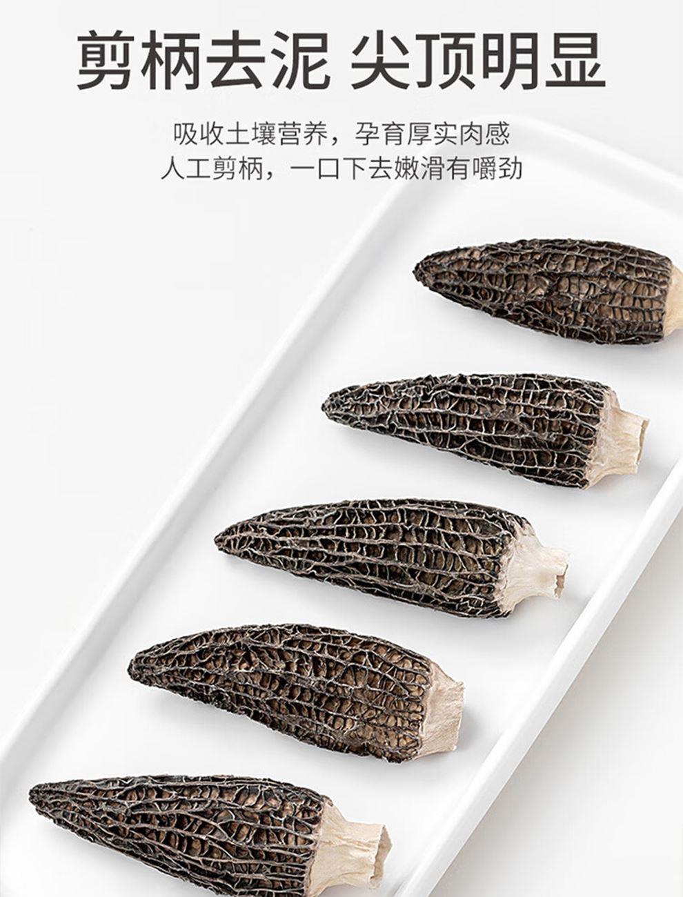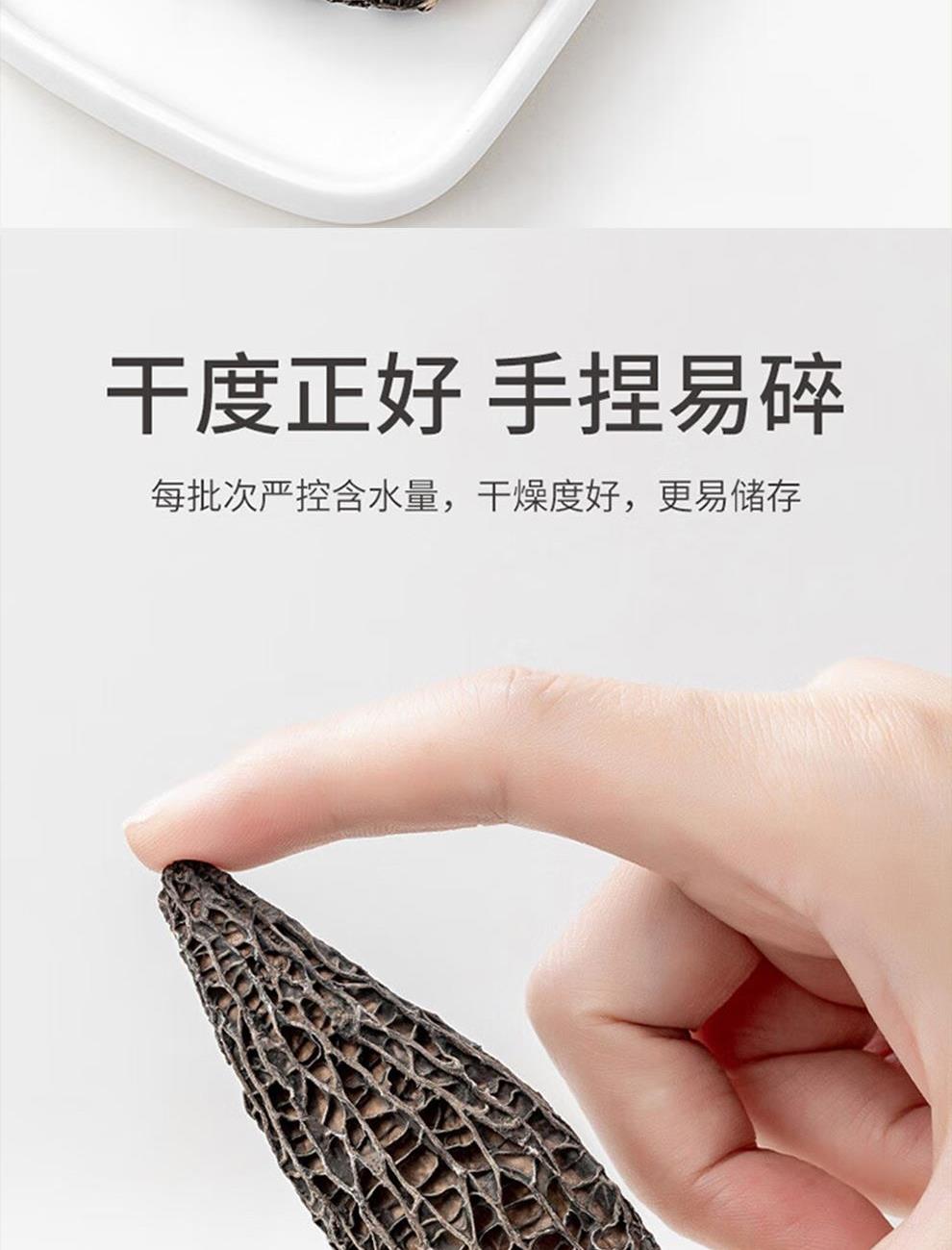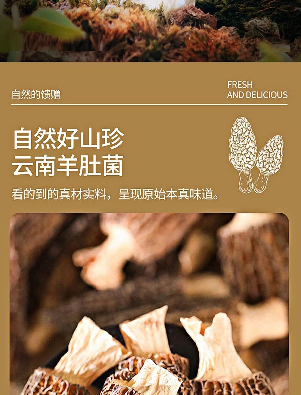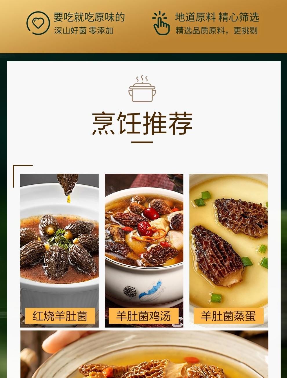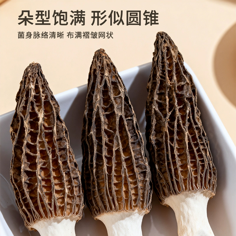 规格:100克 卖点: 自然产量有限:羊肚菌是一种菌类。在自然环境下,它的生长条件比较苛刻,需要特定的土壤、气候等条件,所以产量相对较低,这也使得羊肚菌在市场上比较珍贵。