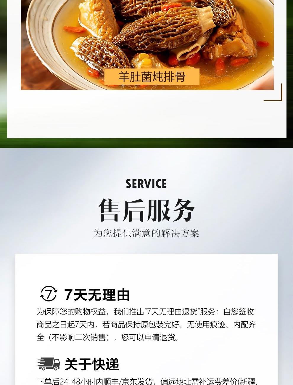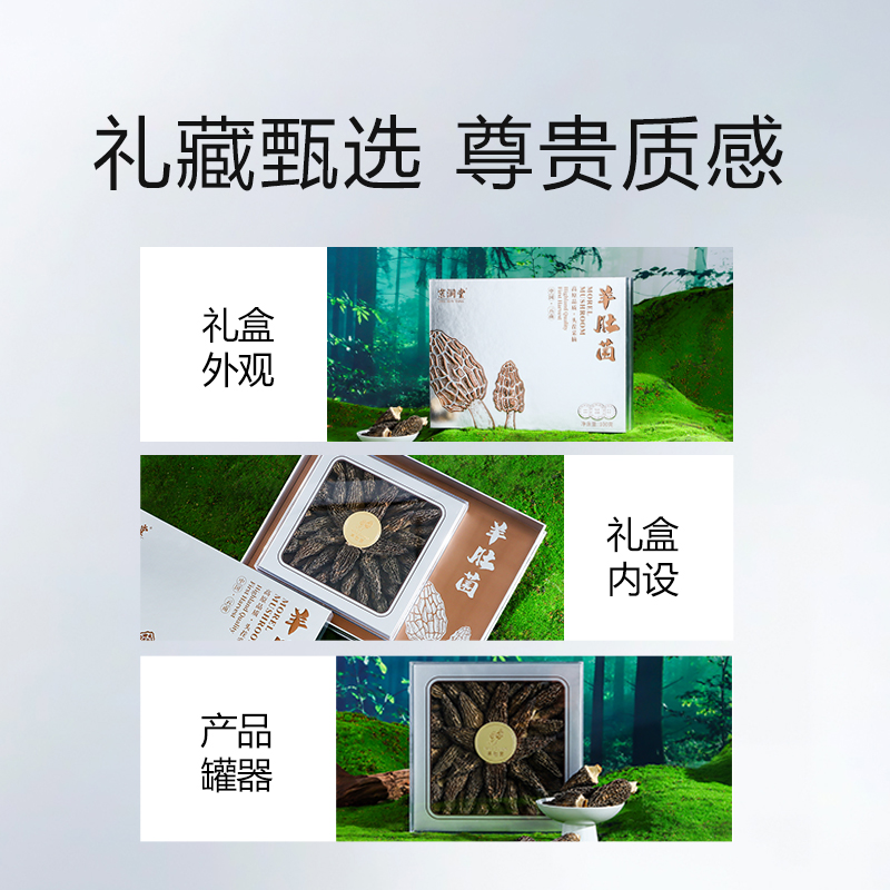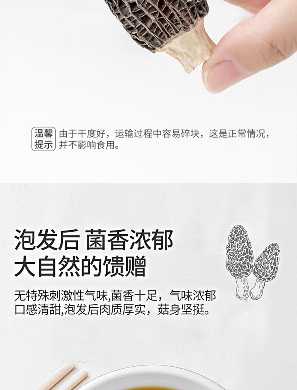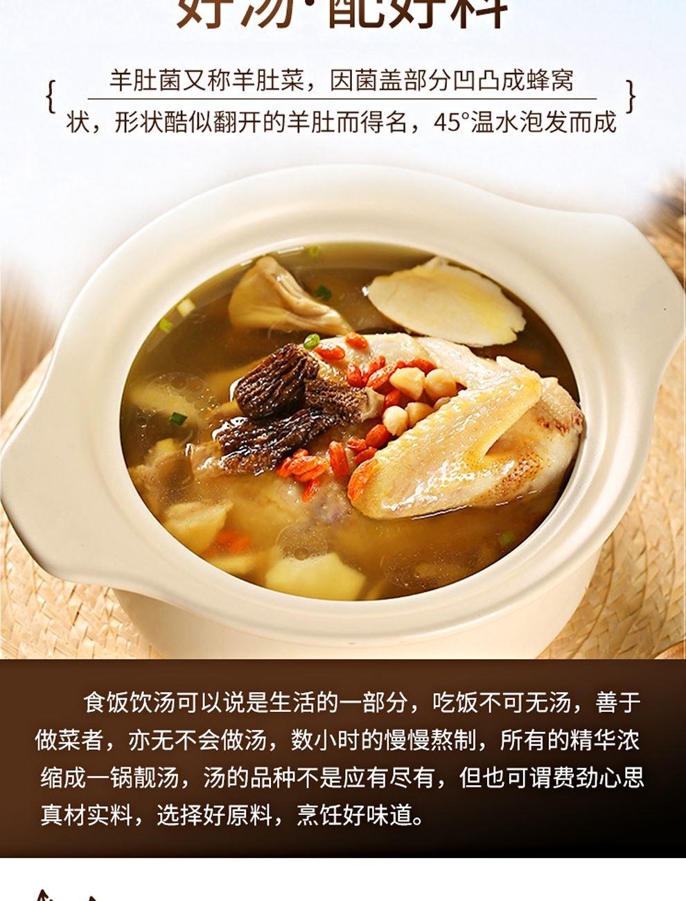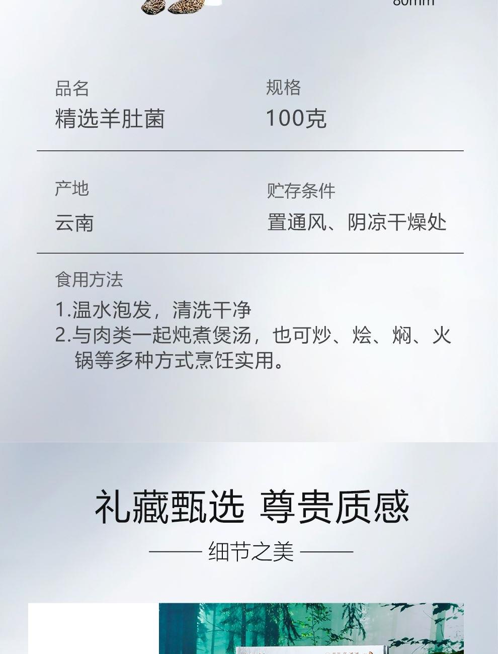规格:100克 卖点: 自然产量有限:羊肚菌是一种菌类。在自然环境下,它的生长条件比较苛刻,需要特定的土壤、气候等条件,所以产量相对较低,这也使得羊肚菌在市场上比较珍贵。