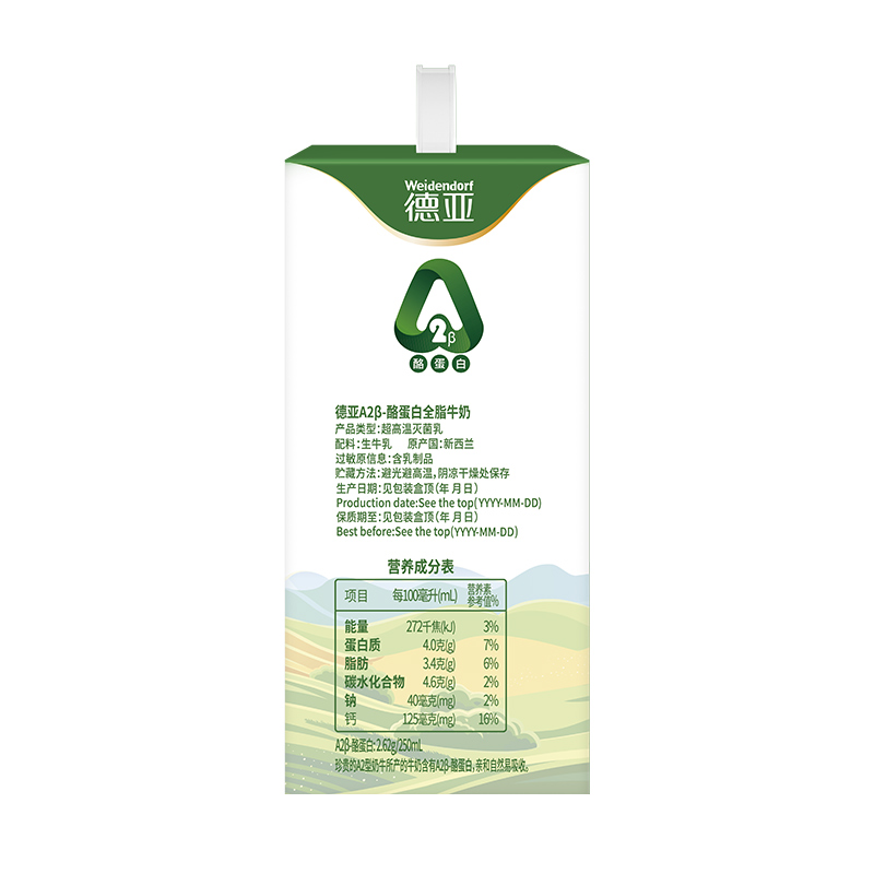 德亚A2B-酪蛋白全脂牛奶 配料:生牛乳原产国:新西兰 产品规格:250mlx10盒 保质期:12个月(365天)