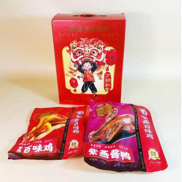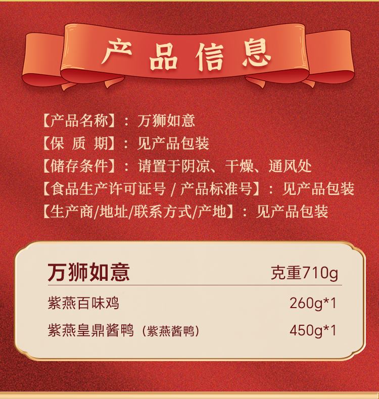 内容物配置: 紫燕百味鸡260g*1 紫燕皇鼎酱鸭(紫燕酱鸭)450g*1 万狮如意礼盒+组装+外盒