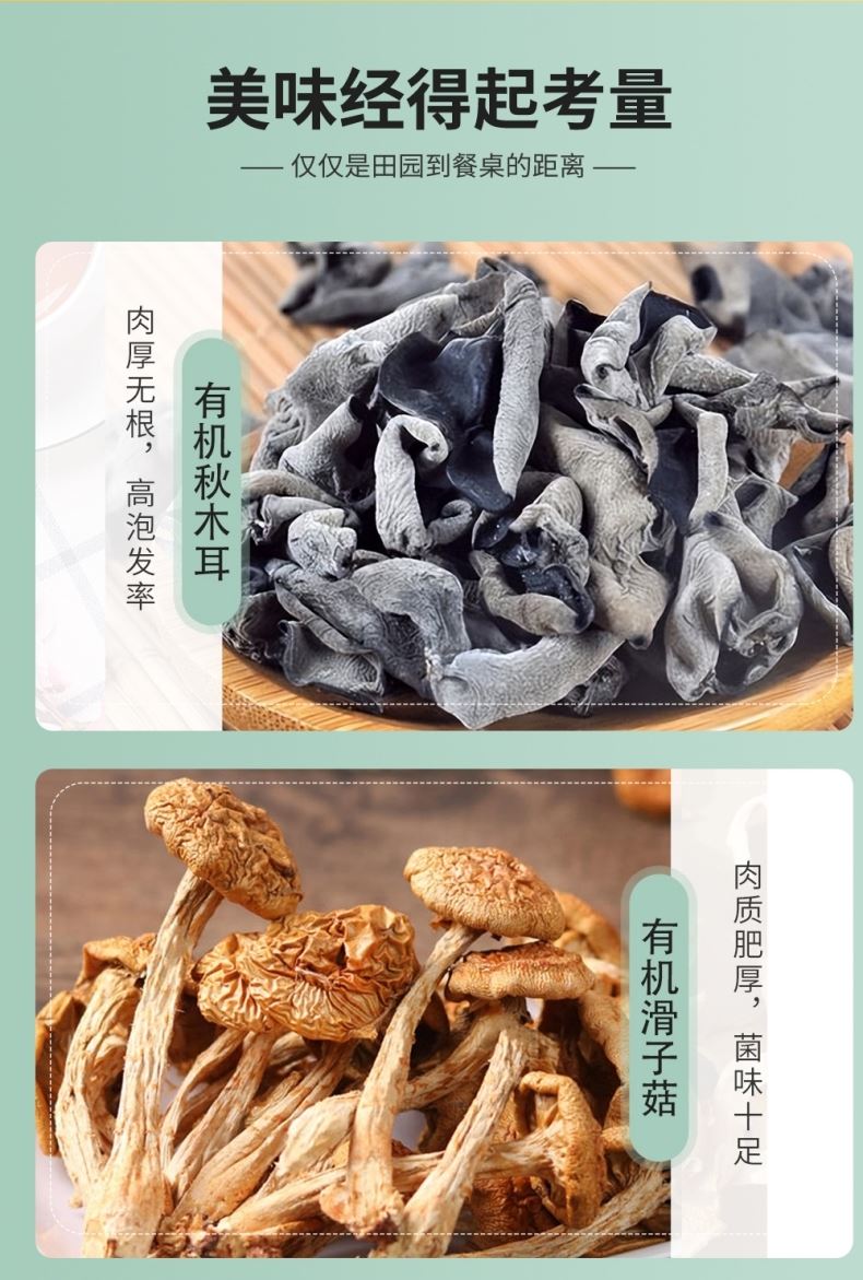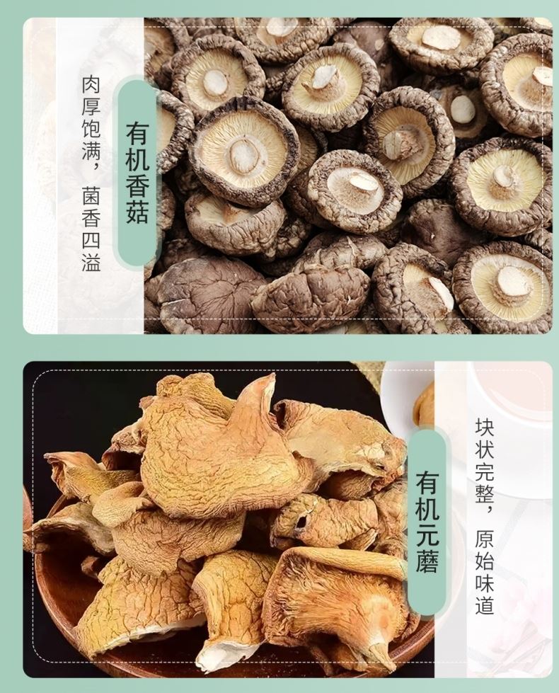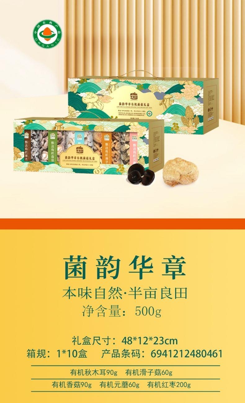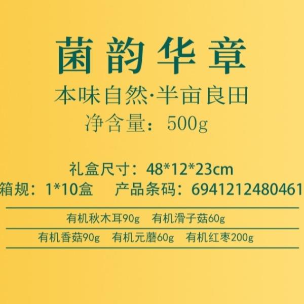 产品详情配置—罐装: 有机黑木耳90g 有机滑子菇60g 有 机 香 菇90g 有 机 元 蘑60g 有 机 红 枣200g 净含量:500g 礼盒尺寸:48*12*23cm 产品卖点: 半亩川菌韵华章有机山珍五种有机菌菇干货+有机红枣,山珍菌香浓郁,红枣肉厚核小,礼盒装荟萃自然精华,有机又健康。
