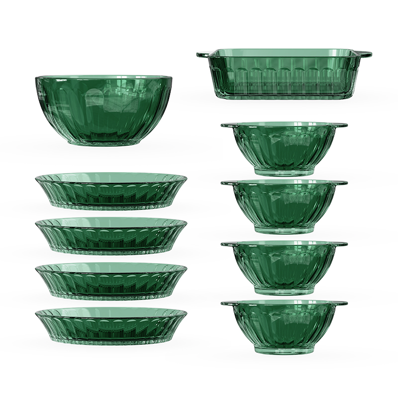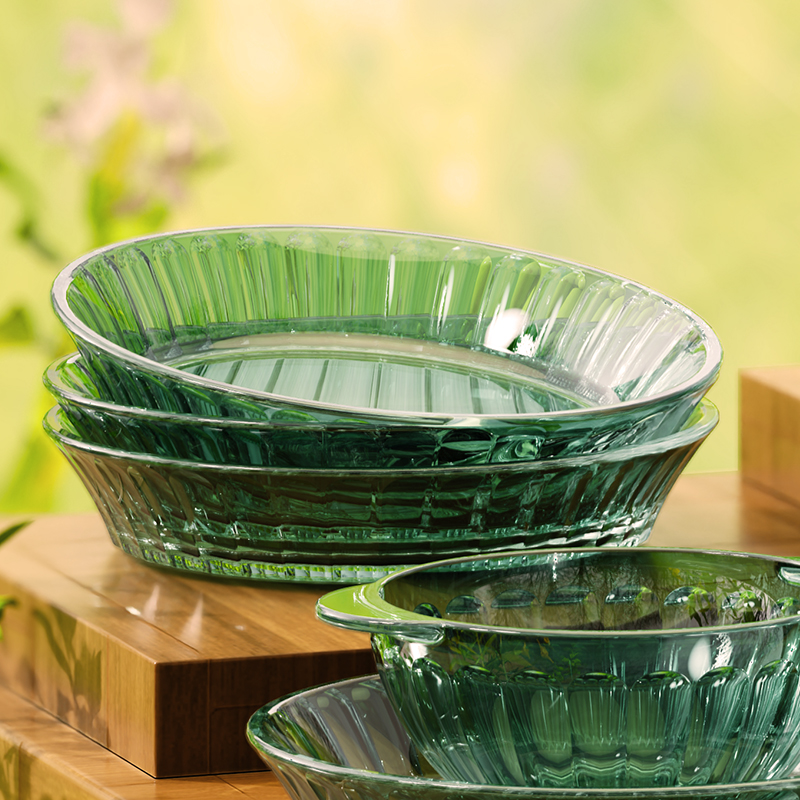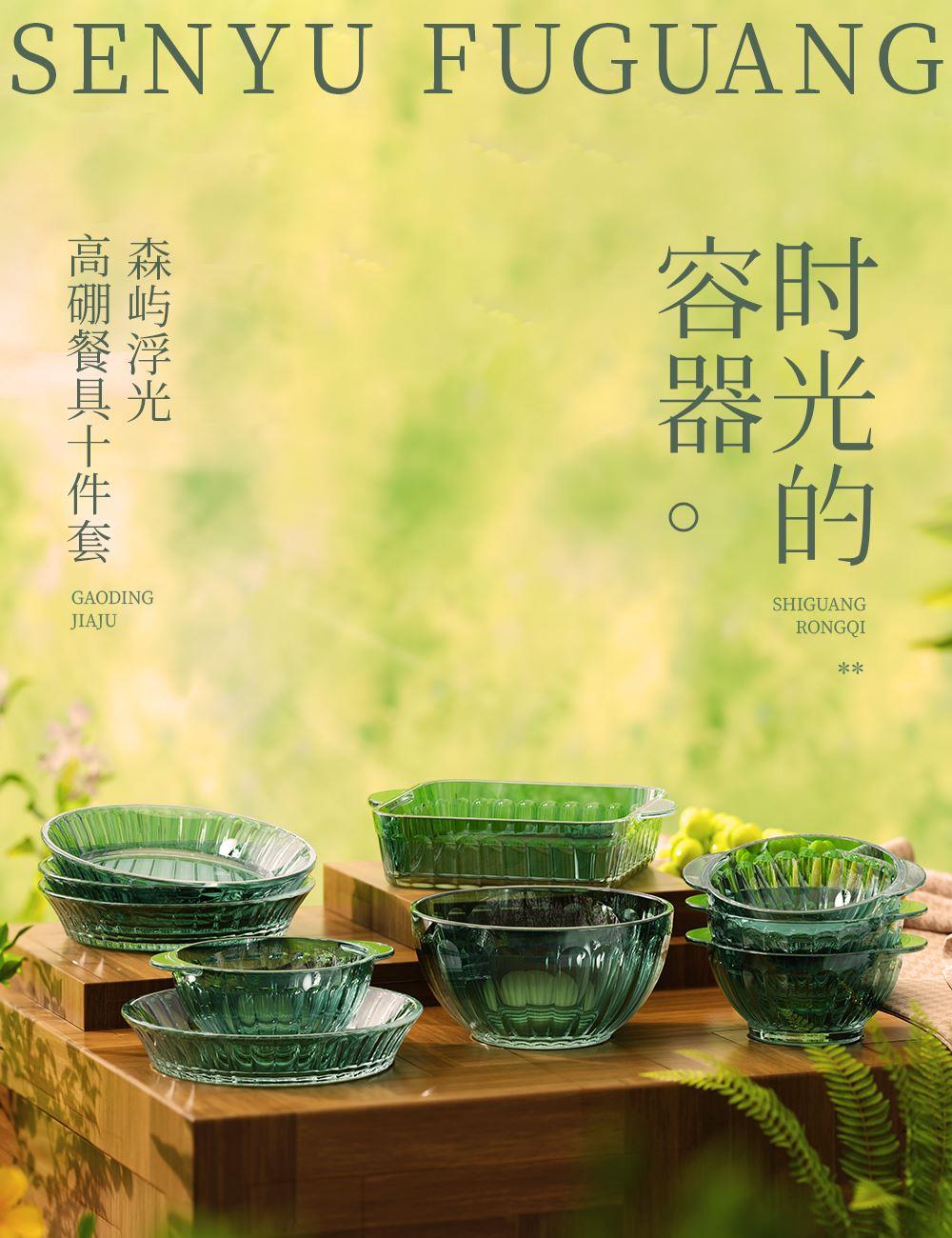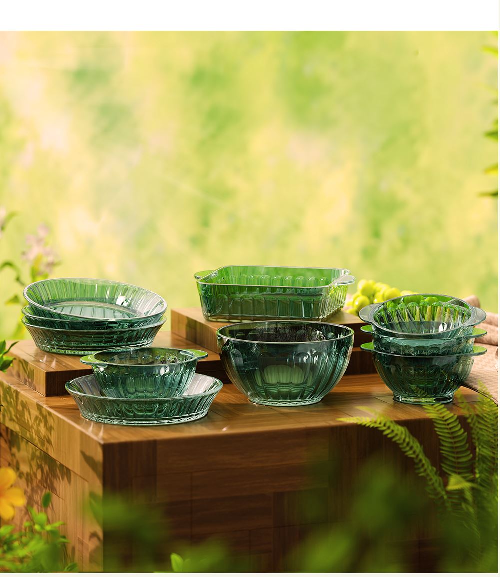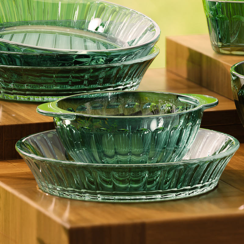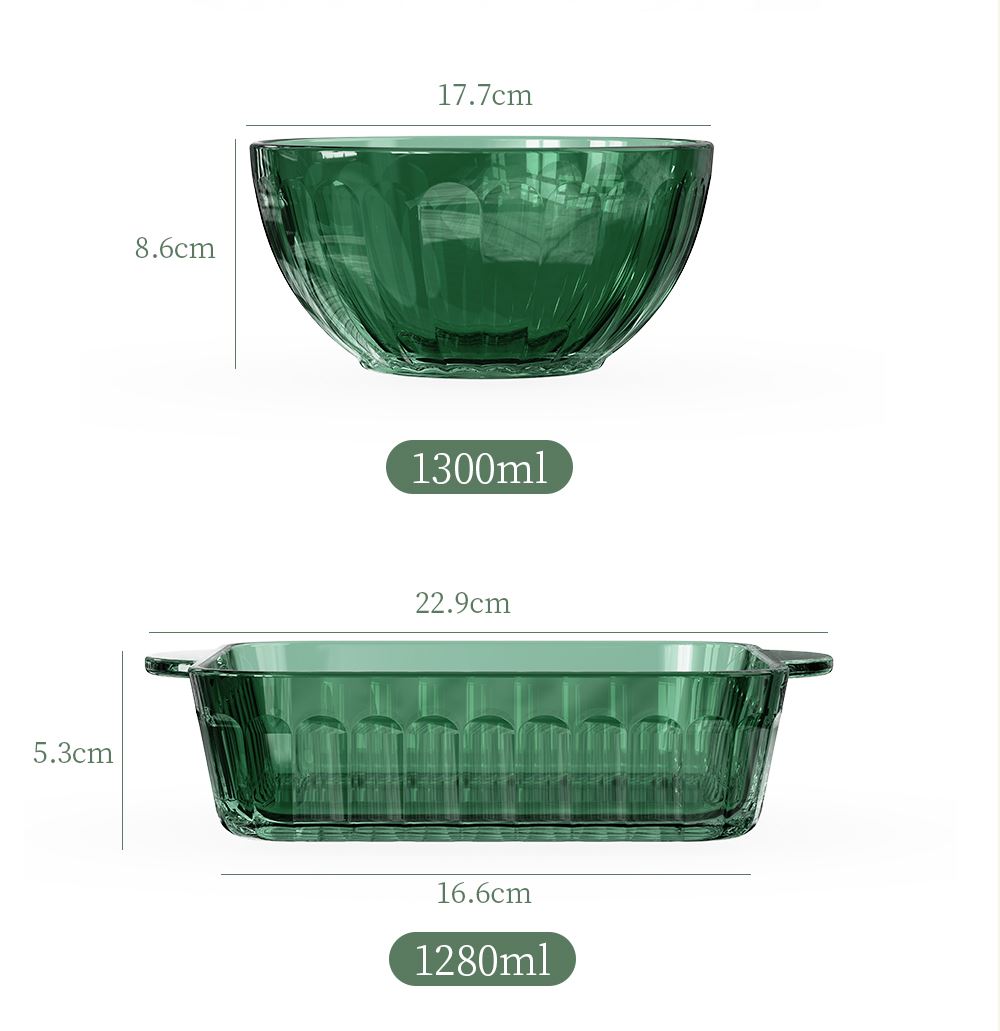 材 质:高硼色料玻璃 产品参数:小碗*4、盘子*4、大碗*1、烤盘*1 产品卖点:1.它是原色玻璃:不是表面涂层,杜绝铅镉等重金属析出。 2.它是高硼硅材质:能从冰箱直接进烤箱,不炸裂,不娇气。 3.它是顶配厚度:竖纹肌理,重工加厚,手感无与伦比。 只服务懂行、追求极 致生活品质的客户。礼盒发售中,详情私信。