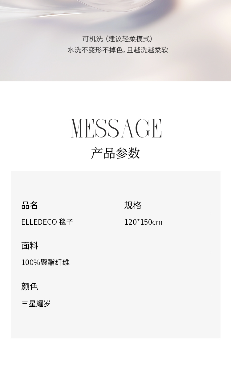 商品参数: 面料:100聚酯纤维 规格:120*150cm 毛重:1.21kg 礼盒尺寸:42.5*35*11cm 纸箱尺寸:55.5*42.5*36.5cm
