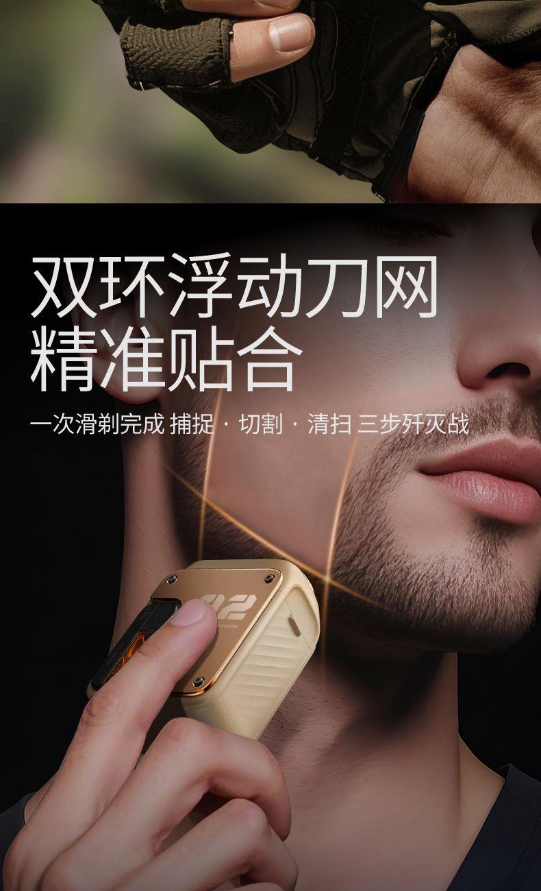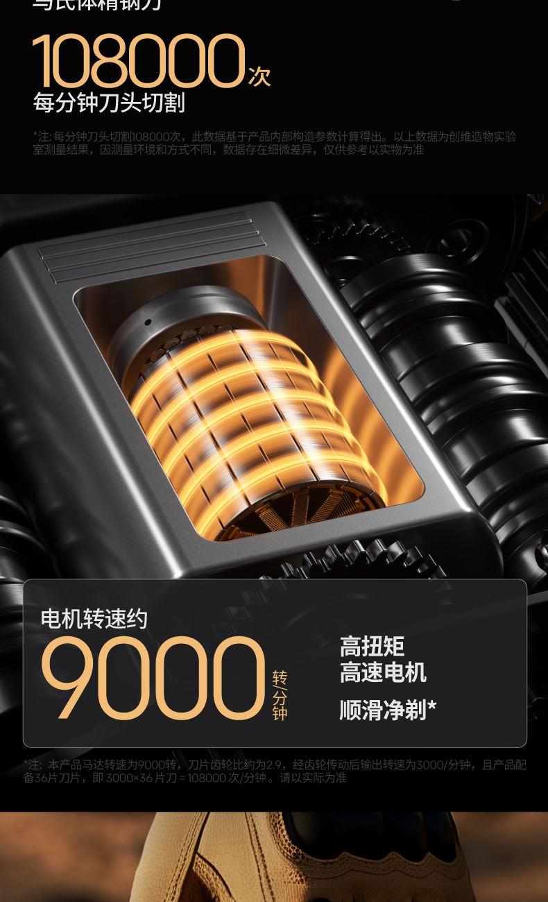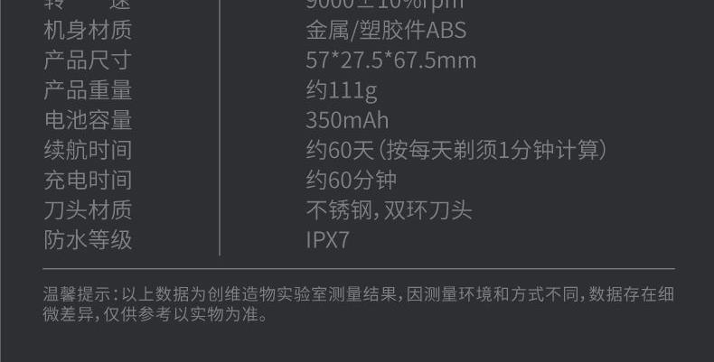 1、无线耳机盒大小,设计精致小巧,超高颜值; 2、18道精工电镀,够亮够潮; 3、6000转高速静噪电机,够性能才够快; 4、15片马氏精钢刀, 弧面刀网,顺滑贴肤,干湿两剃; 5、IPX7级防水等级,可全身水洗;