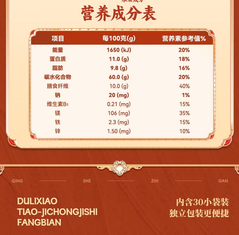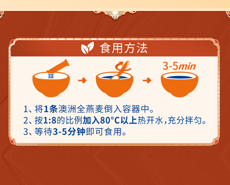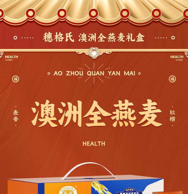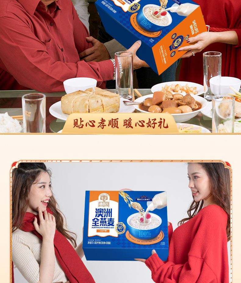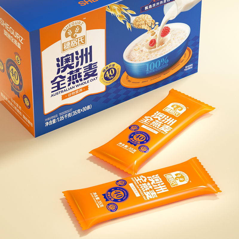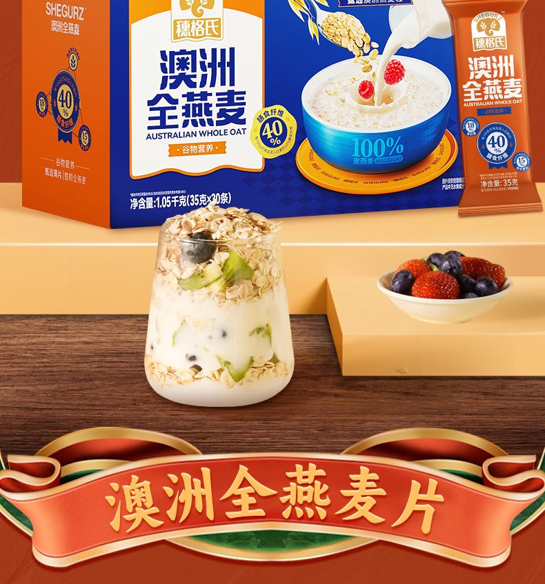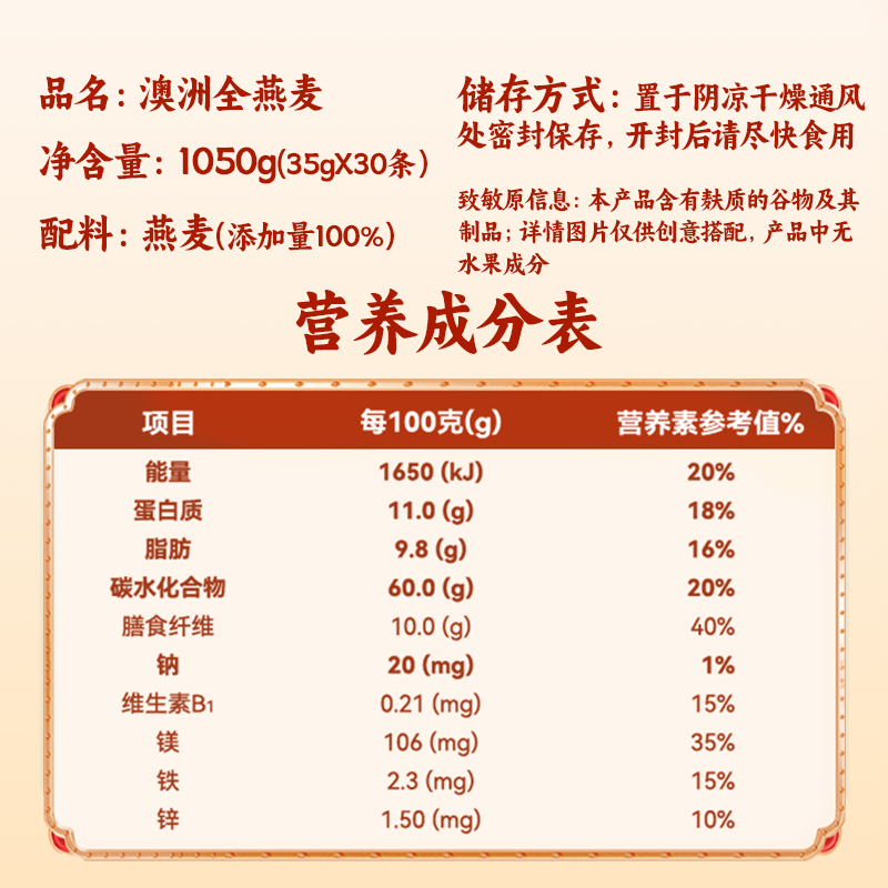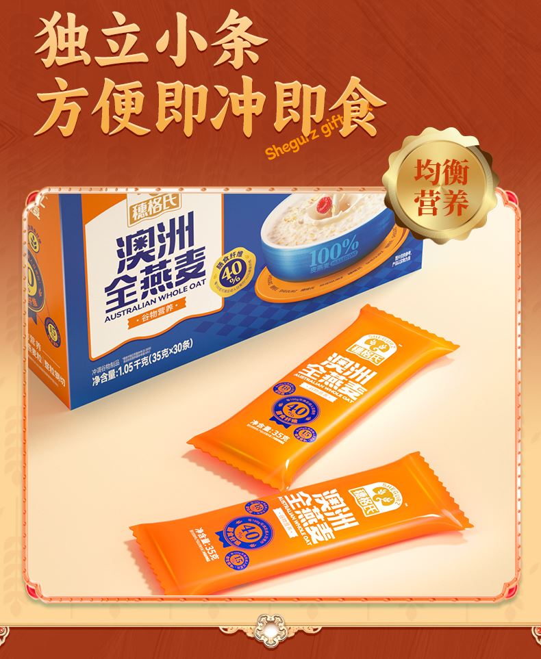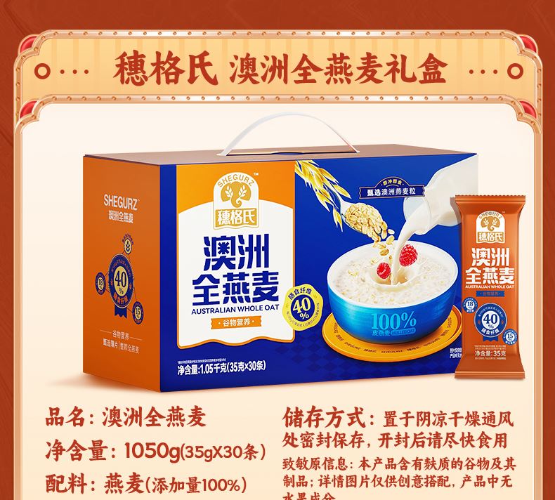 穗格氏澳洲全燕麦礼盒1.05kg(35g*30条) 配料表:燕麦片。 产品卖点: 1,全谷物,保留麸皮,胚芽,胚乳。 2,精美礼盒 3,小条装,一顿一条,饱腹感。