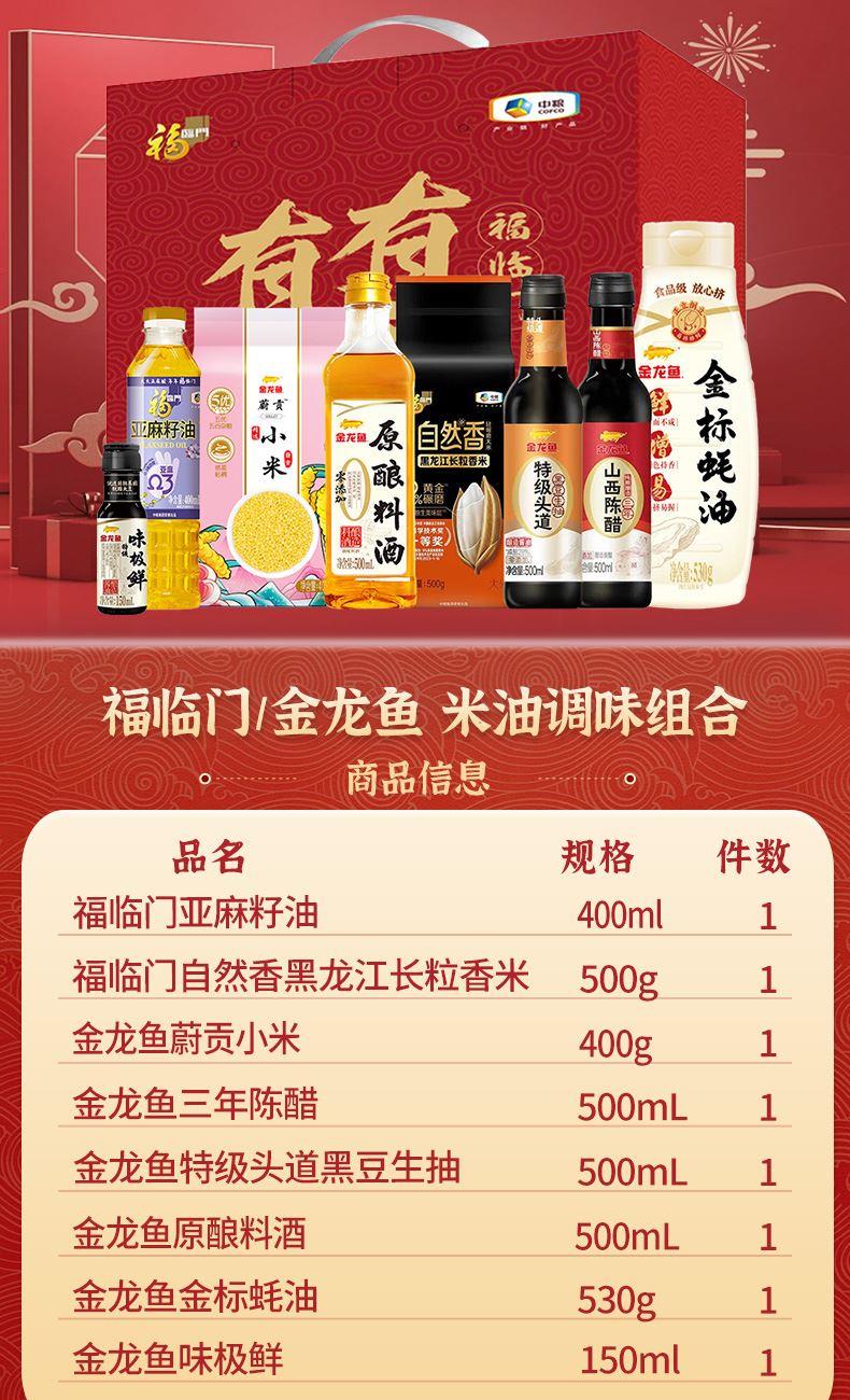 净含量:2030g+2050ml 配置组合: 福临门亚麻籽油400ml*1瓶 福临门自然香黑龙江长粒香米500g*1袋 金龙鱼爱心桃花小米400g*1袋 金龙鱼三年陈醋500ml*1瓶 金龙鱼特级头道黑豆生抽500mL*1瓶 金龙鱼原酿料酒500mL*1瓶 金龙鱼蚝油530g*1瓶 金龙鱼味极鲜150ml*1瓶 福临门有礼有节包装盒*1个 (尺寸320mm*110mm*240mm)