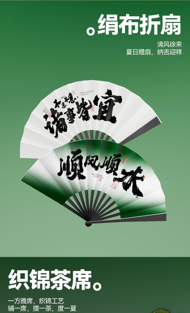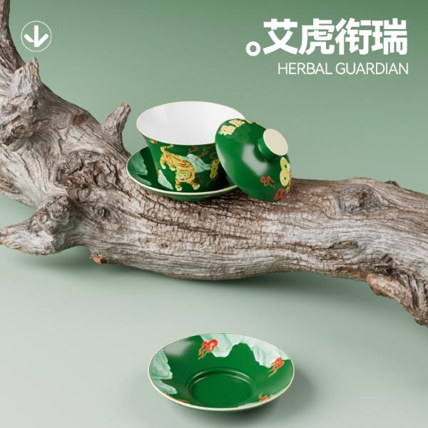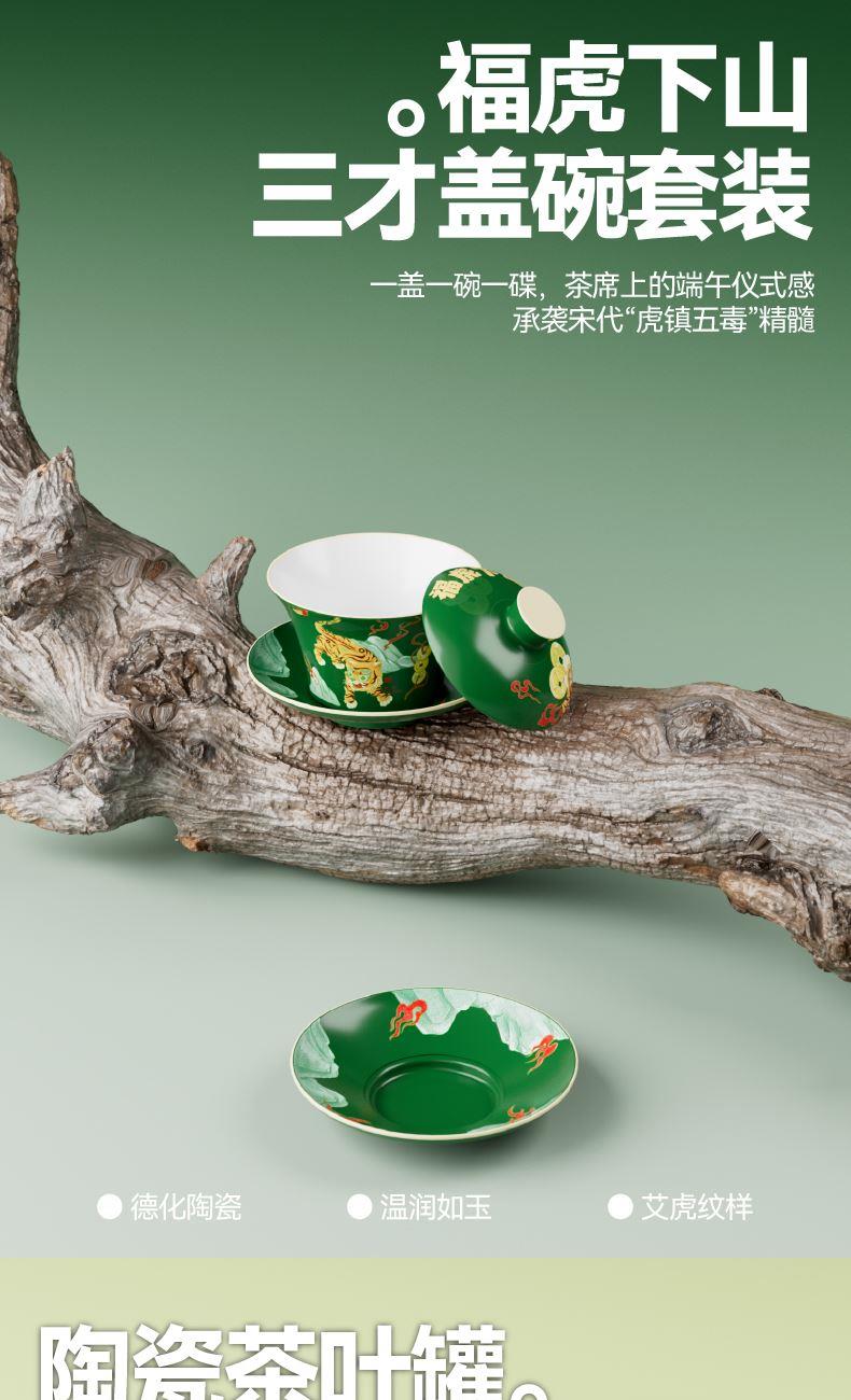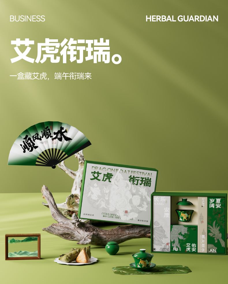 五月五日午,天师骑艾虎 千年端午习俗中,艾虎乃驱邪镇祟之神兽 古时百姓以艾草扎虎、剪纸为形,悬于门楣 祈愿"艾虎镇五毒,百病不侵身" 本礼盒以"艾虎衔瑞"为题,承袭宋代"虎镇五毒"纹样之精髓 融天师骑艾虎之神威,将端午禳灾纳吉的仪式感,凝练为一方雅致器物 寄寓"衔瑞纳福,岁岁安康"之愿 内配: 配置一:礼盒&手袋x1 配置二:荃盛·粽子x4 配置三:福虎下山·三才盖碗套装X1 配置四:陶瓷茶叶罐X1 配置五:绢布折扇(带扇套)X1 配置六:织锦茶席X1 配置七:流沙艺术摆件x1 配置八:贺卡x1