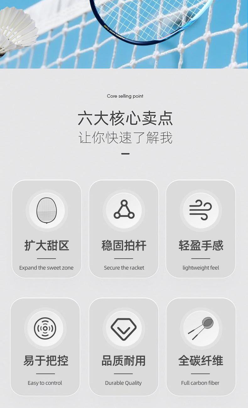 球拍长度:675+1MM 球拍重量:78+2g 拍柄尺寸:G6 承受磅数:18-30LBS 产品净重:0.38kg 产品毛重:0.45kg 平衡点:298±mm 拍框材质:碳素纤维 材质:碳素纤维 中杆硬度:适中 产品尺寸:71*2*23cm 包装尺寸:75cm*7cm*27cm 1.碳素纤维材质拍框,轻盈便捷 2.平衡点适中,从容接球,攻守兼备 3.立体破风框,减小风阻的 4.一体成型中框,强韧有力 5.反应速度快,打感更轻弹