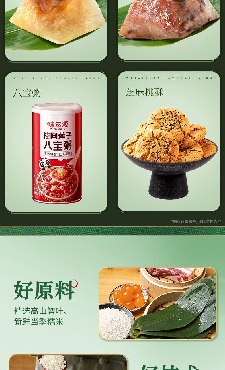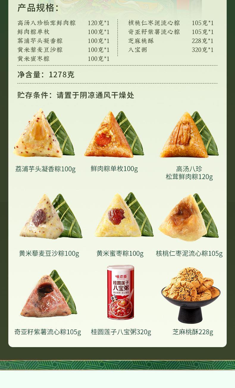 味滋源 高汤八珍松茸鲜肉粽120g 味滋源 鲜肉粽单枚100g 味滋源 荔浦芋头凝香粽100g 味滋源 黄米藜麦豆沙粽100g 味滋源 黄米蜜枣粽 100g 味滋源 核桃仁枣泥流心粽105g 味滋源 奇亚籽紫薯流心粽105g 味滋源 芝麻桃酥228g 味滋源 八宝粥320g