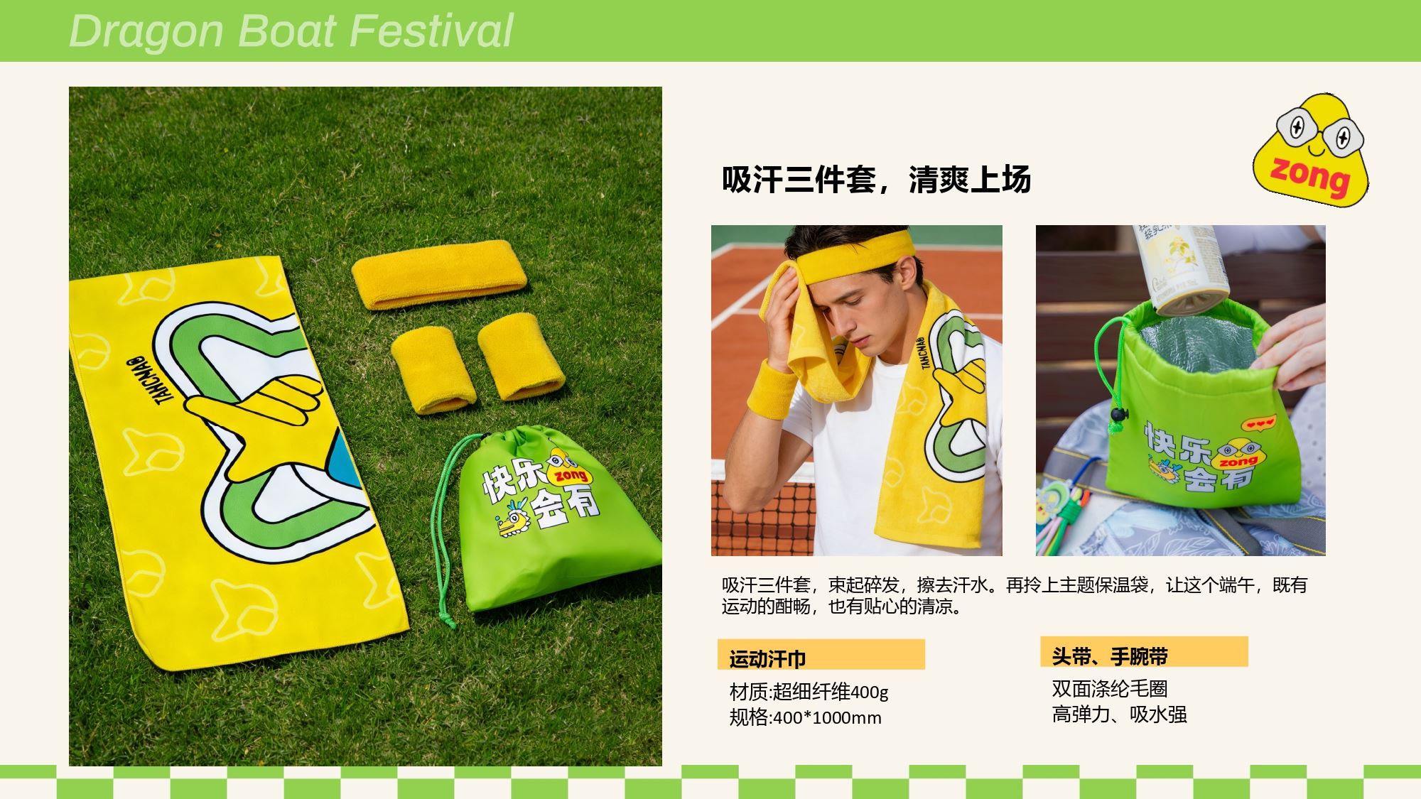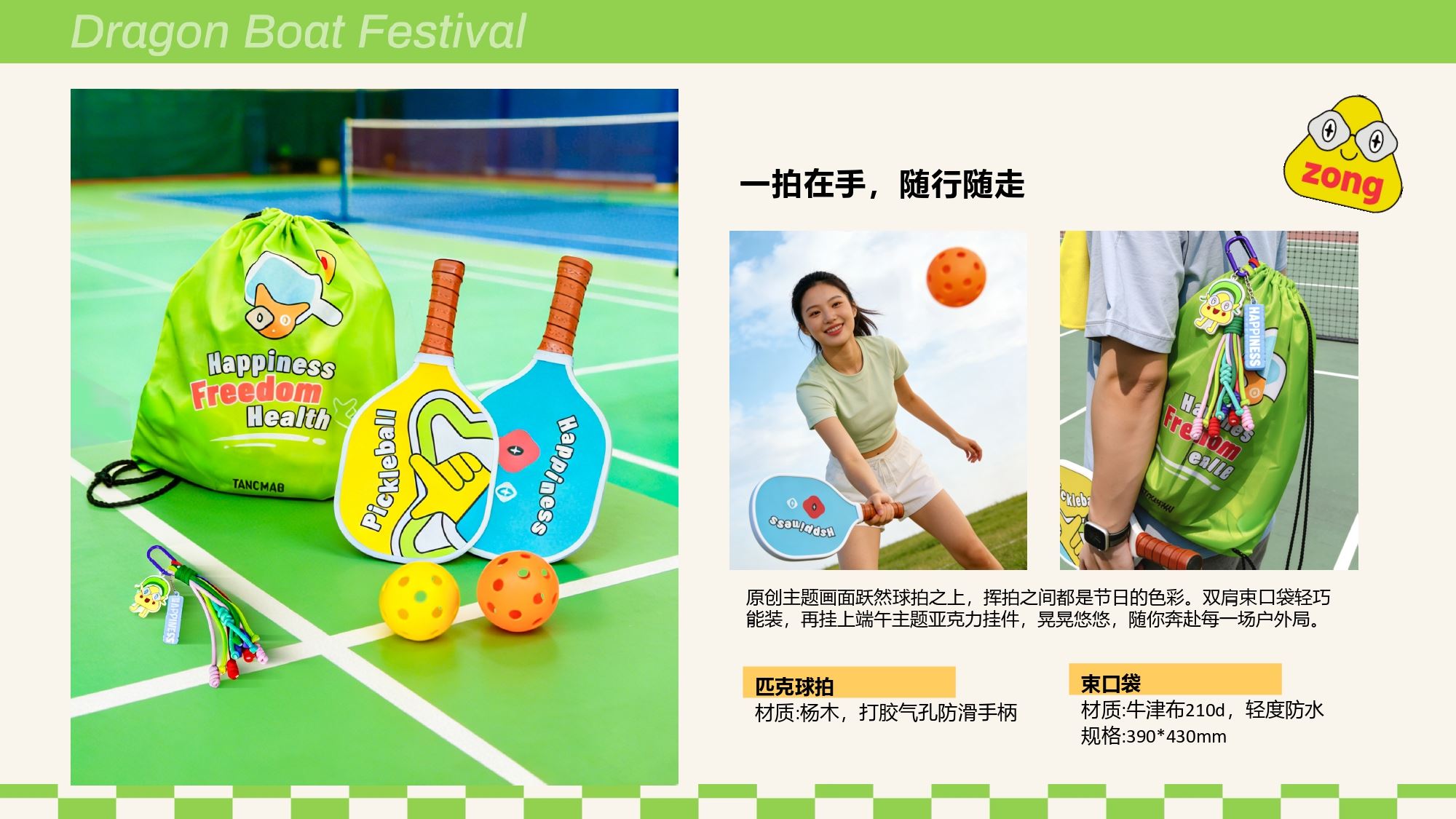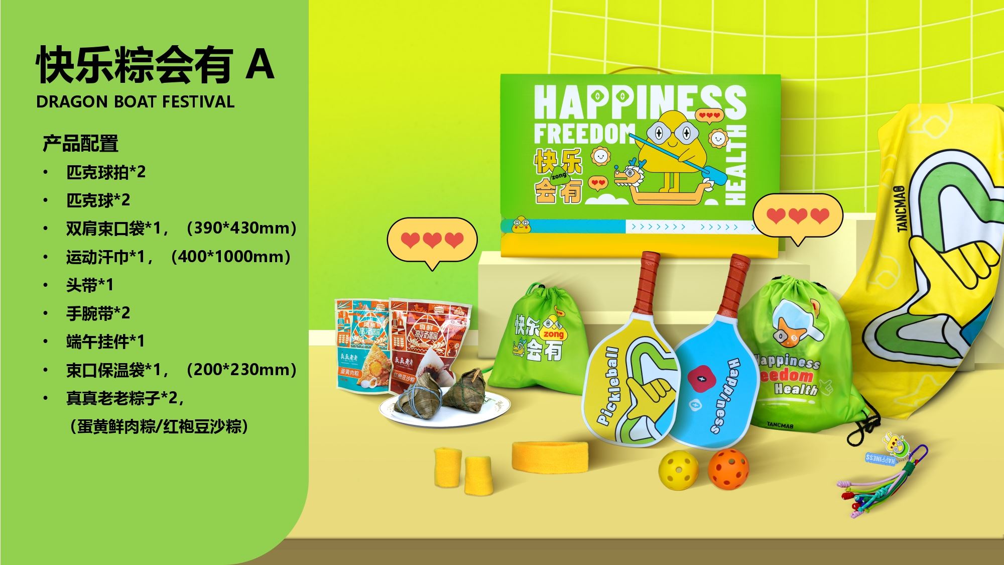 产品配置 匹克球拍*2 匹克球*2 双肩束口袋*1,(390*430mm) 运动汗巾*1,(400*1000mm) 头带*1 手腕带*2 端午挂件*1 束口保温袋*1,(200*230mm) 真真老老粽子*2, (蛋黄鲜肉粽/红袍豆沙粽)