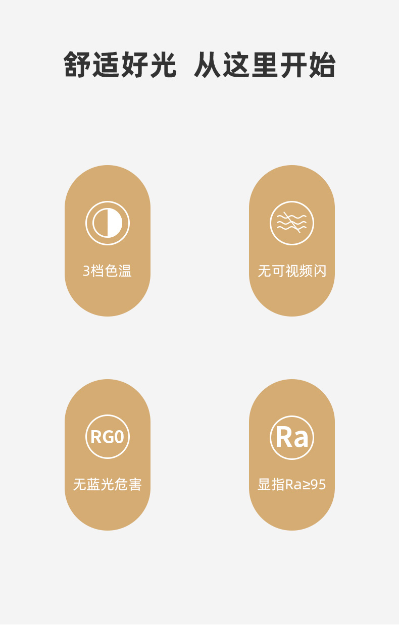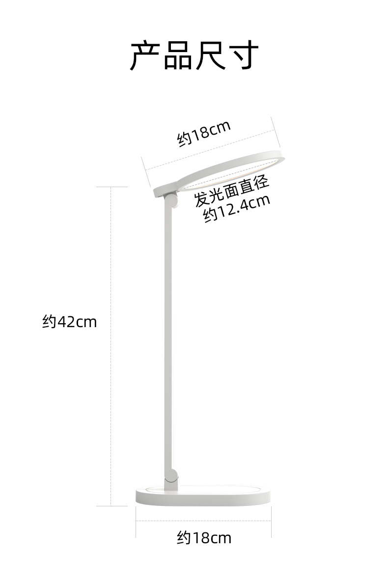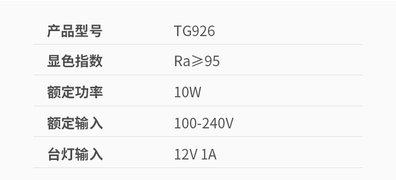 产品型号:TG926 显指:Ra≥95 功率10W 额度输入:100-240V 台灯输入:12V 1A 材质:ABS塑料 外包尺寸:17*6*45cm 产品尺寸:18*18*42cm展开尺寸 毛重:0.85kg 舒适好光 从这里开始 足够明亮覆盖宽广的有效照明区 CCC认证RG0无蓝光危害 无可视频闪 用眼更轻松 显色指数Ra>95所见即精彩 一体化面板设计