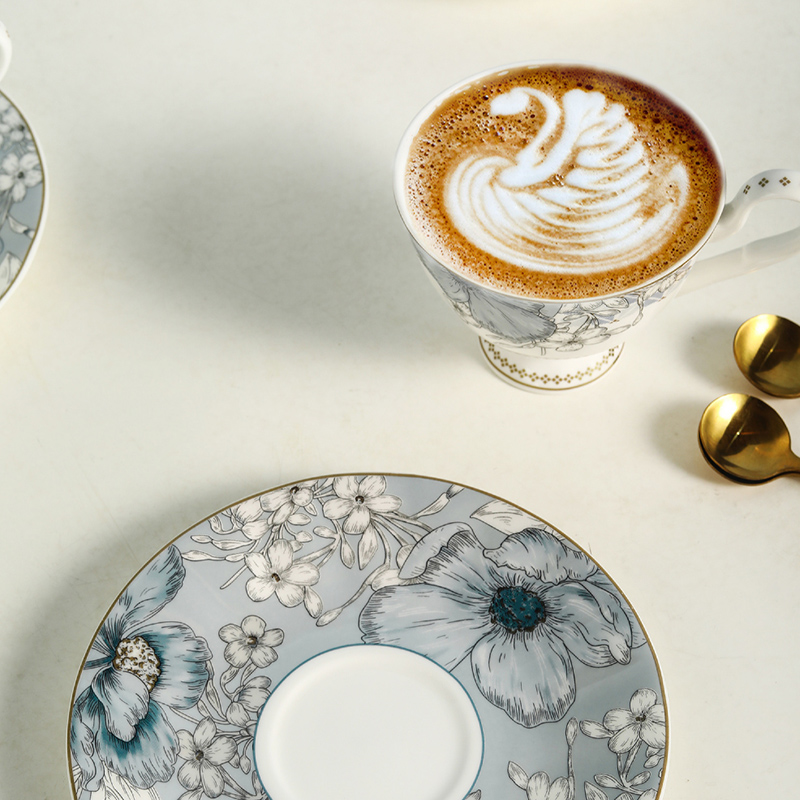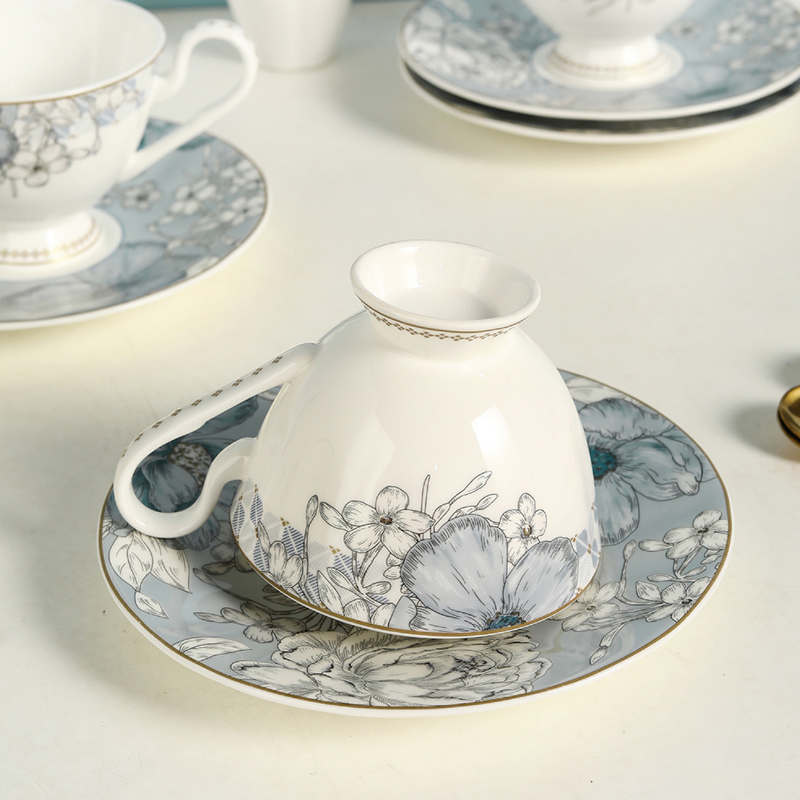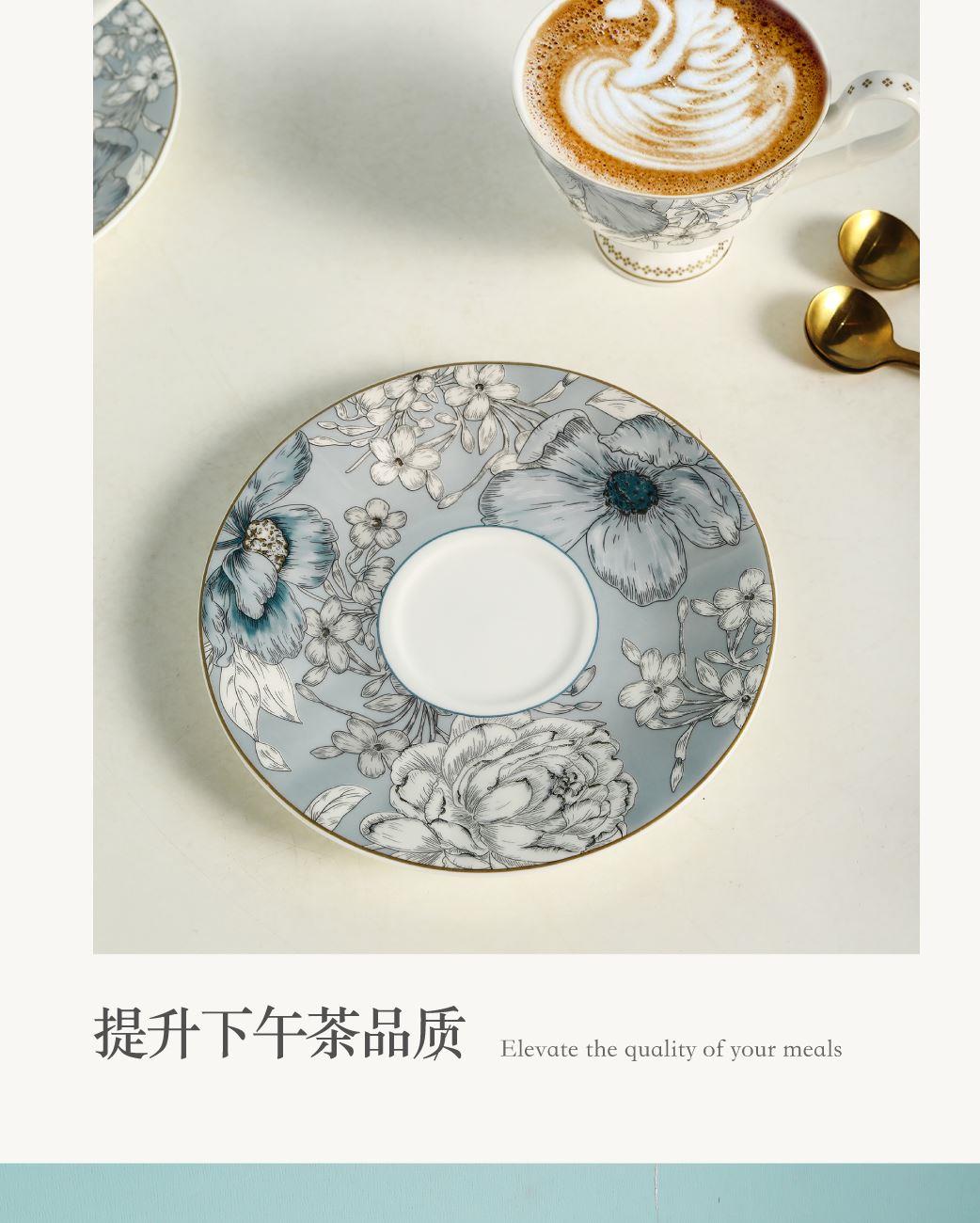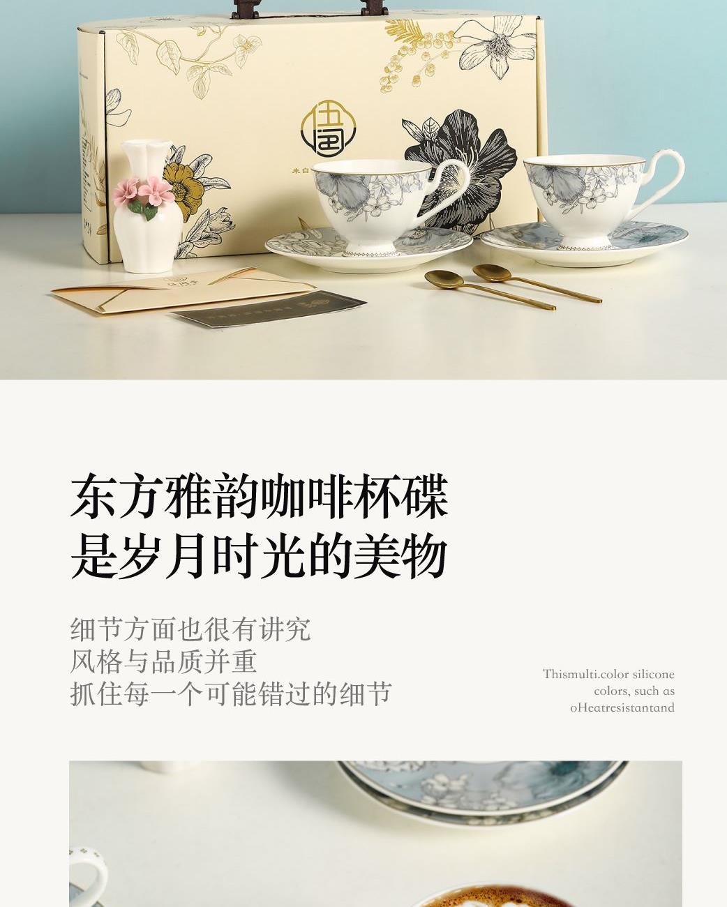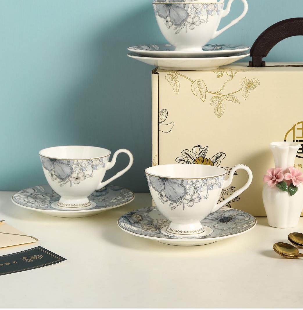 产品组成:茶咖杯4、碟子4、花瓶1、勺子4 产品材质:高骨瓷 产品工艺:贴花+描金 包装尺寸:42*12*25cm 外箱尺寸:43*37*27.5cm