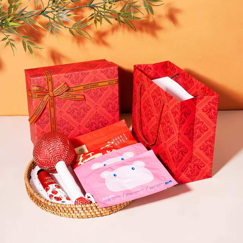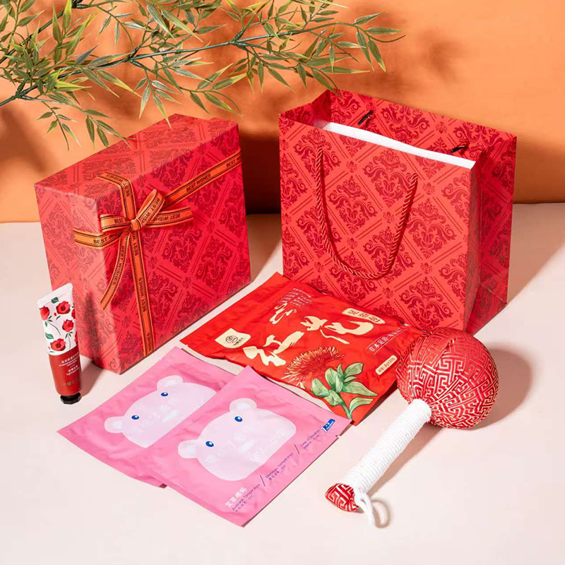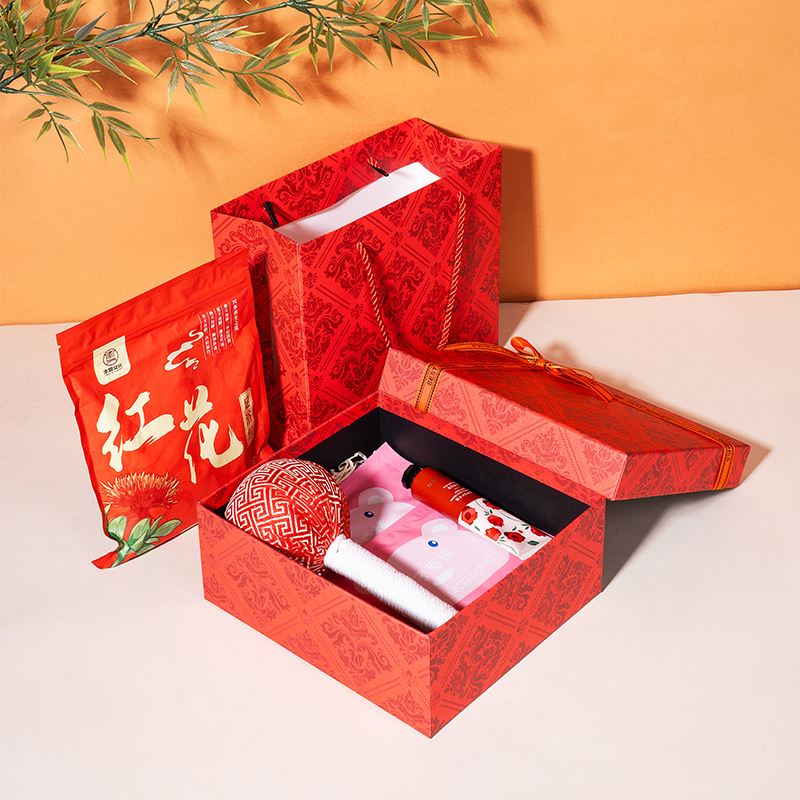1、中国红喜庆国潮风礼盒,搭配同风格手提袋,大气有质感,适合商务、福利、礼赠等各渠道。