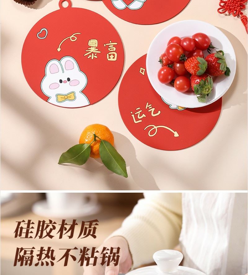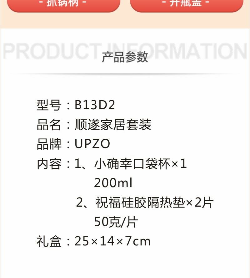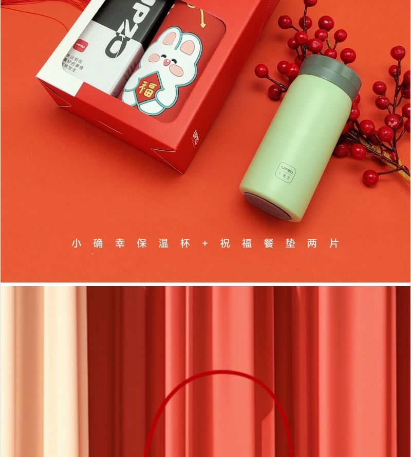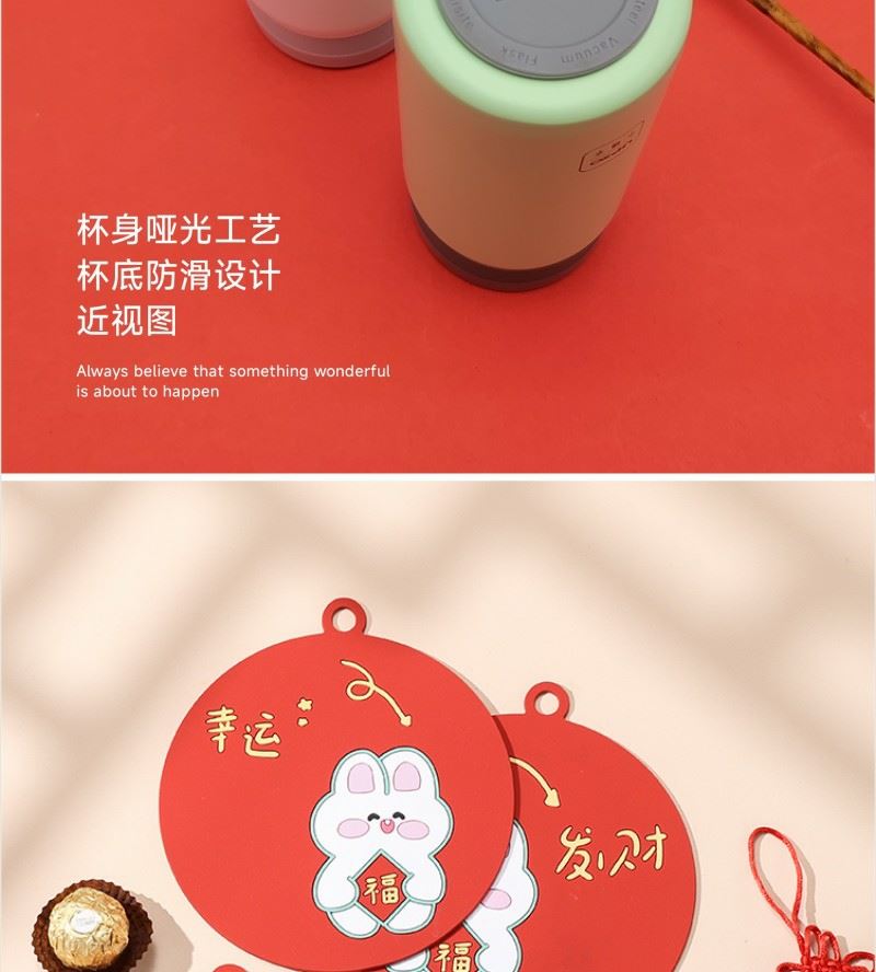 型号: B13D2 产品内容 1、 祝福硅胶隔热垫×2片 单片尺寸15*15*0.3CM 每片50克 2、 小确幸口袋杯×1 304内胆 PP杯盖 200毫升容量 外盒: 25×14×7cm 小确幸主题杯 设计融入祝福语 产品撞色搭配 时尚美观 餐垫结合祝福语言 搭配小兔送福 软胶材质 性能出众