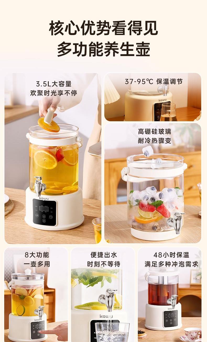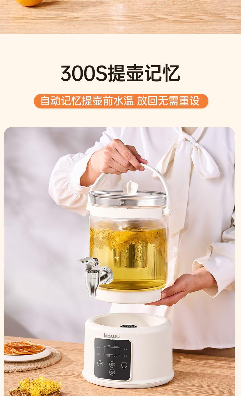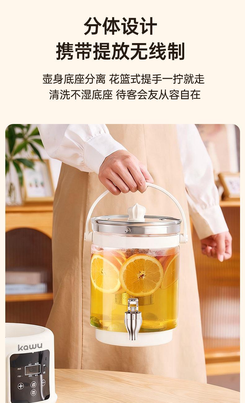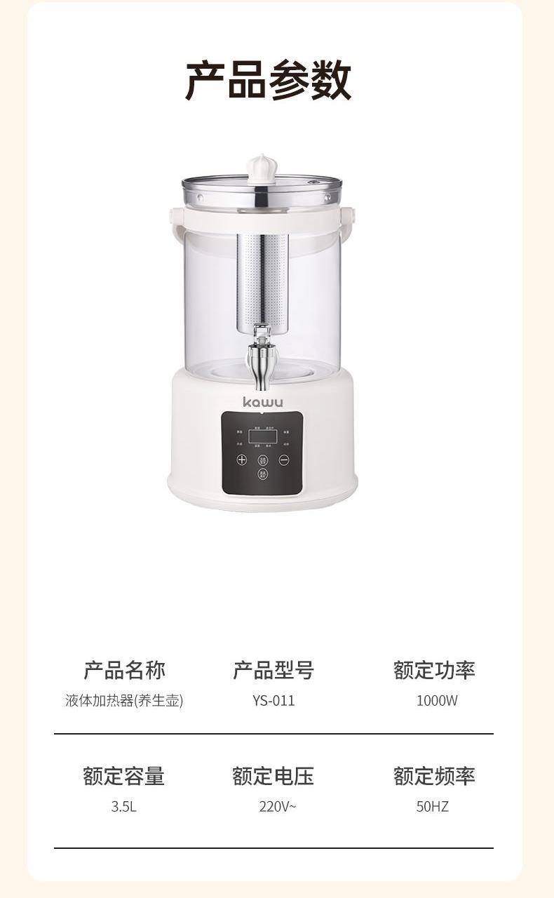 额定功率:1000W 额定电源:220V~50Hz 产品尺寸:250*370mm 包装尺寸:427x256x262mm 产品容量:3.5L 单台净重:1.64KG 单台毛重:2.2KG 1、水箱分体式设计拿取方便轻松换水 2、1000W大功率快速煮沸不久等 3、8大功能大屏幕触控操作简单方便 4、3.5L大容量多人使用也不怕 5、自带茶漏可蒸汽煮茶享受茶气芬芳 6、37-95度多段控温满足不同温度需求 7、300S提壶记忆 自动记忆提壶前水温 放回无需重设