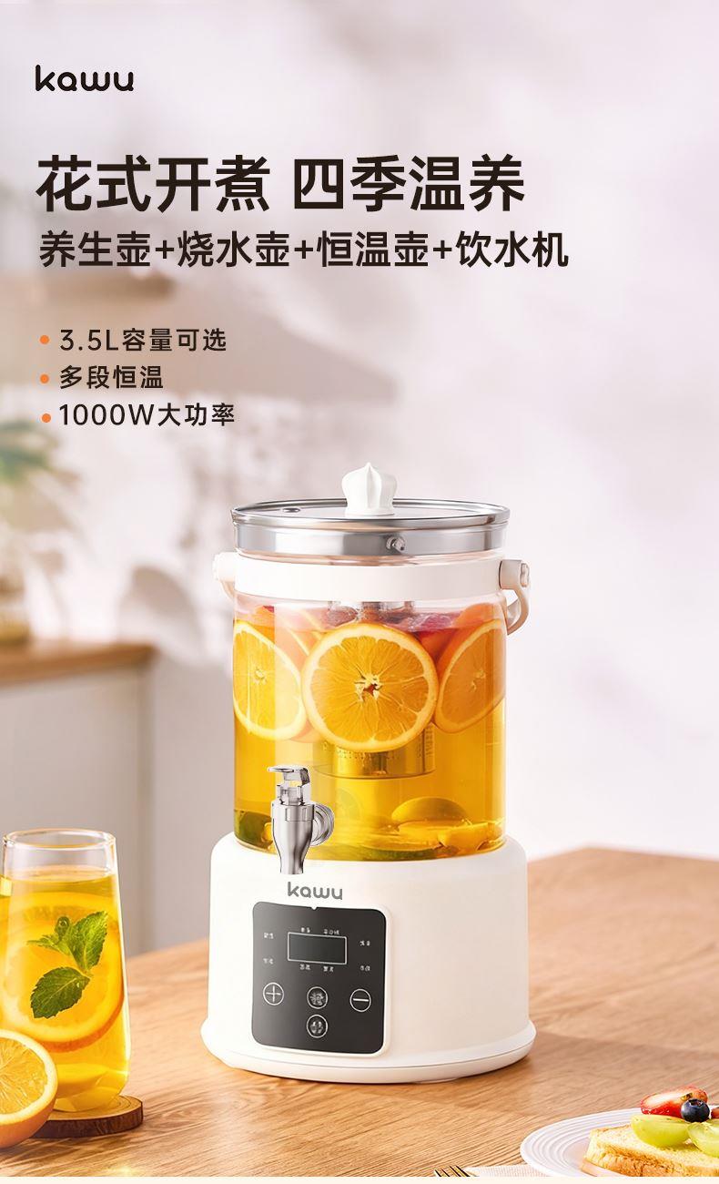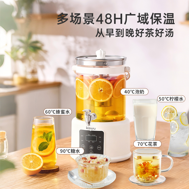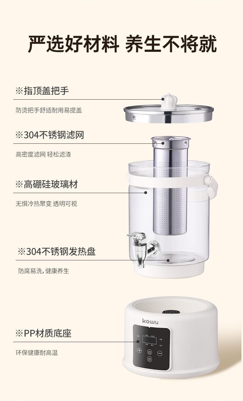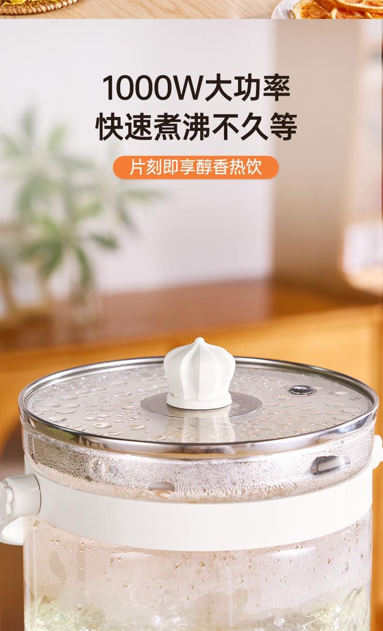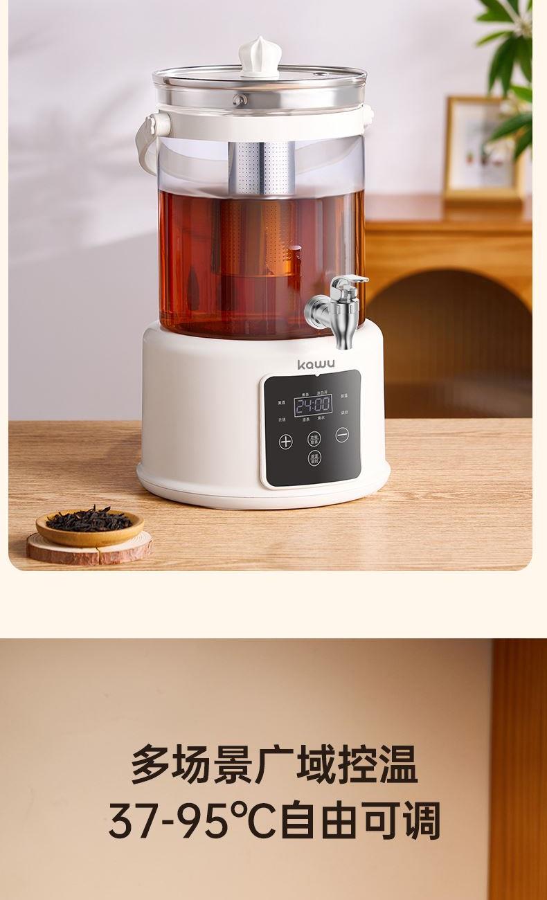 额定功率:1000W 额定电源:220V~50Hz 产品尺寸:250*370mm 包装尺寸:427x256x262mm 产品容量:3.5L 单台净重:1.64KG 单台毛重:2.2KG 1、水箱分体式设计拿取方便轻松换水 2、1000W大功率快速煮沸不久等 3、8大功能大屏幕触控操作简单方便 4、3.5L大容量多人使用也不怕 5、自带茶漏可蒸汽煮茶享受茶气芬芳 6、37-95度多段控温满足不同温度需求 7、300S提壶记忆 自动记忆提壶前水温 放回无需重设