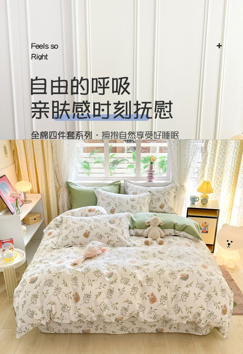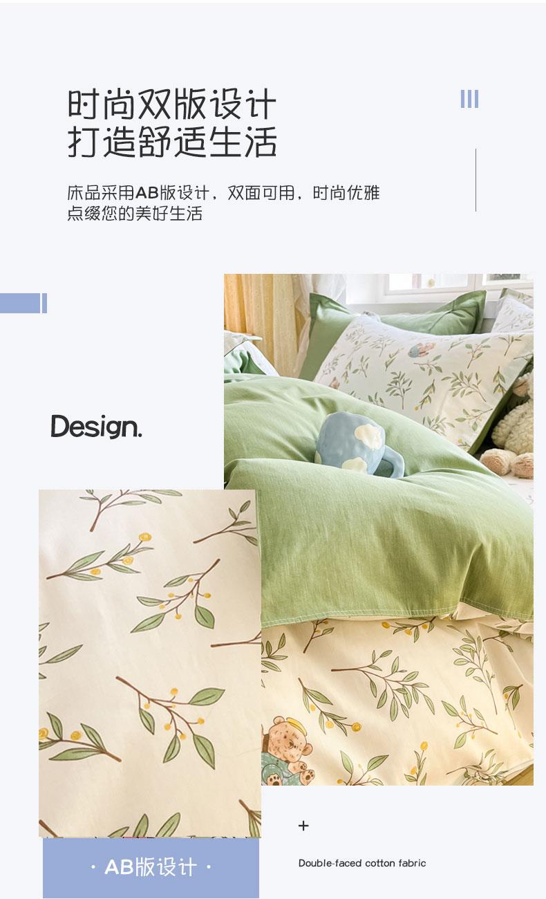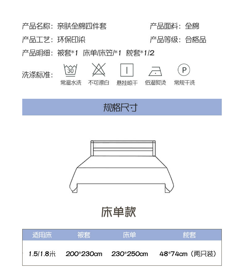 被套:200×230cm 床单:230×250cm 枕套:48×74cm 适用:1.5M-1.8M床 面料:棉 印染工艺:环保印花 风格:田园风格 包装:手提礼盒 甄选全棉面料,纯净无刺激,柔软亲肤,AB版设计,舒适透气,不易起球。