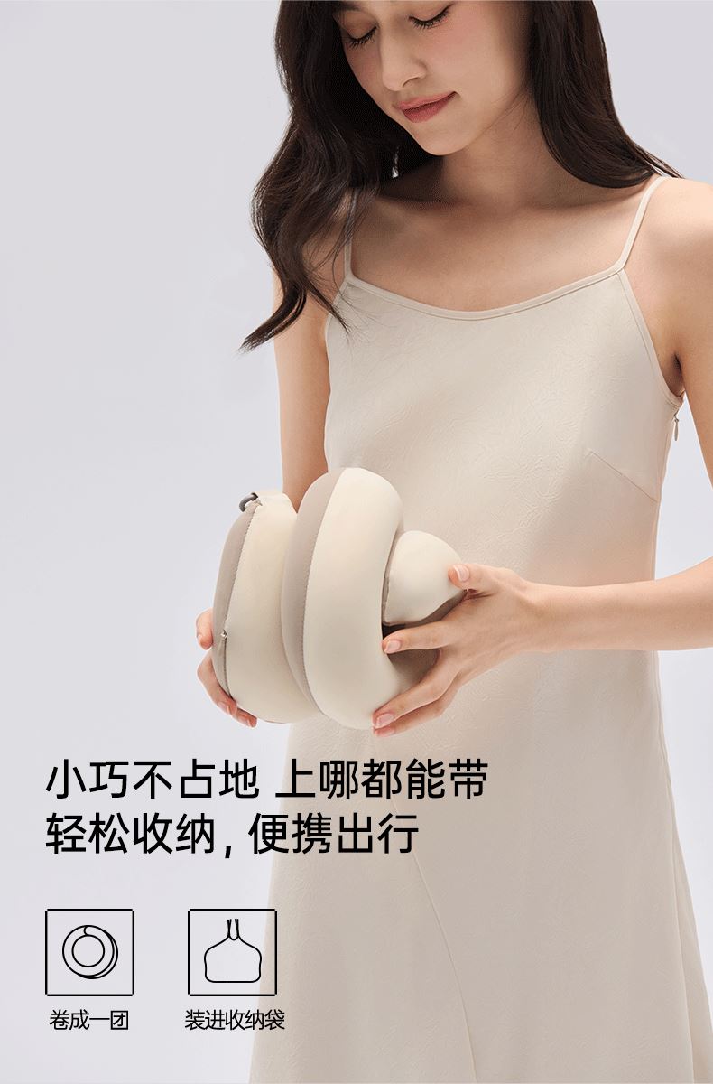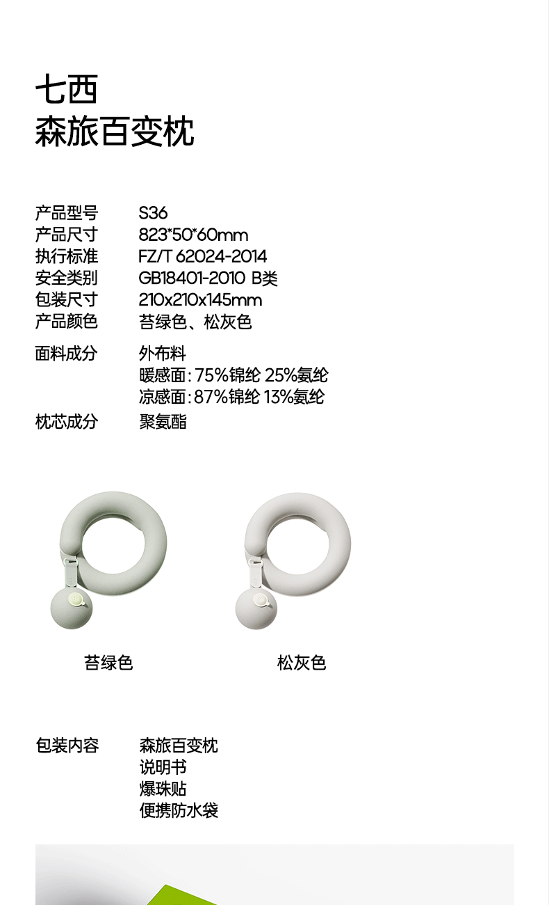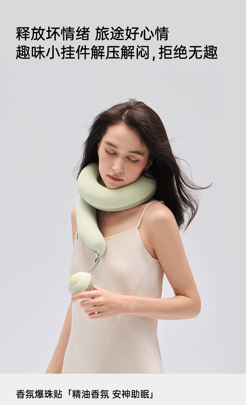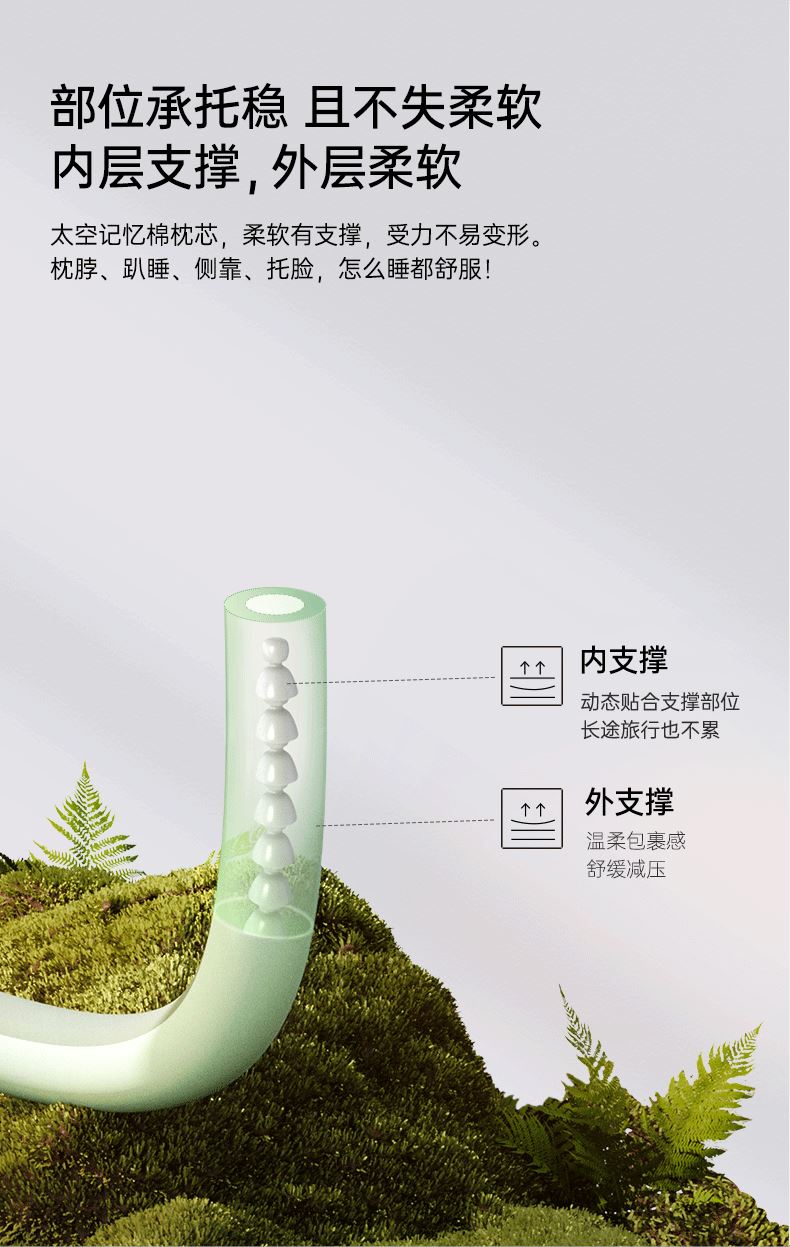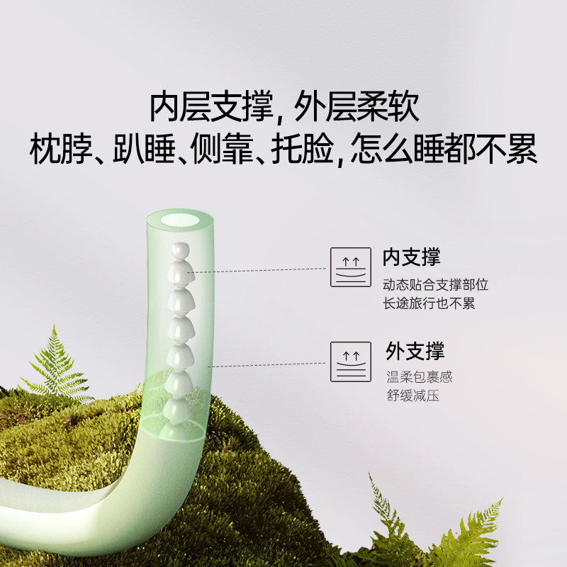产品规格:823*50*60mm 产品净重:0.5kg 外箱毛重:2kg 外箱尺寸:212*212*147mm 产品颜色:苔绿色/松灰色 包装方式:彩盒 用材亮点: 1.内设可弯曲骨架可凹出不同的造型适配不同的场景使用和部位承托 2.太空记忆棉枕芯:柔软有支撑,枕脖、趴睡、侧靠、托脸,怎么睡都舒服 细节设计亮点: 1.中间大两端小的枕体设计:人机贴合度高,使得后颈部枕区更舒适 2.球形小挂件:随心揉捏解压、把玩解乏 可拥有花木香和花果香2种香型,舒缓情绪,安神助眠 3.爆珠香氛贴: 4.轻量化设计一卷即可收纳,方便出行携带 5.枕套可拆洗:污渍或者化妆佩戴后,方便清洗
