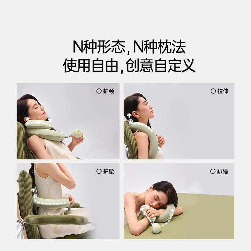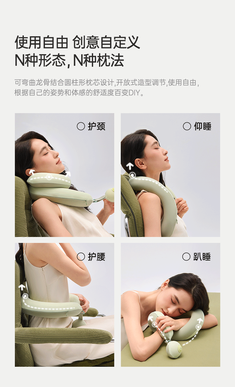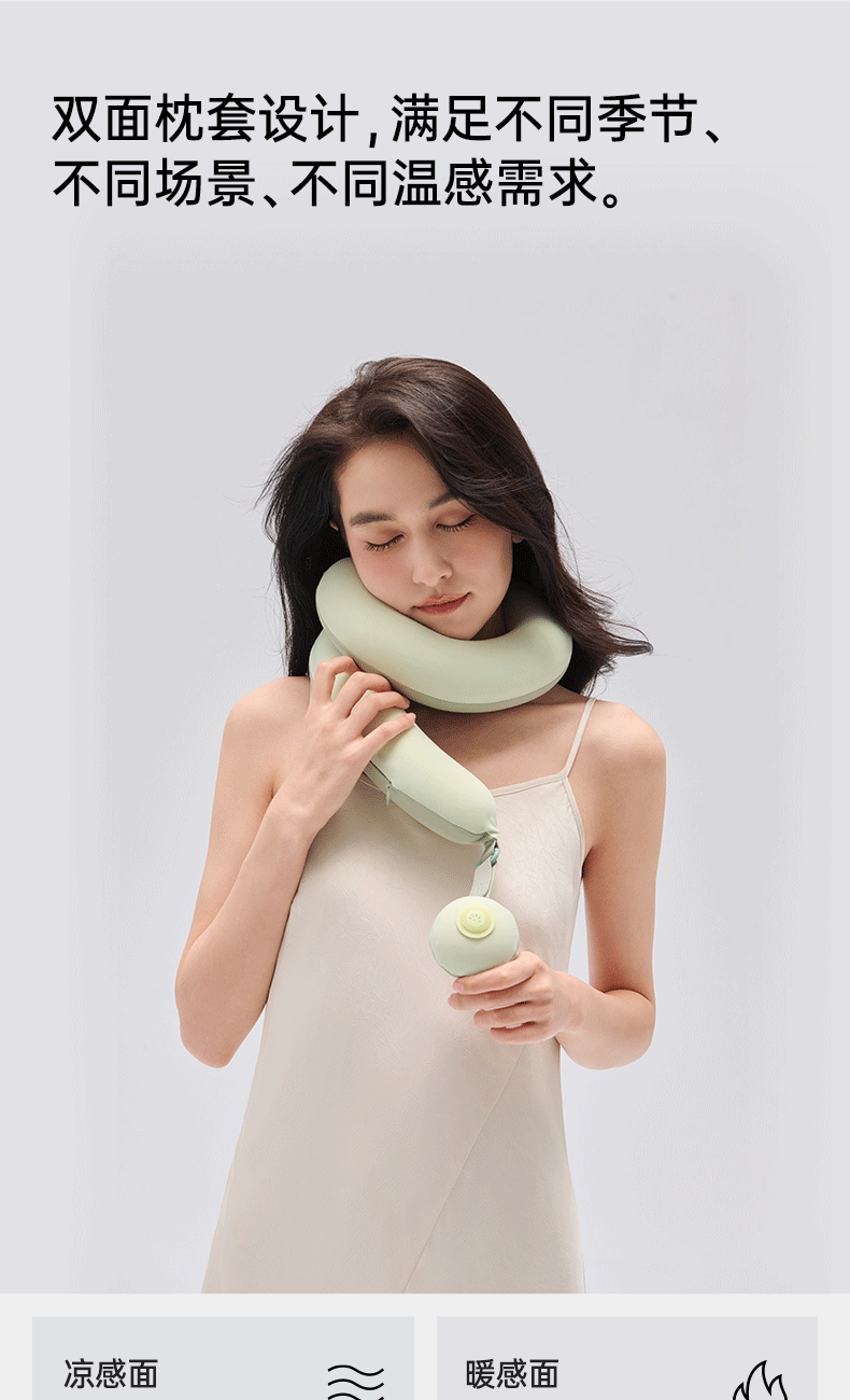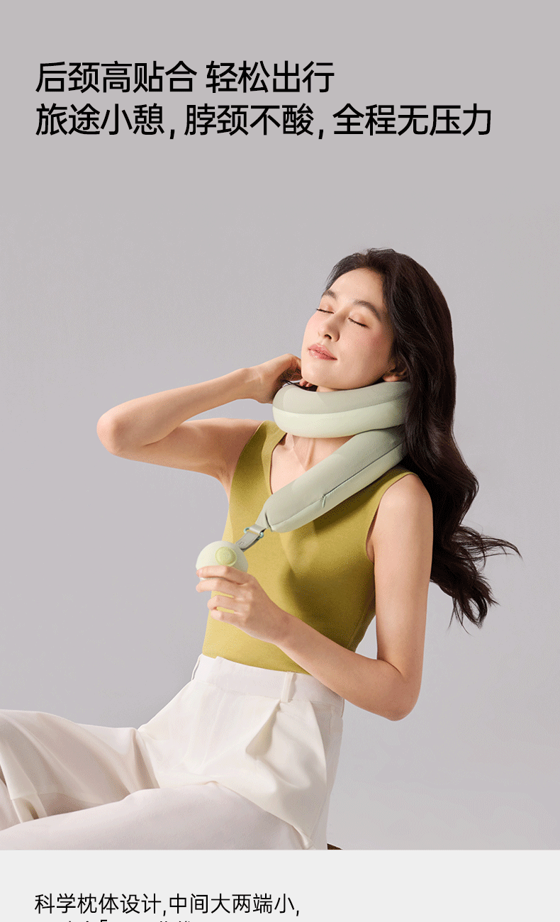 产品规格:823*50*60mm 产品净重:0.5kg 外箱毛重:2kg 外箱尺寸:212*212*147mm 产品颜色:苔绿色/松灰色 包装方式:彩盒 用材亮点: 1.内设可弯曲骨架可凹出不同的造型适配不同的场景使用和部位承托 2.太空记忆棉枕芯:柔软有支撑,枕脖、趴睡、侧靠、托脸,怎么睡都舒服 细节设计亮点: 1.中间大两端小的枕体设计:人机贴合度高,使得后颈部枕区更舒适 2.球形小挂件:随心揉捏解压、把玩解乏 可拥有花木香和花果香2种香型,舒缓情绪,安神助眠 3.爆珠香氛贴: 4.轻量化设计一卷即可收纳,方便出行携带 5.枕套可拆洗:污渍或者化妆佩戴后,方便清洗
