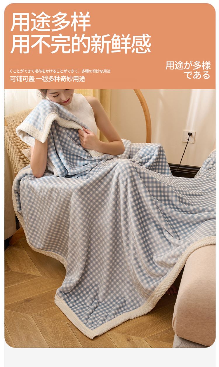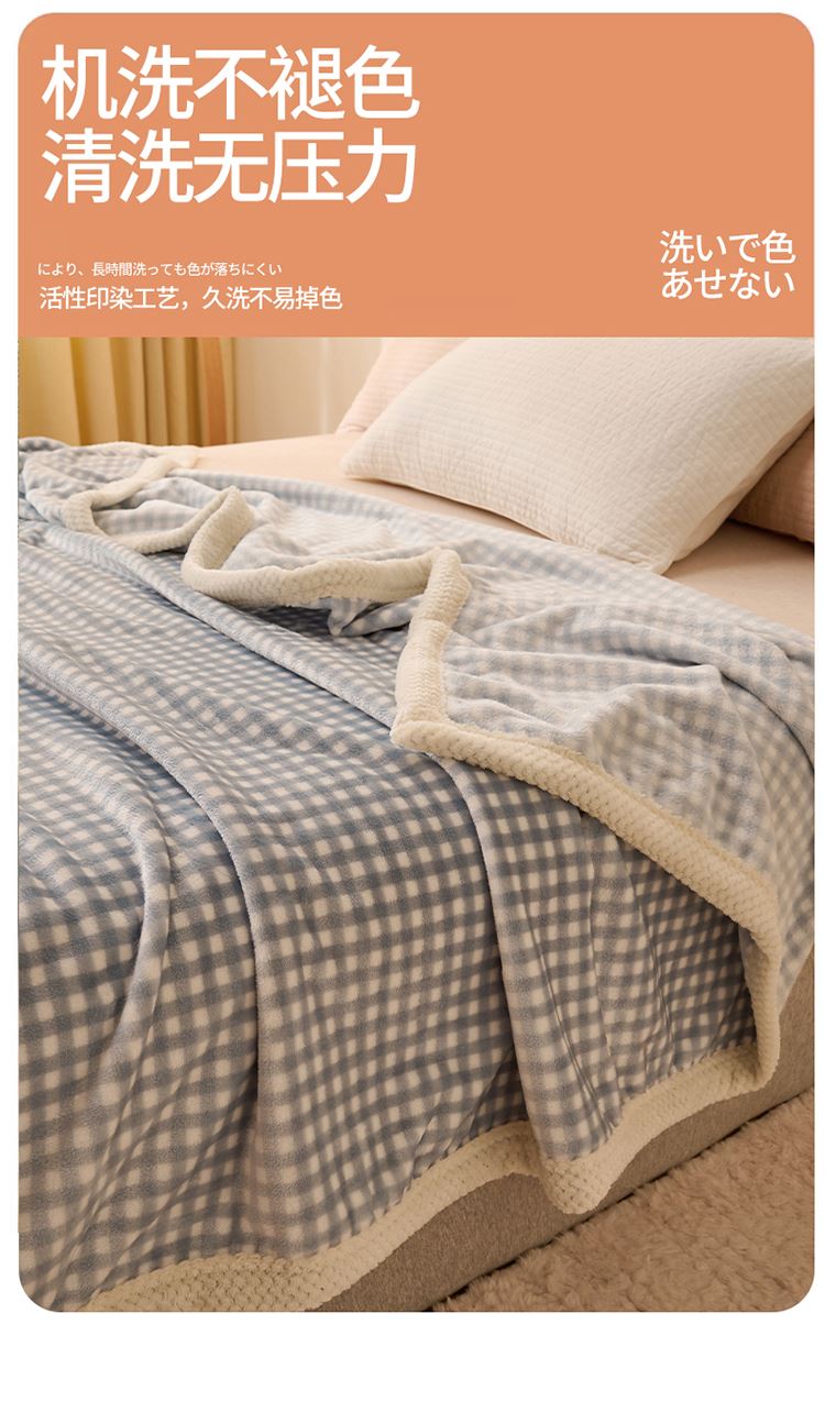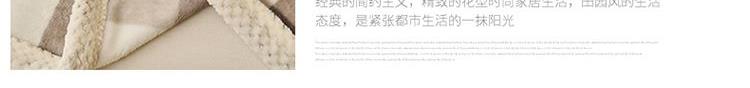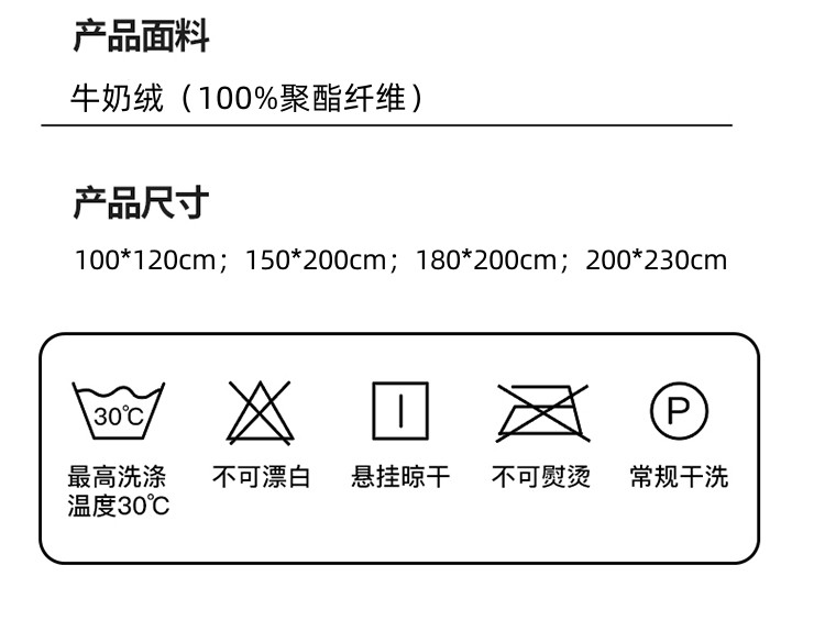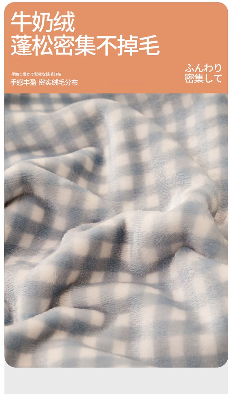 规格:150*200cm 1.3kg 面料:牛奶绒(聚酯纤维) 花色:爱玛格、粉大格、灰色中格、蓝大格、蓝小格、蓝棕小格 采用高克重牛奶绒面料,绒毛细密,不易脱毛;采用活性印染工艺,色牢度高,久洗不易掉色;可用作睡眠盖毯,床盖、办公室午睡毯、空调休闲毯、车载盖毯、儿童垫毯、居家装饰毯;加厚保暖升温迅速,且能牢牢锁温。