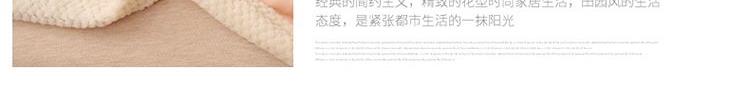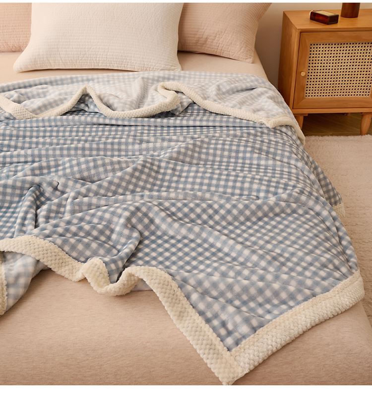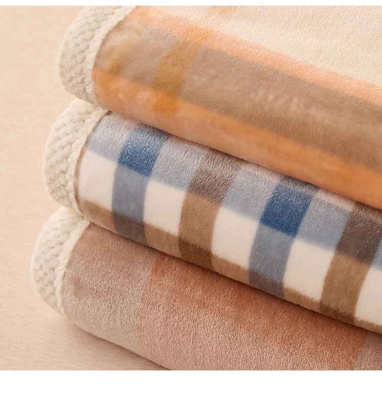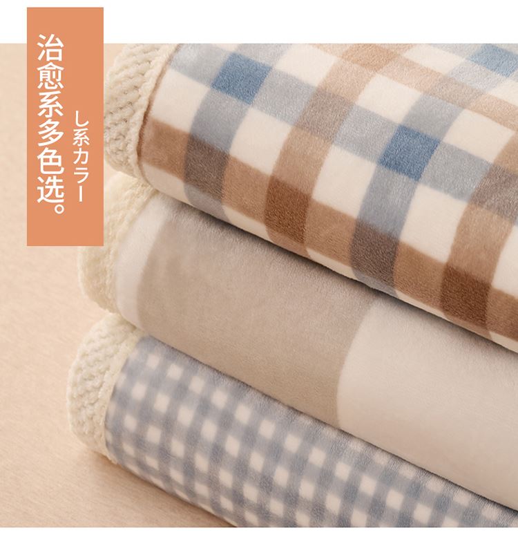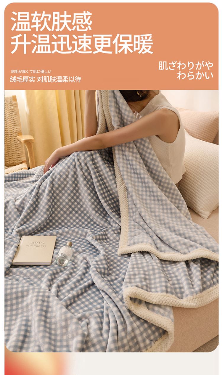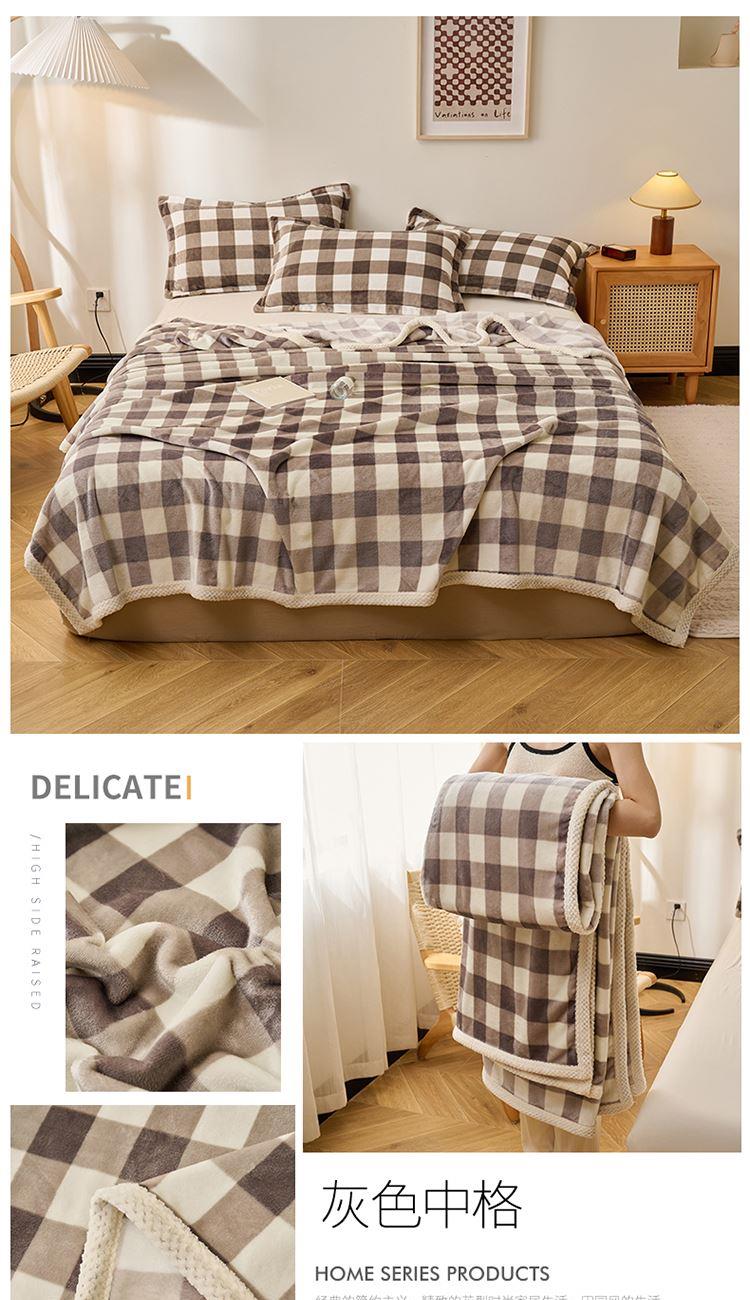 规格:150*200cm 1.3kg 面料:牛奶绒(聚酯纤维) 花色:爱玛格、粉大格、灰色中格、蓝大格、蓝小格、蓝棕小格 采用高克重牛奶绒面料,绒毛细密,不易脱毛;采用活性印染工艺,色牢度高,久洗不易掉色;可用作睡眠盖毯,床盖、办公室午睡毯、空调休闲毯、车载盖毯、儿童垫毯、居家装饰毯;加厚保暖升温迅速,且能牢牢锁温。