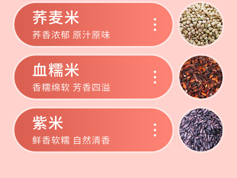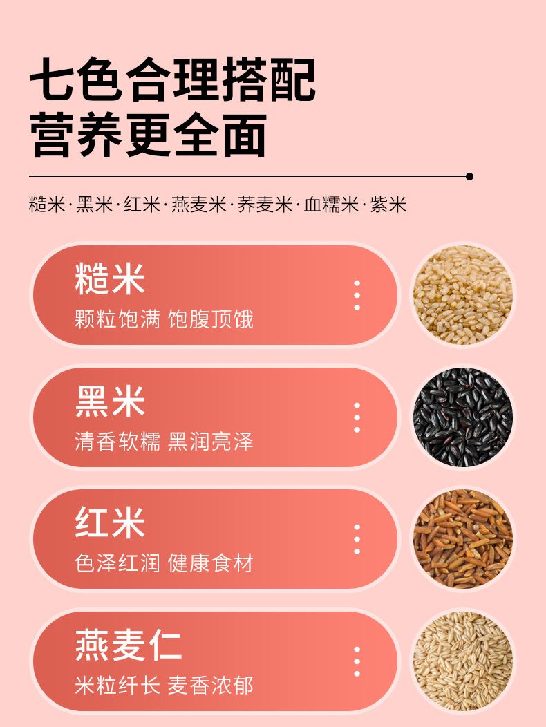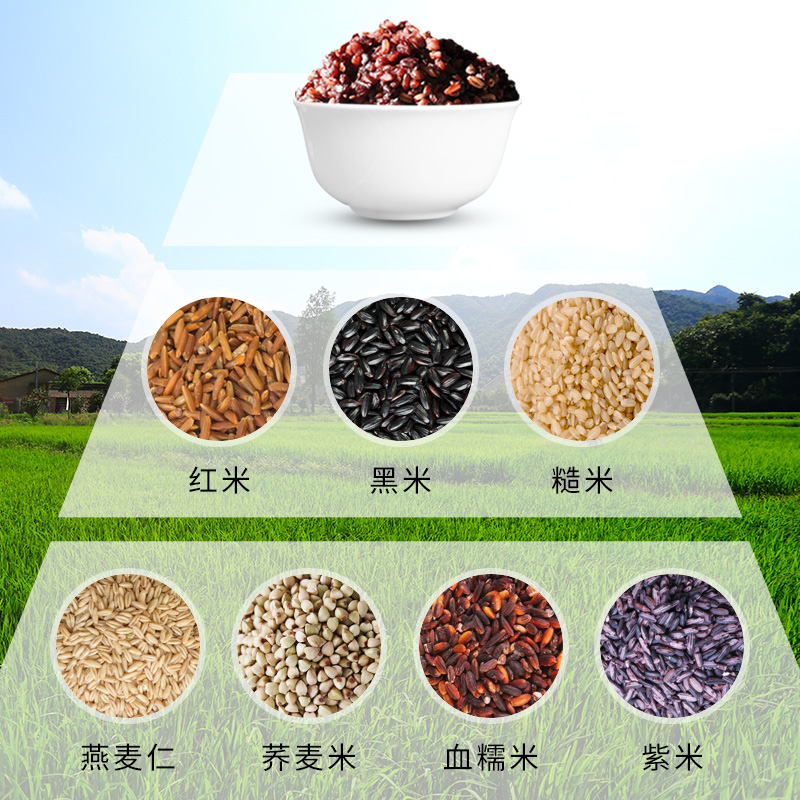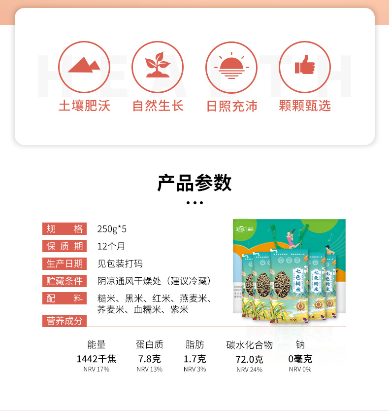 条 码:6972761600215 规 格:1.25kg,250g/袋*5 包 装:真空彩袋 内 容:糙米、黑米、红米、 燕麦米、荞麦米、血糯米 紫米7种精选好米 12盒 箱重量:18.5kg 盒尺寸:32cm*10cm*24cm 箱尺寸: 63*34*50(0.107方)