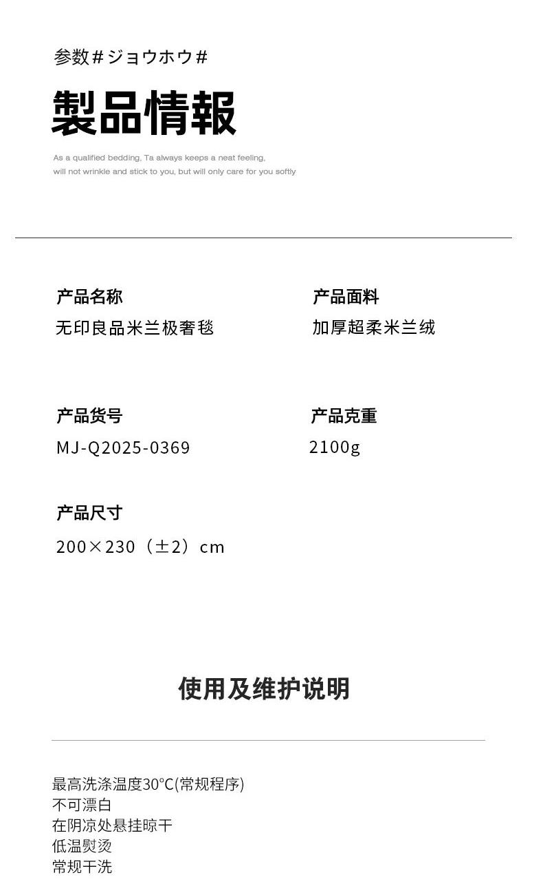 规 格:200×230(±2)cm 面 料:加厚超柔米兰绒 克 重:2100g : 超柔超细超柔亮光米兰绒,厚实但却轻盈,纯度高,手感柔。 用心的品质把关,认真的细节处理,让使用得到尊重。 搭配,精细做工,精品代表