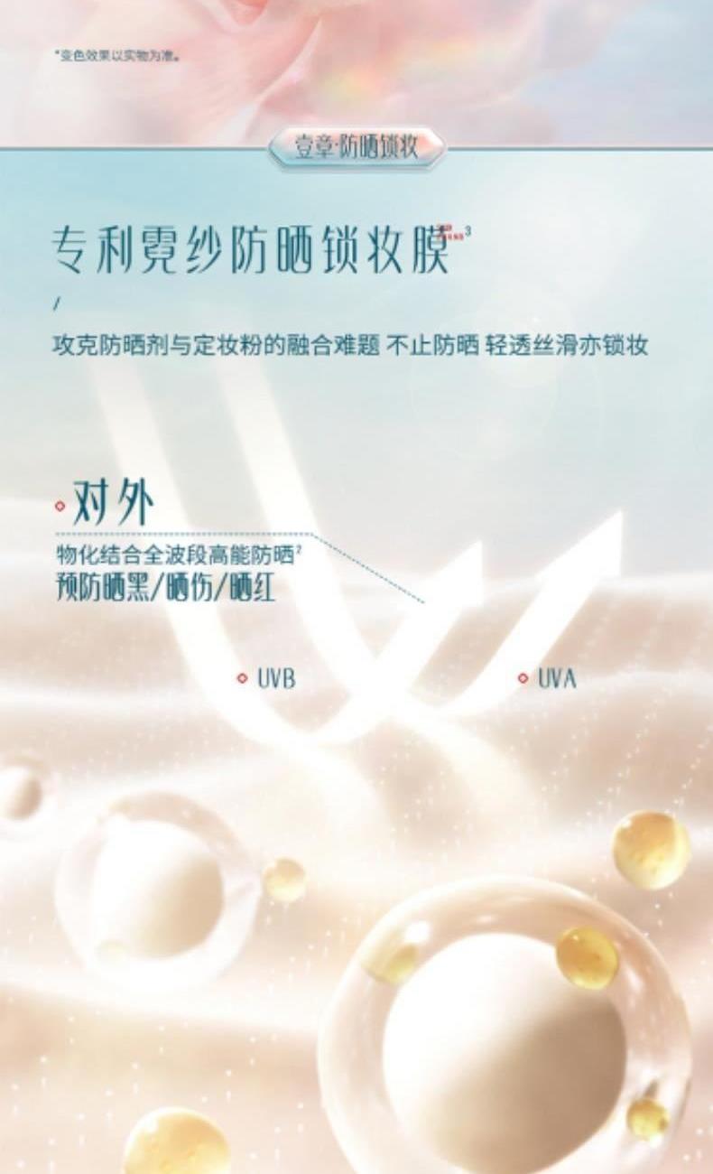 规格:9g 卖点: 1.霓纱防晒锁妆膜:外御光 内锁妆双相加成持妆力; 2.蝶翼隐瑕粉体:蝶翼折光 隐瑕修毛孔,光学级柔焦不假面; 3.万相色修术:研究近万名东方女性肤色专为东方肤色定制