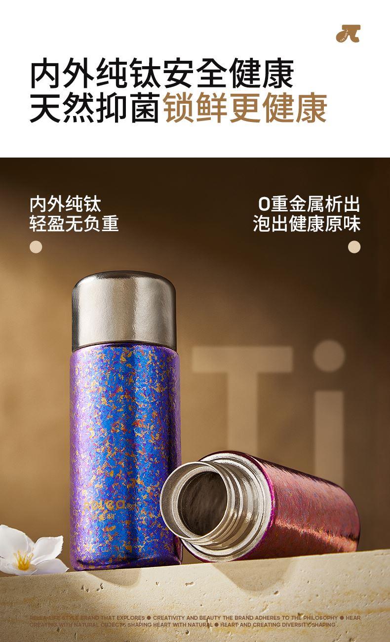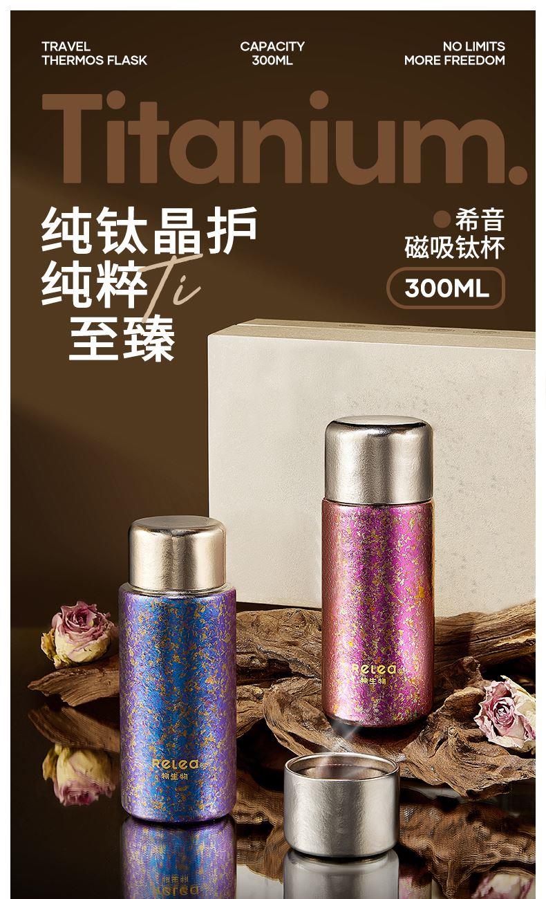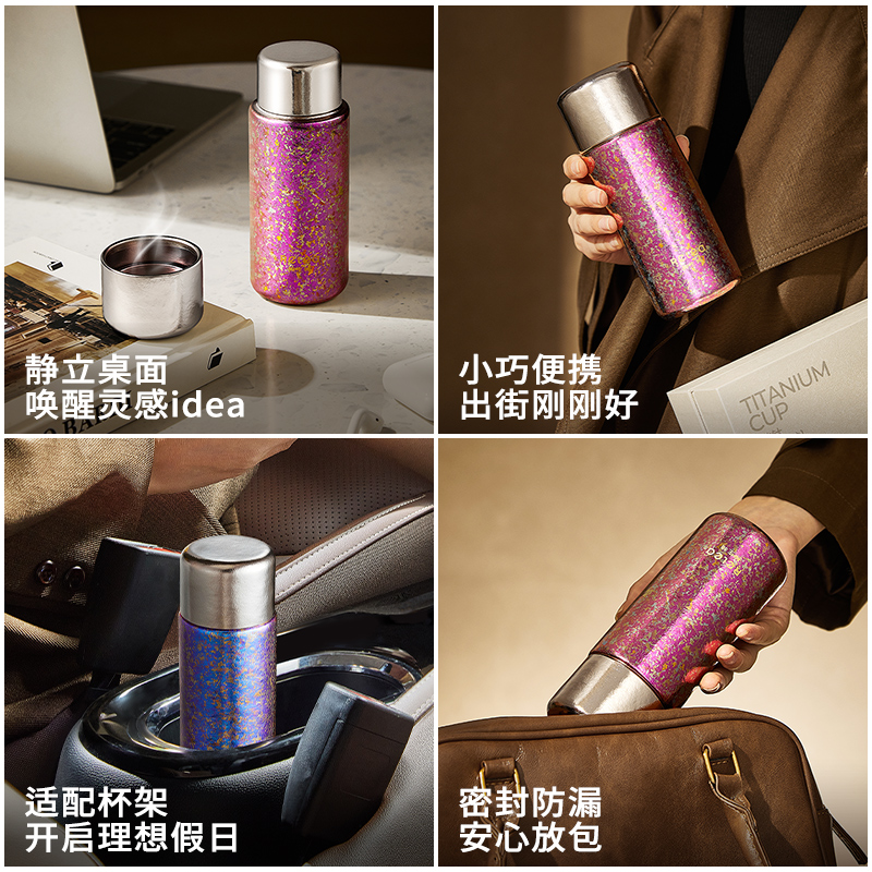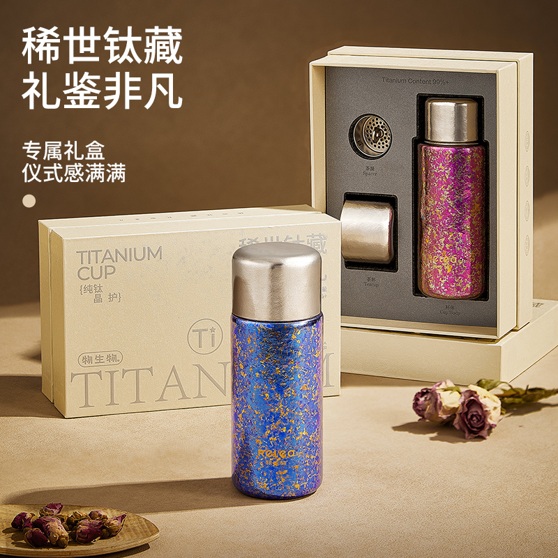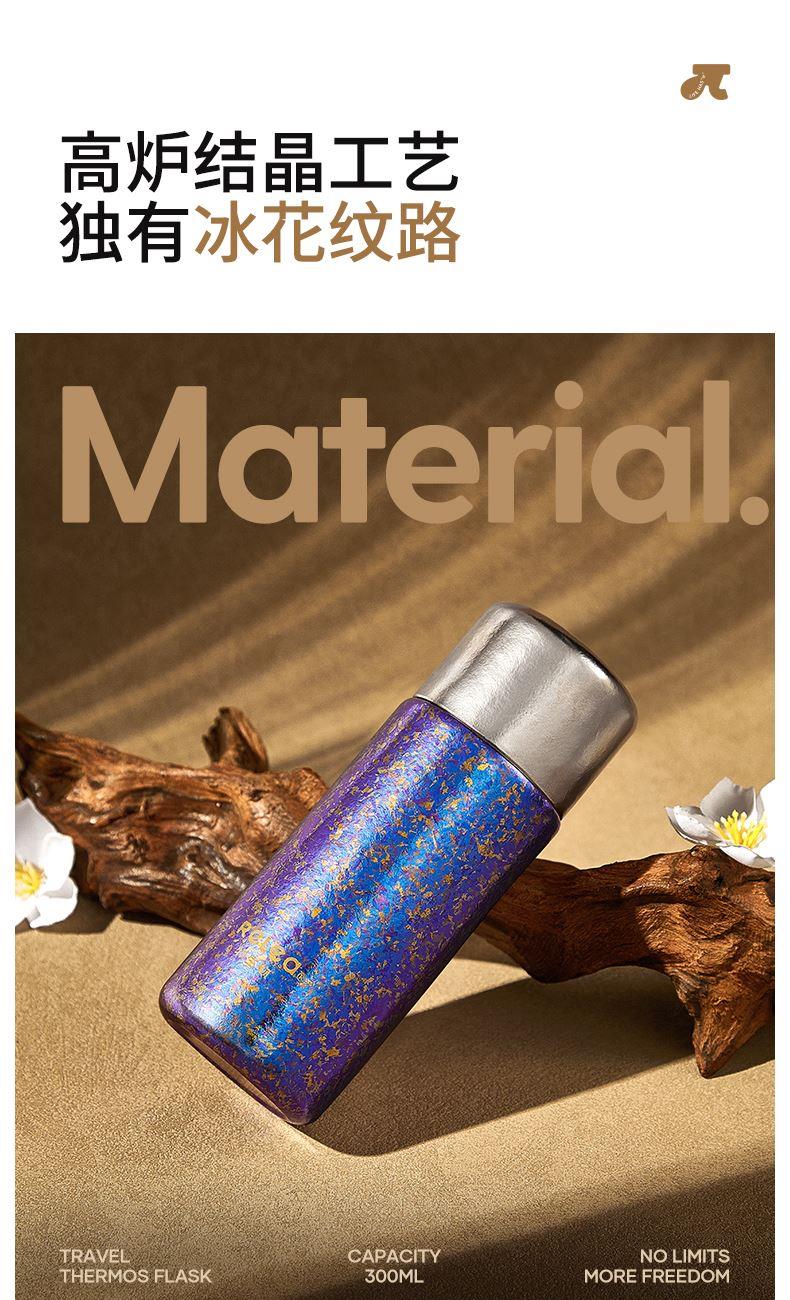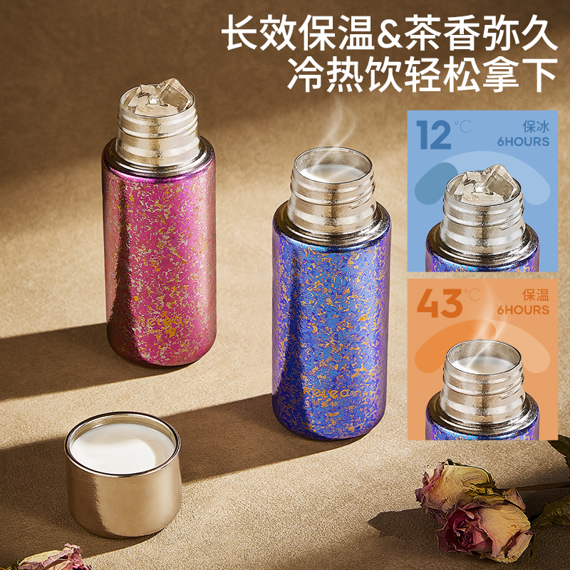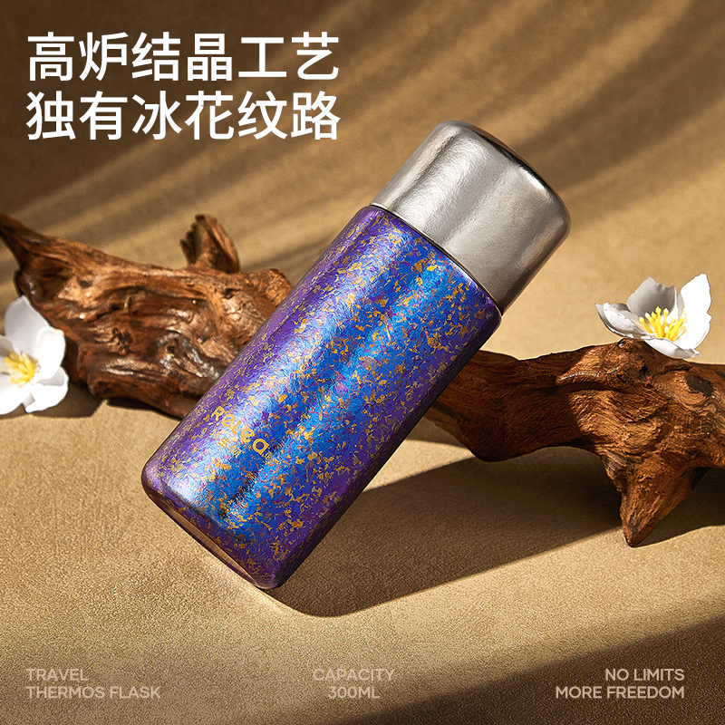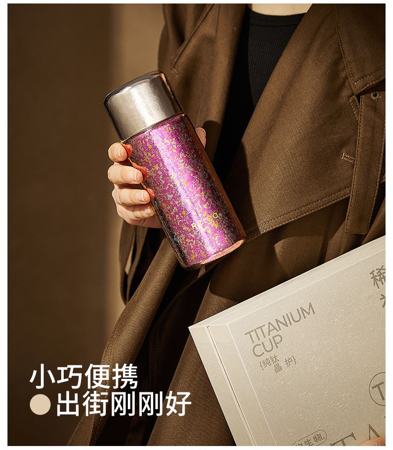颜色:霞光粉 凝夜紫 容量:300ml 材质:内胆-外盖-内盖/纯钛杯盖配件密封圈/PP+食品级硅胶 尺寸:尺寸:16cm(高度)x5.2cm(宽度) 1 内外航天级纯钛材质,钛含量大于99% 2.专属礼盒包装,仪式感慢慢 3.持久保温保冷。 4.高炉结晶工艺,独有冰花纹路。 磁吸杯盖设计,杯盖即茶盏,单手轻松喝水~