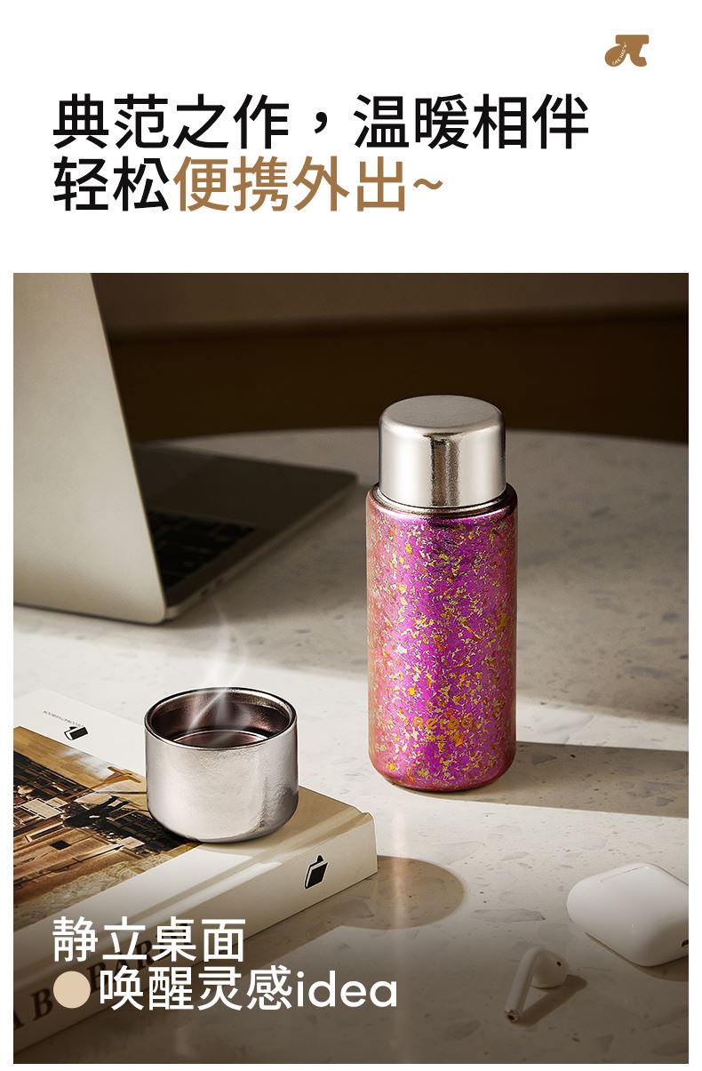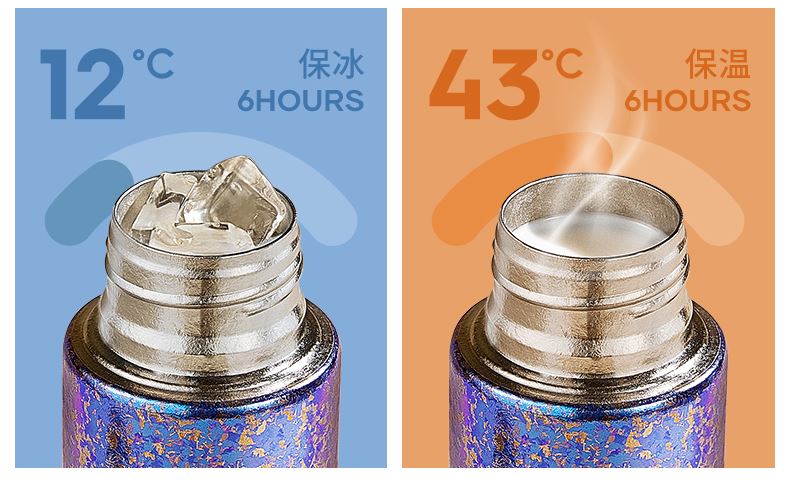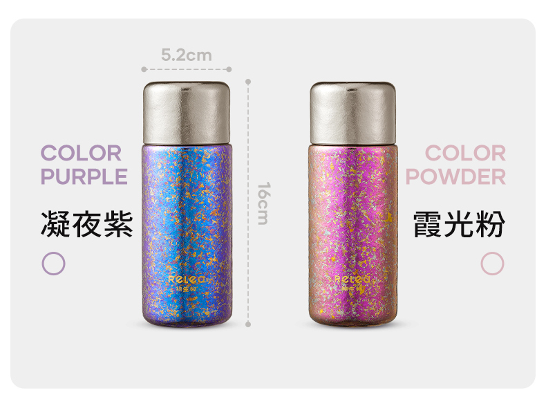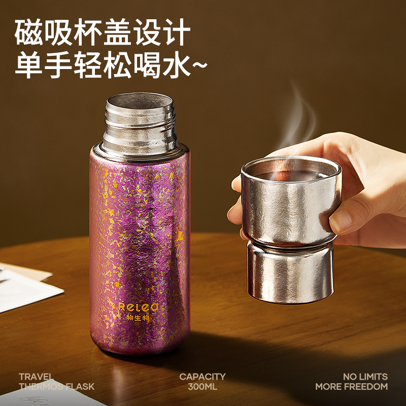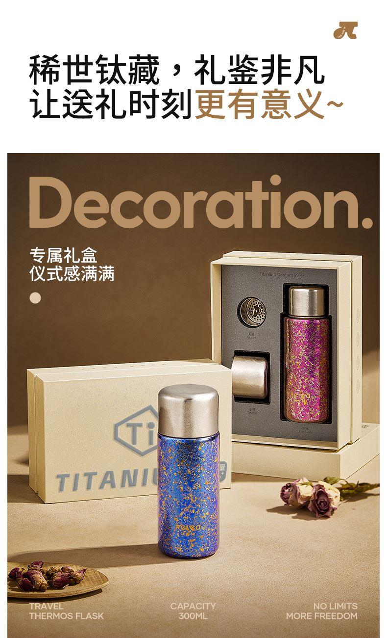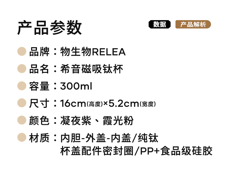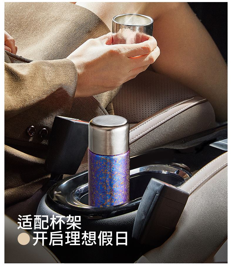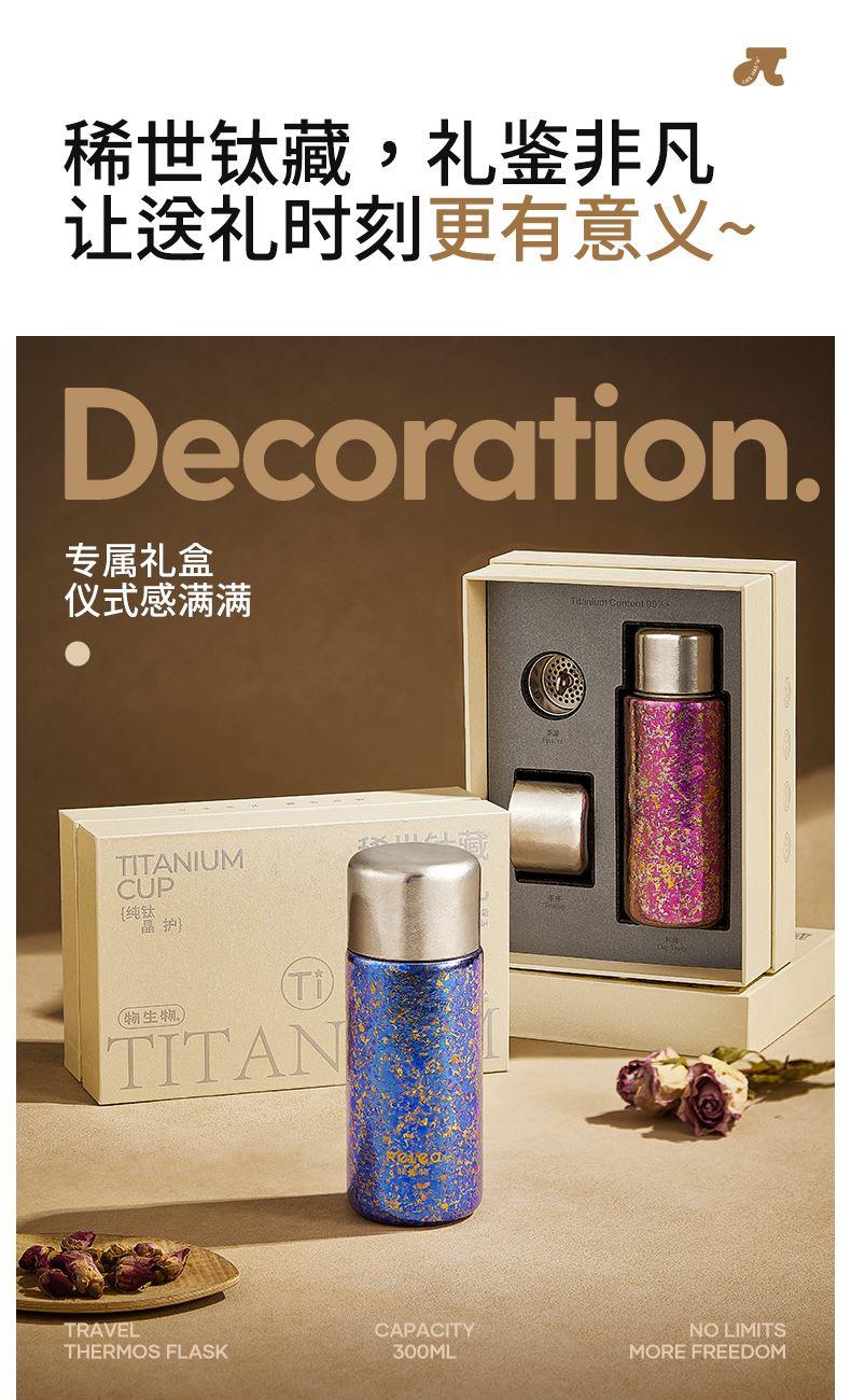 颜色:霞光粉 凝夜紫 容量:300ml 材质:内胆-外盖-内盖/纯钛杯盖配件密封圈/PP+食品级硅胶 尺寸:尺寸:16cm(高度)x5.2cm(宽度) 1 内外航天级纯钛材质,钛含量大于99% 2.专属礼盒包装,仪式感慢慢 3.持久保温保冷。 4.高炉结晶工艺,独有冰花纹路。 磁吸杯盖设计,杯盖即茶盏,单手轻松喝水~
