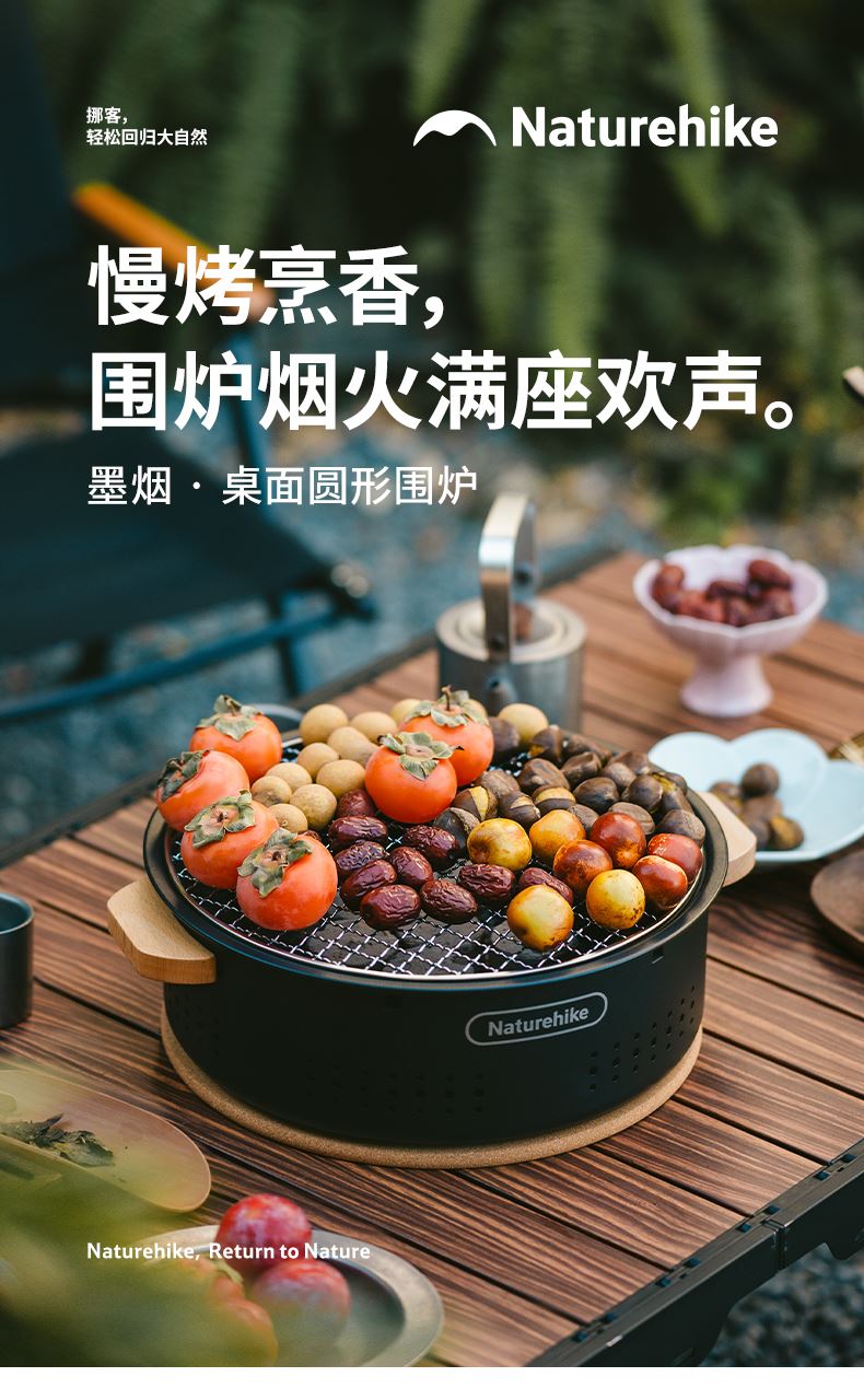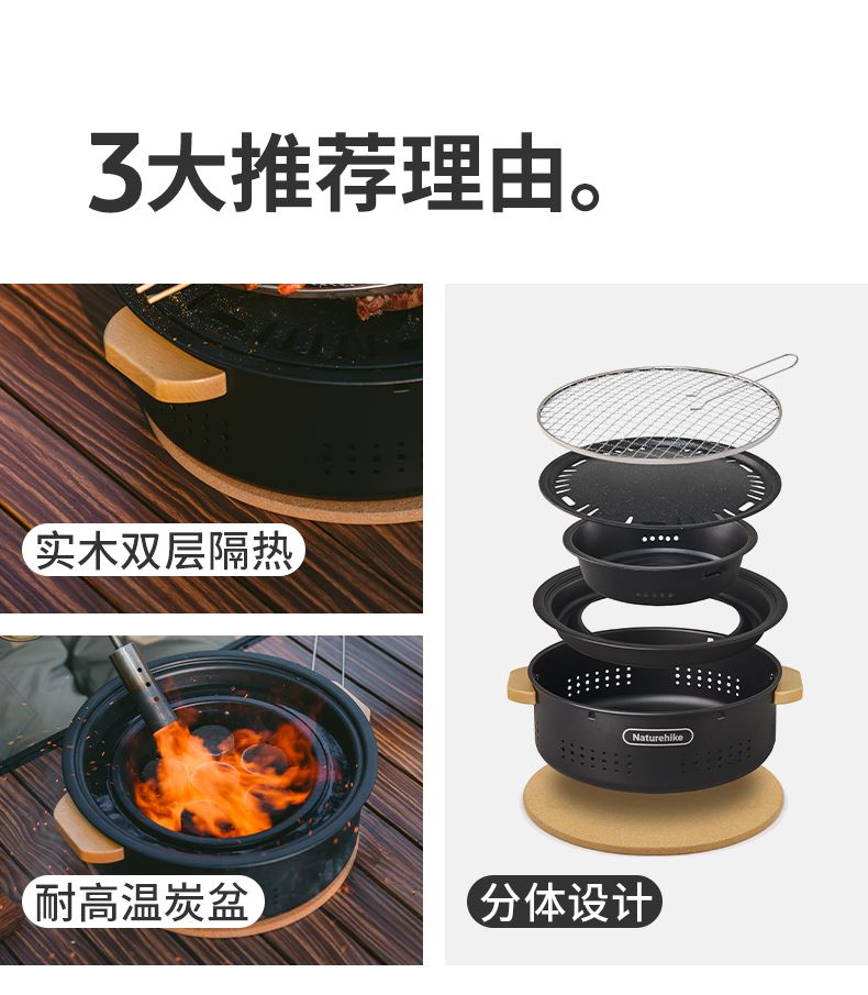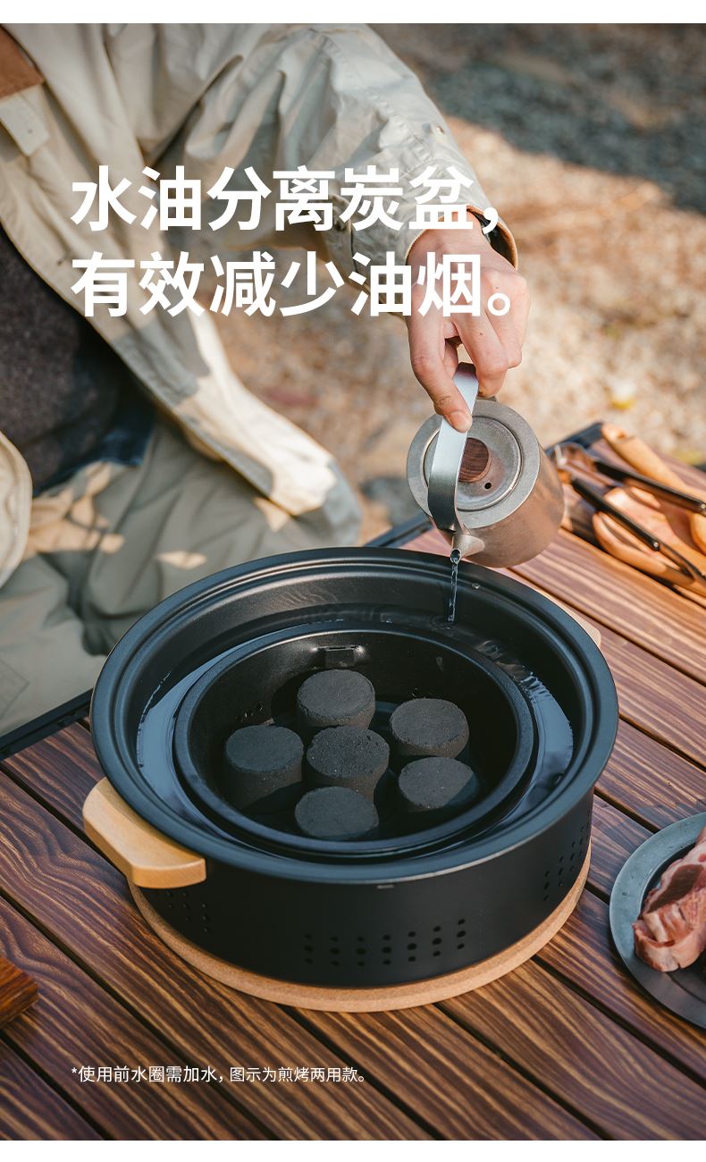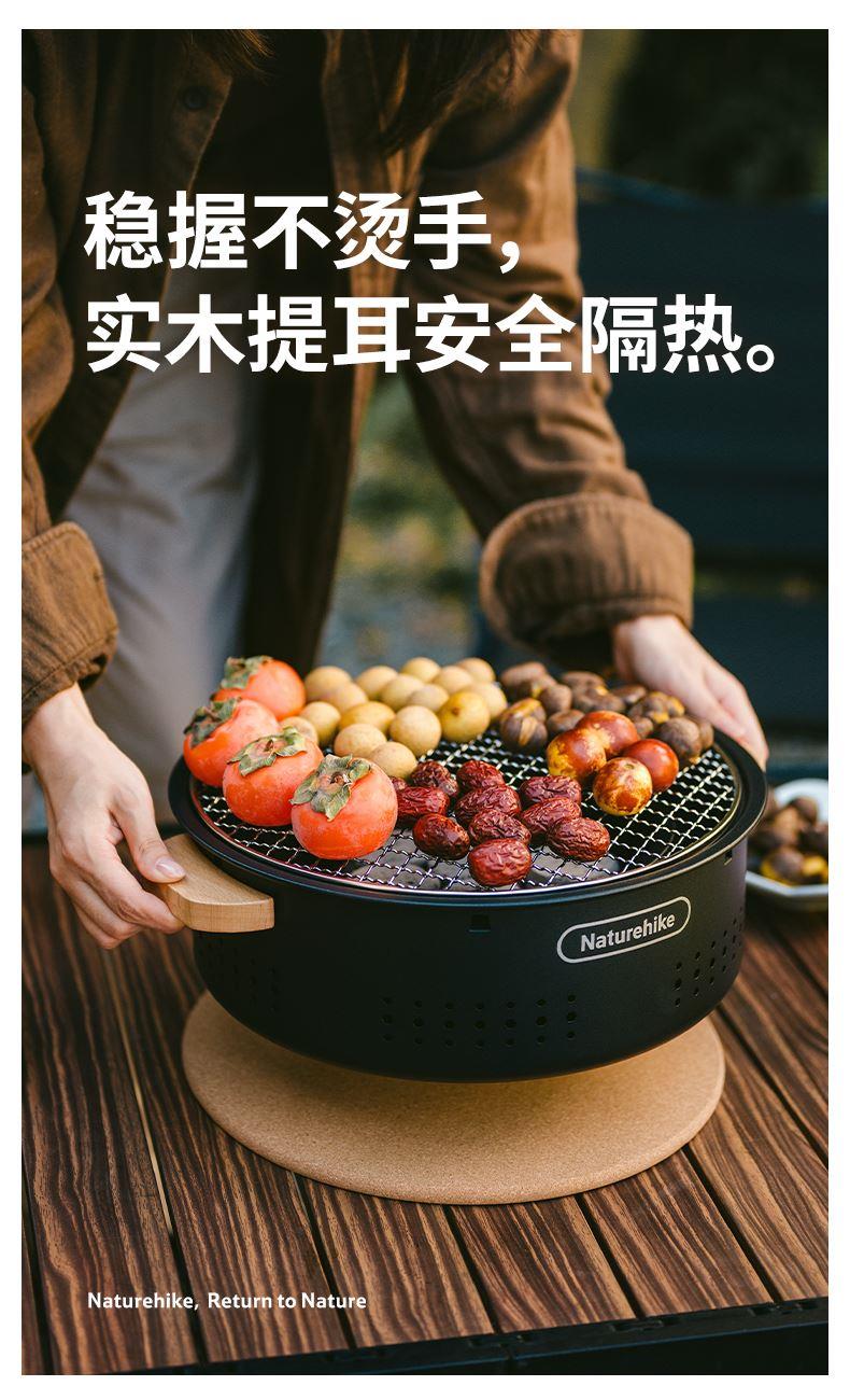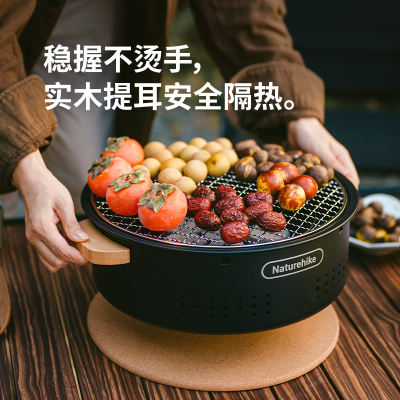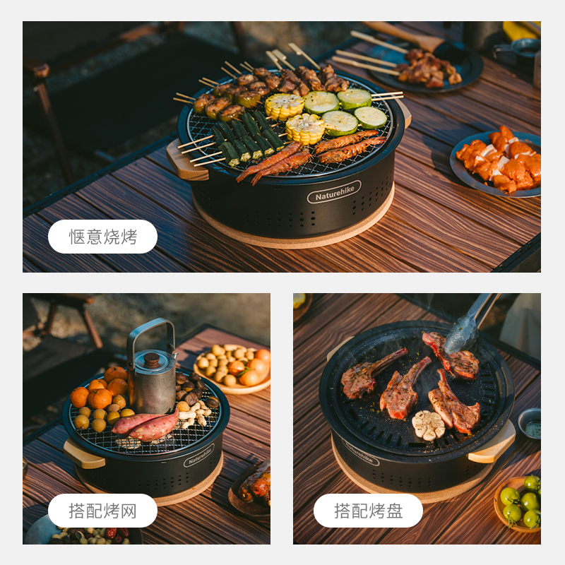 Naturehike CNK2550CF010 墨烟桌面圆形围炉 尺寸:36*32.6*13cm重量:约2.3kg 颜色:黑色 材质:冷轧板,铁镀铬,榉木,软木 产品特点: 稳握不烫手实木提耳安全隔热 水油分离炭盆有效减少油烟 食品级烤网耐用抗锈易清洁 分体式设计,拆卸友好易清洗 600°耐高温炭盆,稳定承热才更耐烧 收纳简单一拎即走