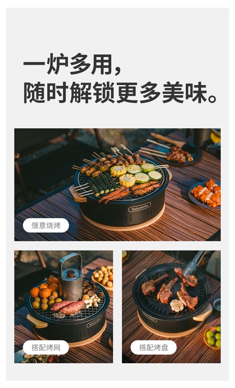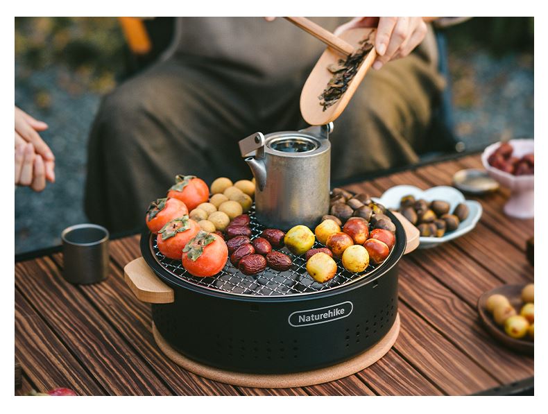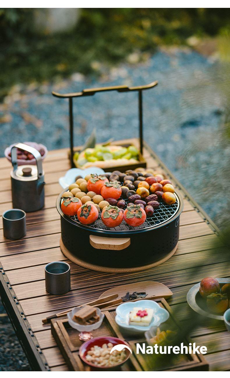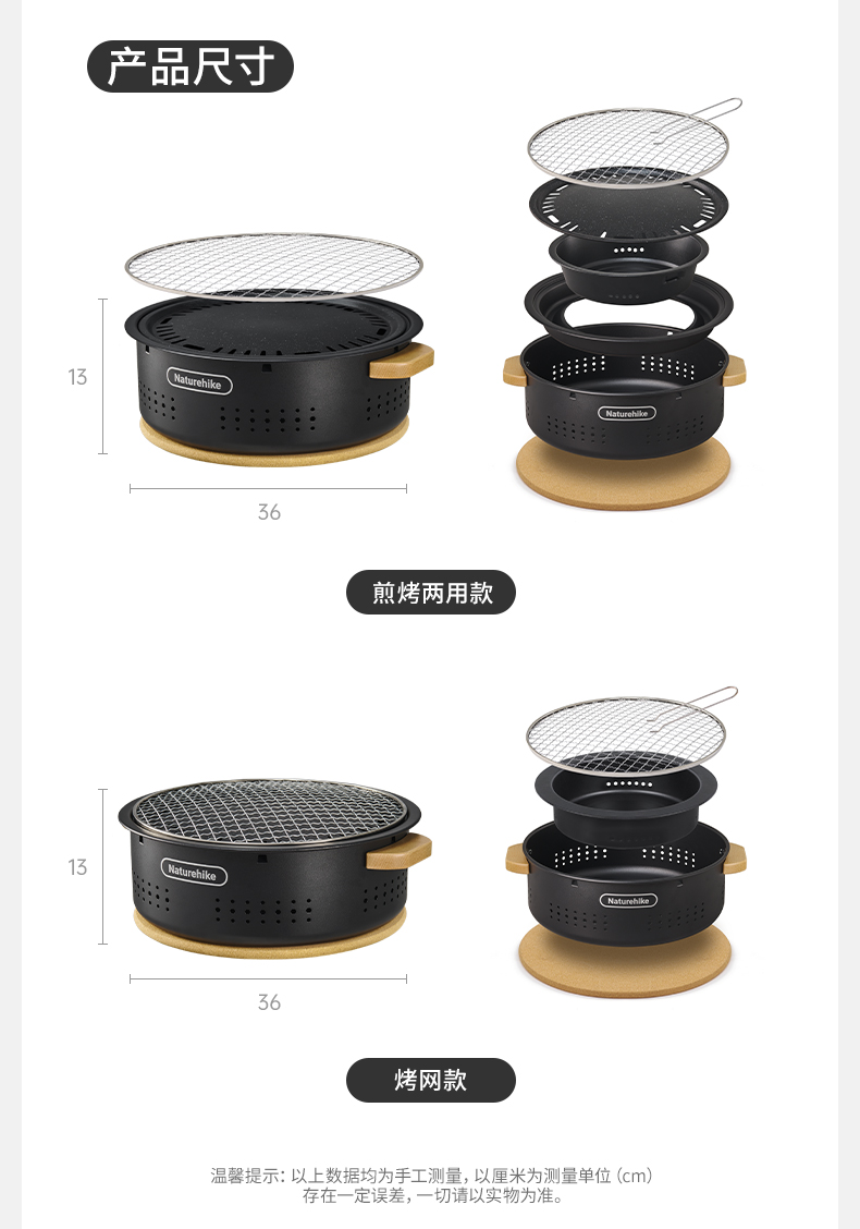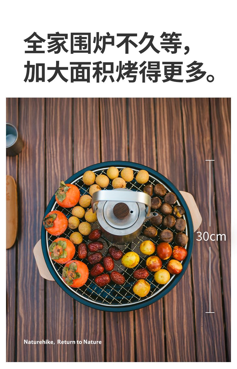 Naturehike CNK2550CF010 墨烟桌面圆形围炉 尺寸:36*32.6*13cm重量:约2.3kg 颜色:黑色 材质:冷轧板,铁镀铬,榉木,软木 产品特点: 稳握不烫手实木提耳安全隔热 水油分离炭盆有效减少油烟 食品级烤网耐用抗锈易清洁 分体式设计,拆卸友好易清洗 600°耐高温炭盆,稳定承热才更耐烧 收纳简单一拎即走