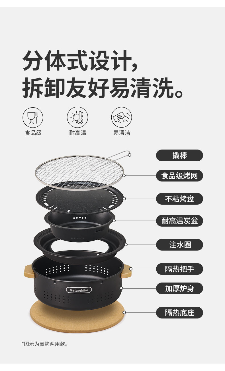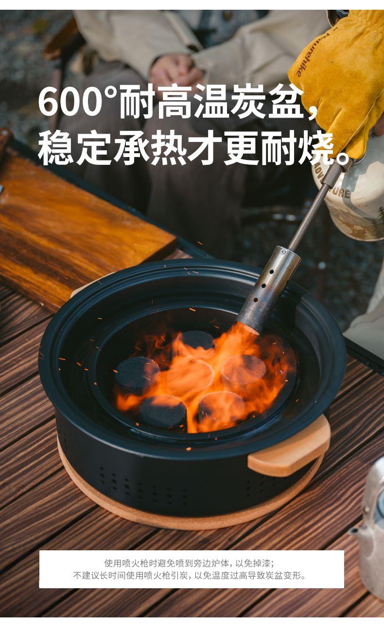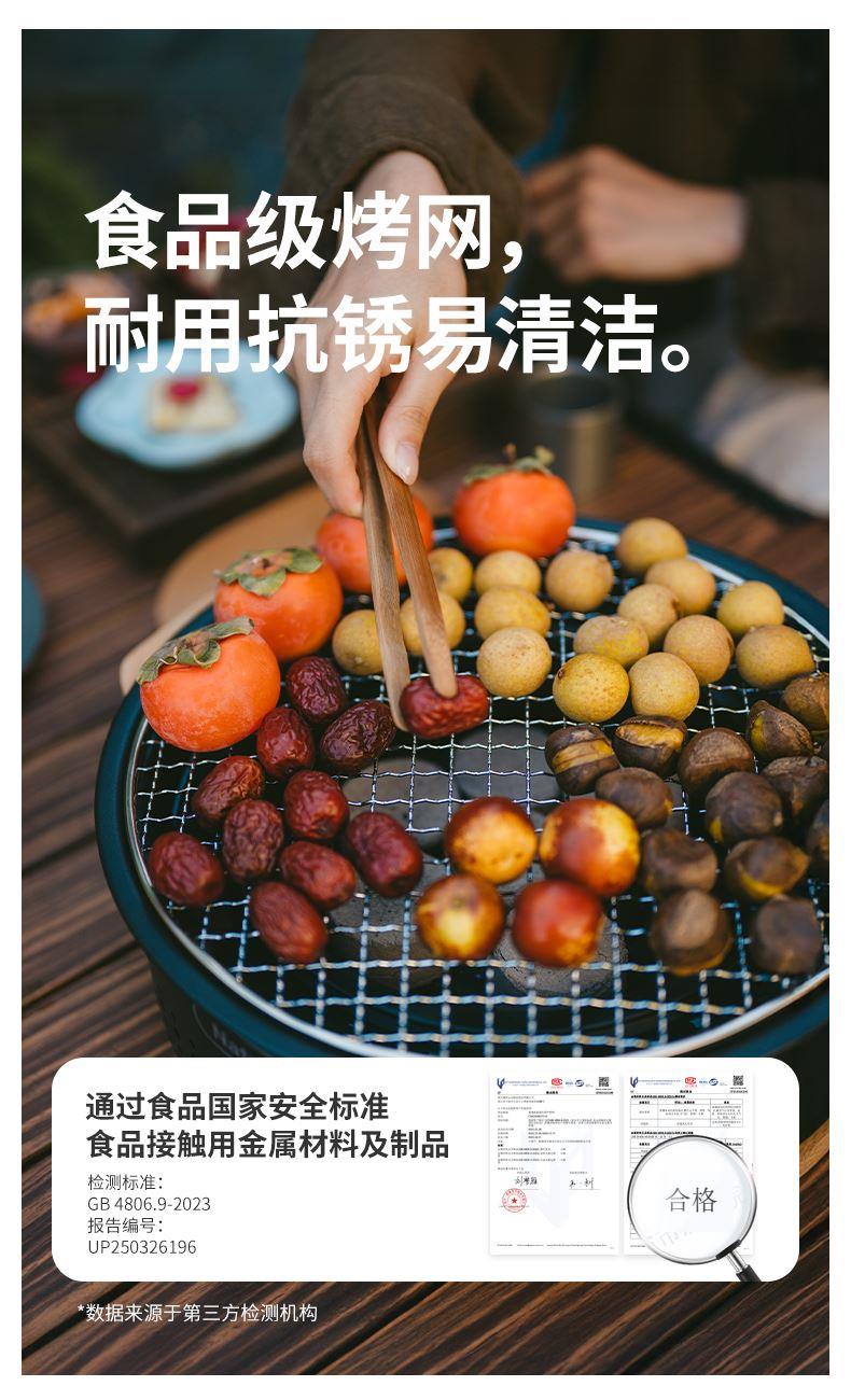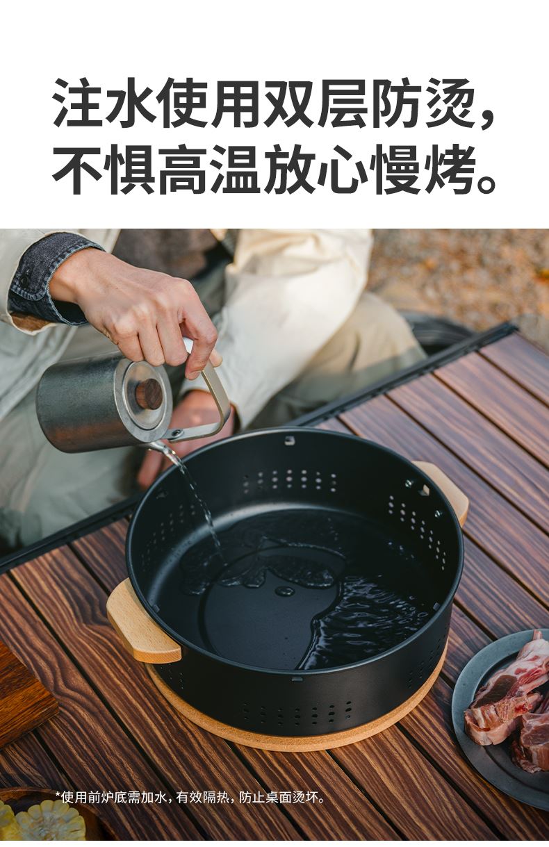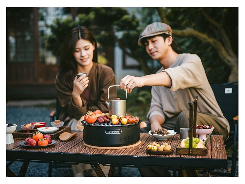 Naturehike CNK2550CF010 墨烟桌面圆形围炉 尺寸:36*32.6*13cm重量:约2.3kg 颜色:黑色 材质:冷轧板,铁镀铬,榉木,软木 产品特点: 稳握不烫手实木提耳安全隔热 水油分离炭盆有效减少油烟 食品级烤网耐用抗锈易清洁 分体式设计,拆卸友好易清洗 600°耐高温炭盆,稳定承热才更耐烧 收纳简单一拎即走