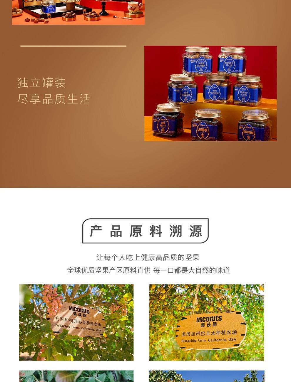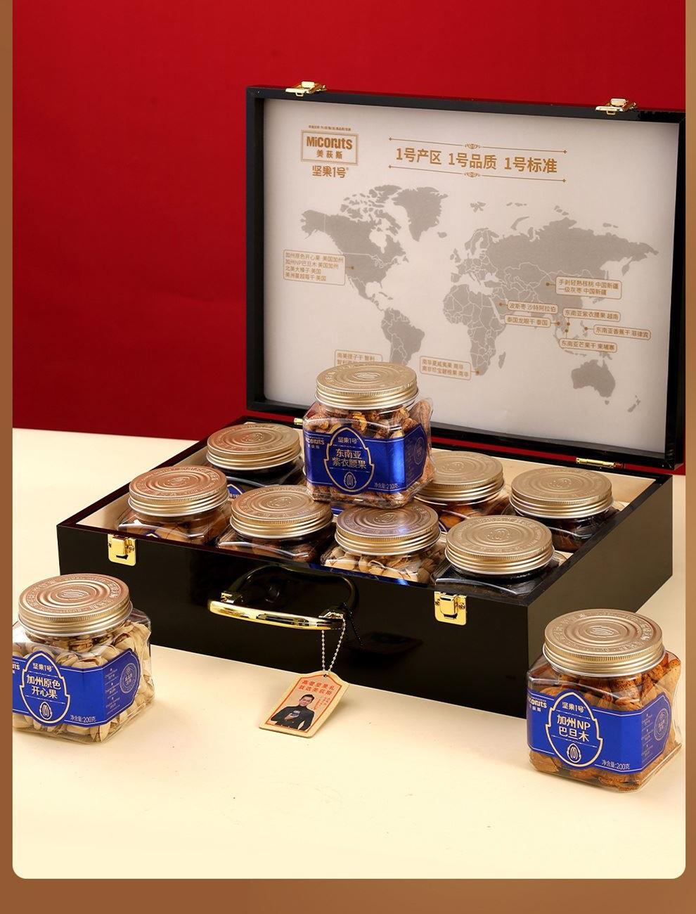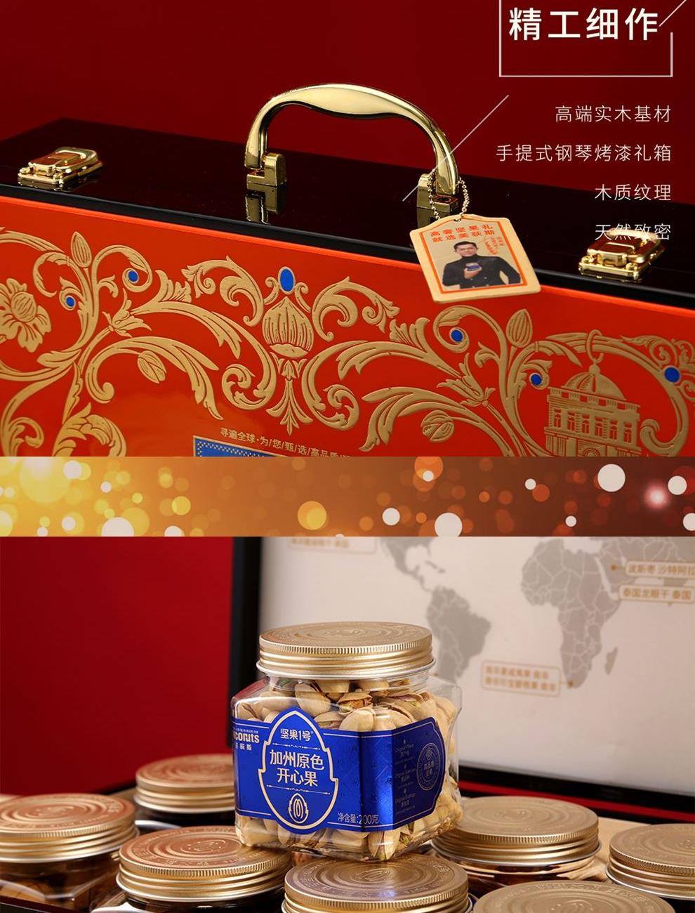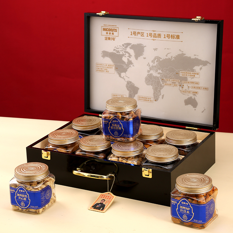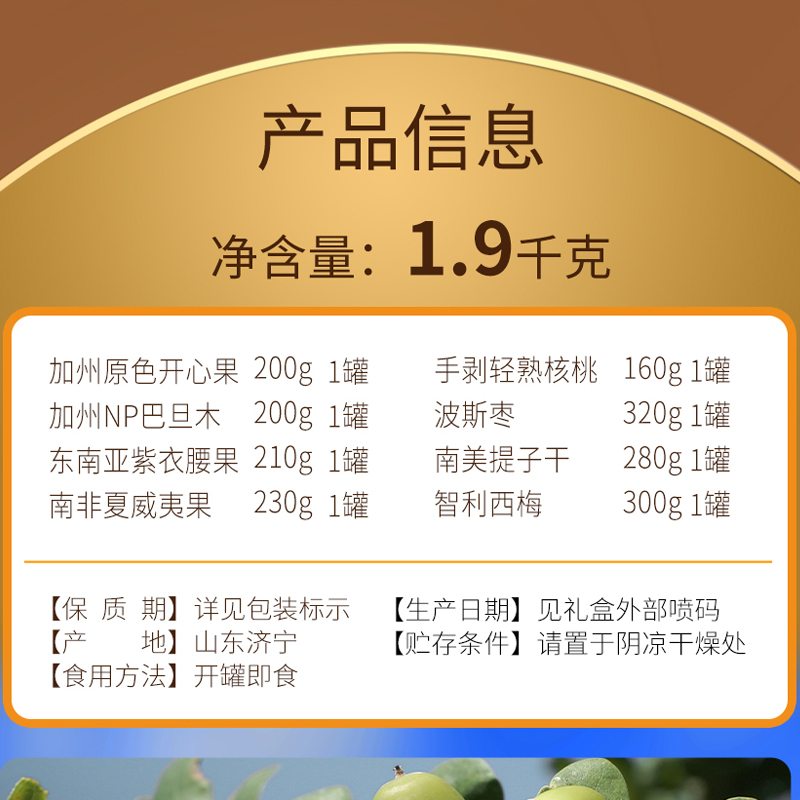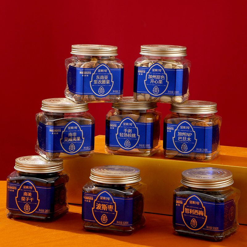 加州原色开心果(环球罐)200g*1 加州NP巴旦木(环球罐) 200g*1 东南亚紫衣腰果(环球罐)210g*1 南非夏威夷果(环球罐) 230g*1 手剥轻熟核桃(环球罐) 160g*1 波斯枣(环球罐) 320g*1 南美提子干(环球罐) 280g*1 智利西梅(环球罐) 300g*1 合计:1900g