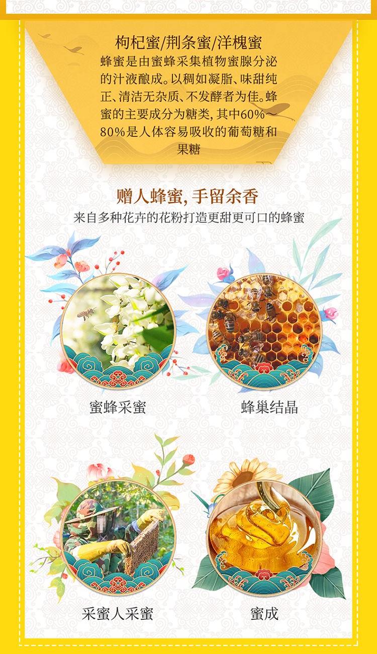 内置:枸杞蜜250g 荆条蜜250g 洋槐蜜250g 精美礼盒,甄选好料,色泽清透,光亮如油。 气味清香浓郁,味道纯真甜美,回味无穷。