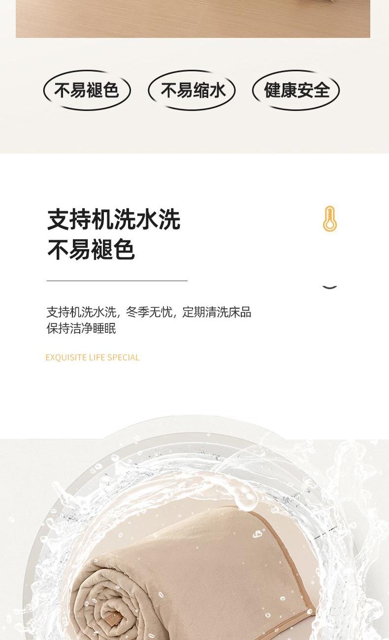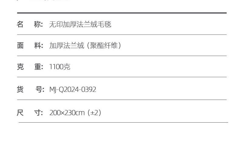规 格:200×230cm(±2) 面 料:加厚法兰绒 克 重:1100g 加厚法兰绒,细腻,软糯,亲肤,触感如婴儿肌肤,锁住温暖。 用心的品质把关,认真的细节处理,对用户尊重。 無印纯色风格,经典,让体验更舒适