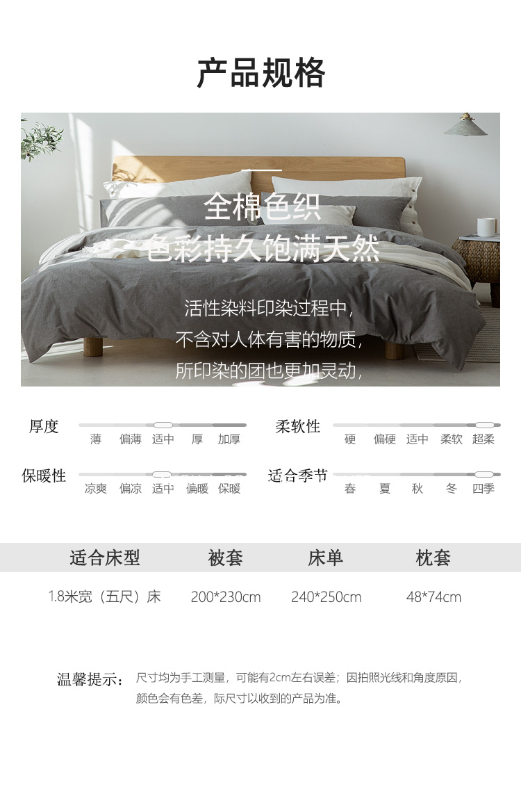 产品编码:JLY25703 产品规格:被套200*230cm 床单 240*250cm 枕套48*74cm*2 面料材质:棉(色织水洗) 净 重:2.9kg 礼盒 尺寸:420*320*95mm