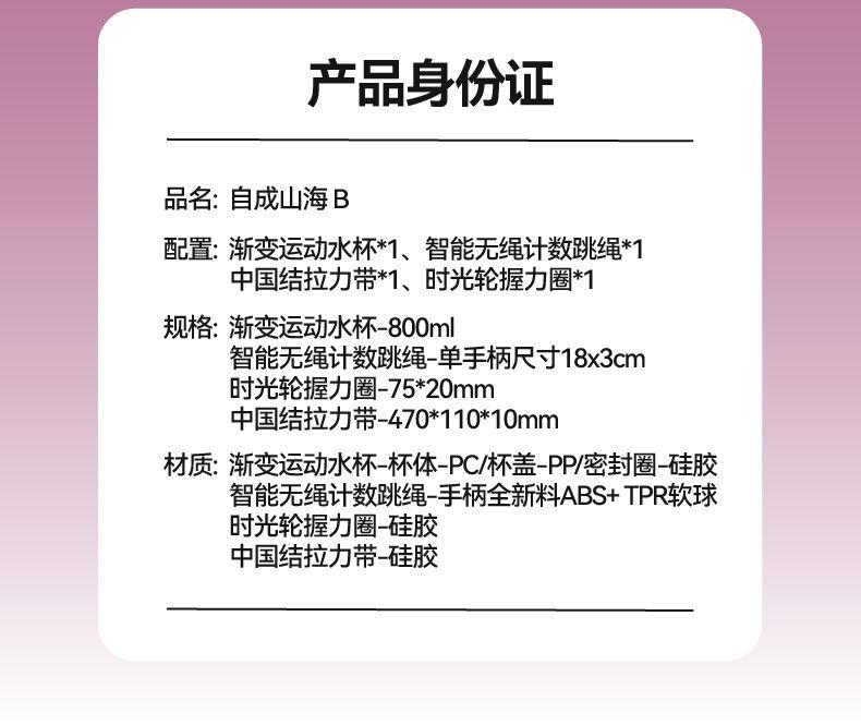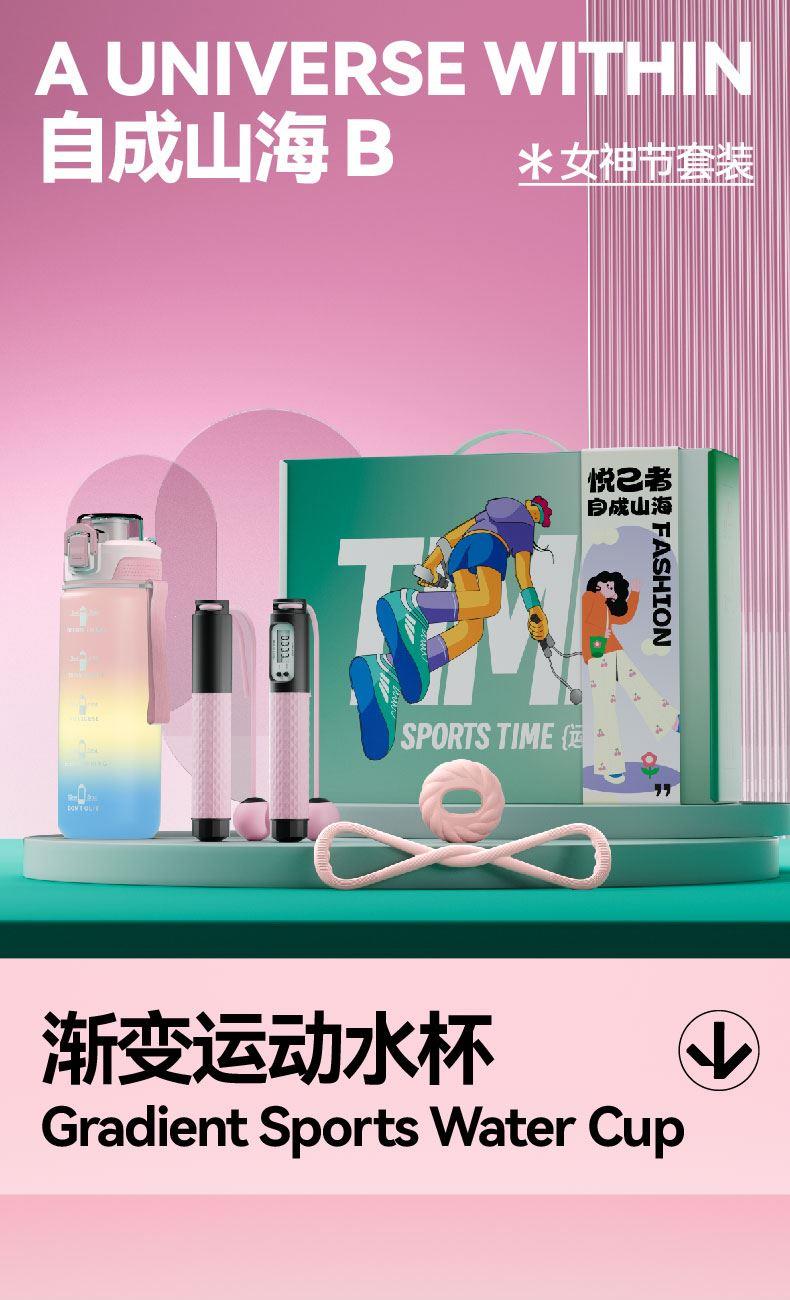 不必追赶谁的峰峦,也不必成为谁的波澜 真正的辽阔,是深知自己体内本就蕴藏着整座山脉与海洋 坚毅是山脊,柔韧是海浪 这个三八节,致敬每一位在奔跑与静息间自如流转的女性 你步履所至,即是风景自成 内配: 配置一:渐变色运动水壶x1 配置二:无绳计数跳绳x1 配置三:中国结拉力带x 1 配置三:时光轮握力圈x 1
