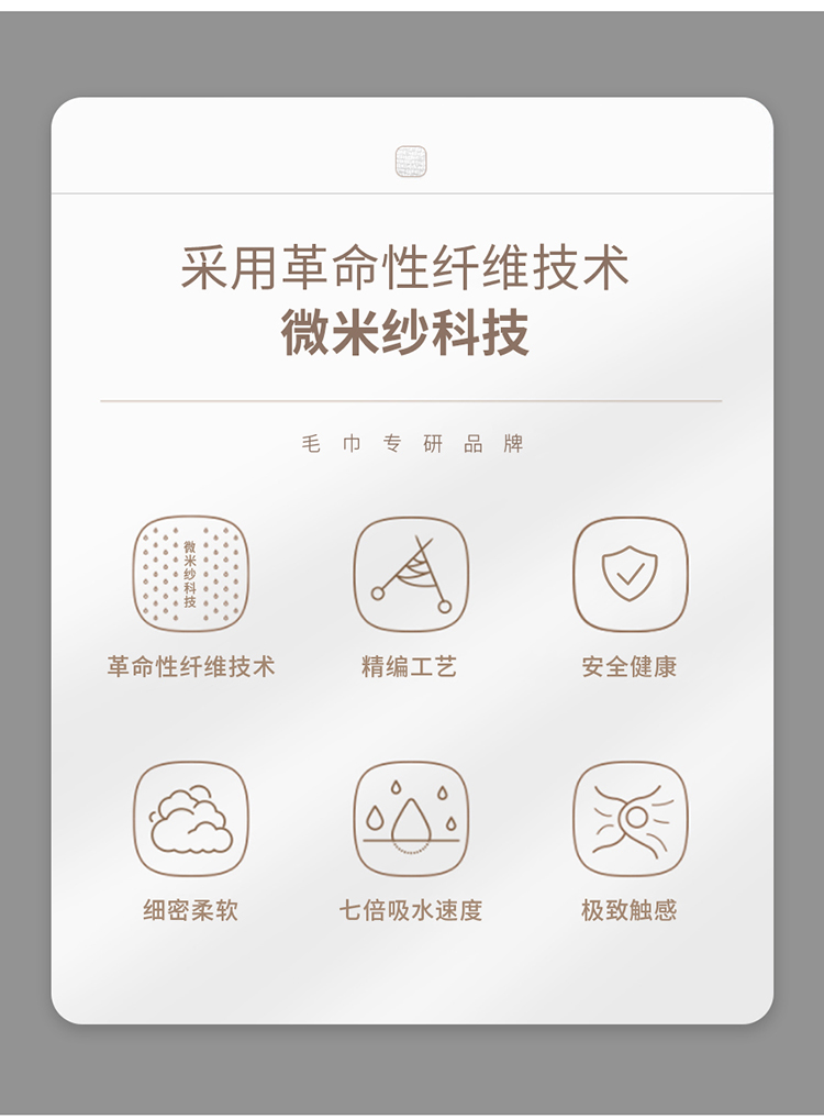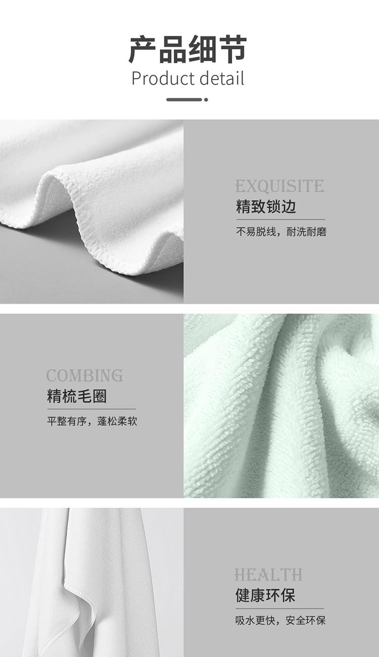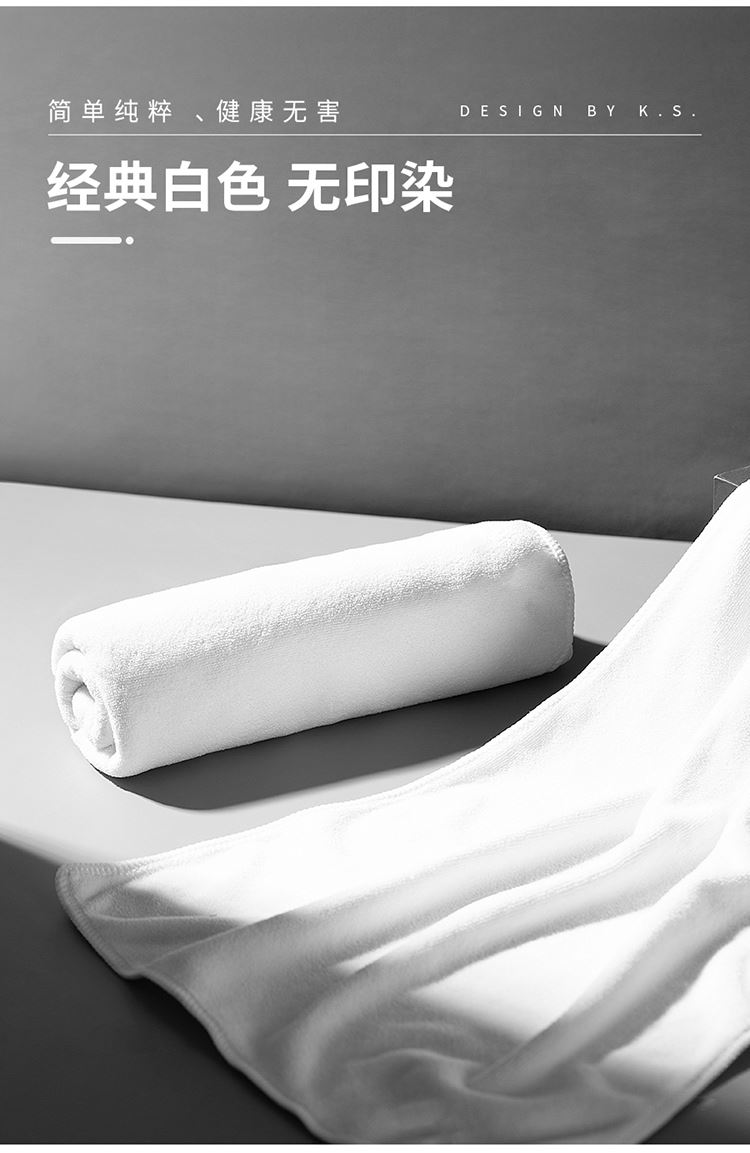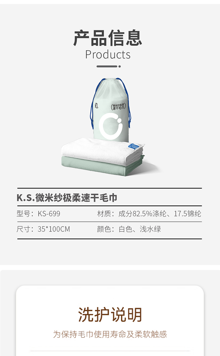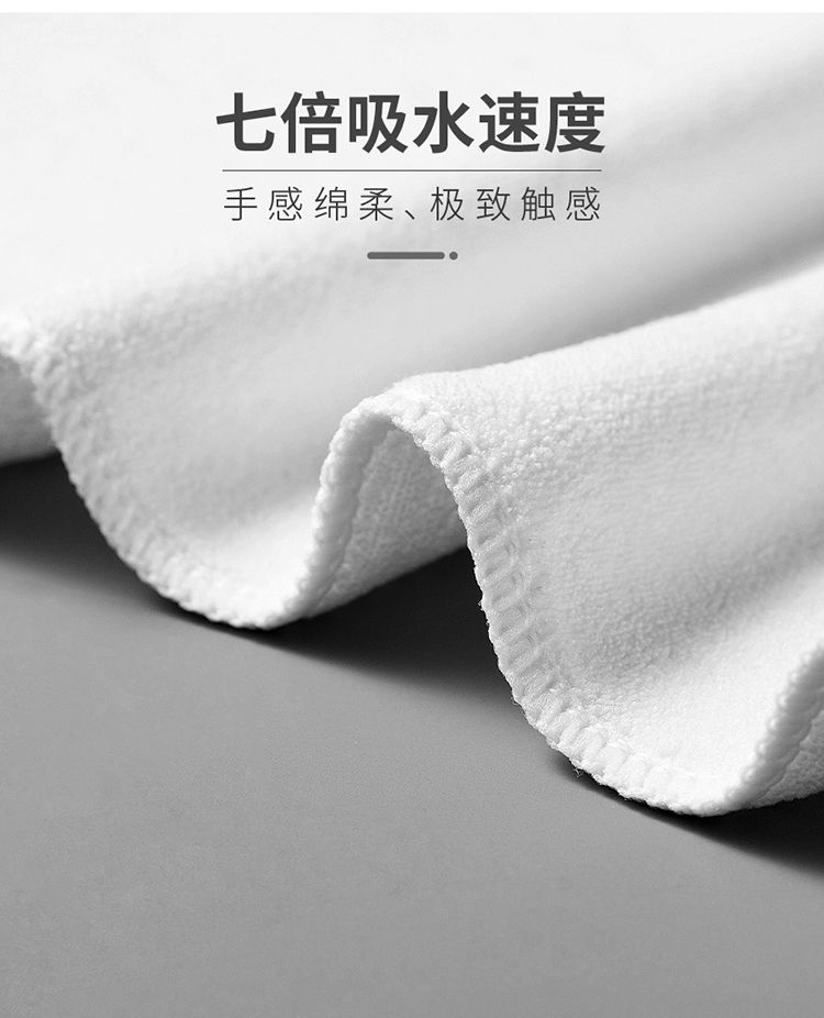 •材质: 成分82.5%涤纶、17.5锦纶 •规格:35*100cm •颜色:白色 •包装:PP束口袋 采用革命性纤维技术-微米纱科技, 七倍吸水速度,手感棉柔触感