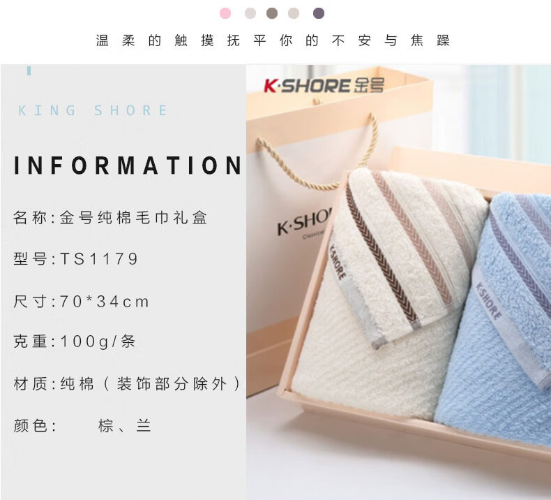 材质:纯棉 货号:TS1179 颜色:兰 棕 产品说明: 1.用心选好棉制成棉纤维,细长而柔软通过生产工艺让棉纤维在纺纱时充分接触空气,。 2.精梳大毛圈蓬松丰盈,加长毛环易吸水储水,轻轻擦拭即刻吸干面部水渍,肌肤悦亨清爽洁净。 3.无甲醛、无荧光剂、无致癌香胺,严选好材,纤长细软,蓬松柔韧。