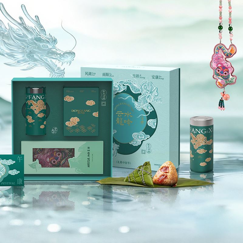 配置 · ① MiNi保温杯×1只(SUS316内胆丨200ml) ② 草本串珠香囊×1套(密封独立装) (刺绣艾虎香囊丨天然矿石串珠丨草本合香内料) ③ 发芽糙米粽×2只(100g/只) ④ 端午礼卡×1份 ⑤ 云水龙吟礼盒×1套(含袋) 尺寸 · 290×290×95mm