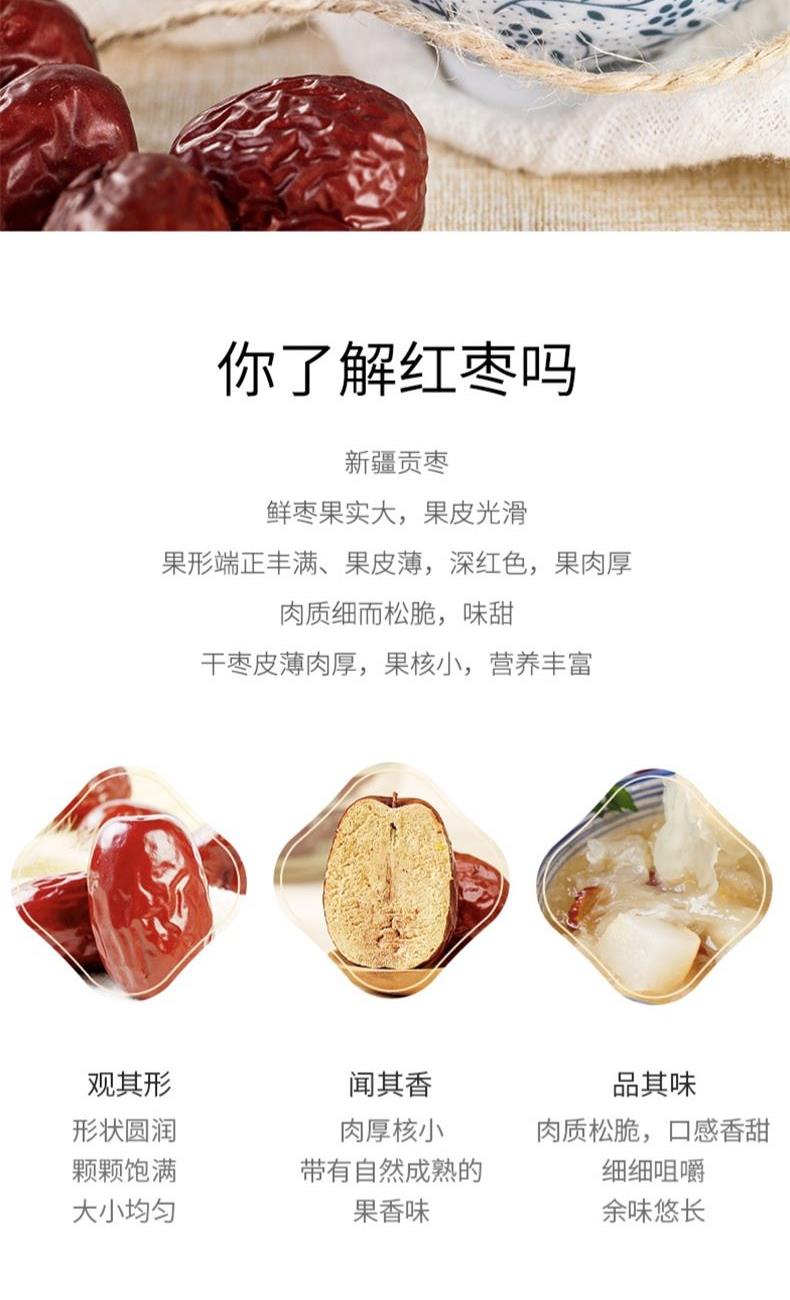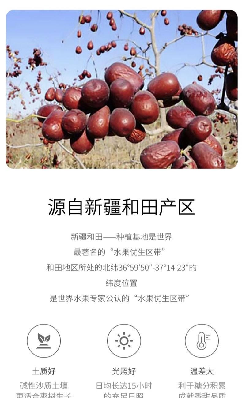 配料:骏枣 原料产地:新疆维吾尔自治区和田市 净含量:250克 保质期:10个月 生产日期:见包装物打印处 食用方法:可熬粥、煲汤、洗净生食、做馅等新疆骏枣源自塔克拉玛干沙漠南源,该地昼夜温差大,日照充足,造就了新疆骏枣皮薄肉厚、颗粒饱满的品质,食之令人回味无穷。