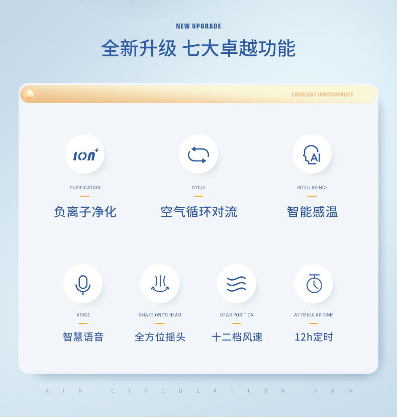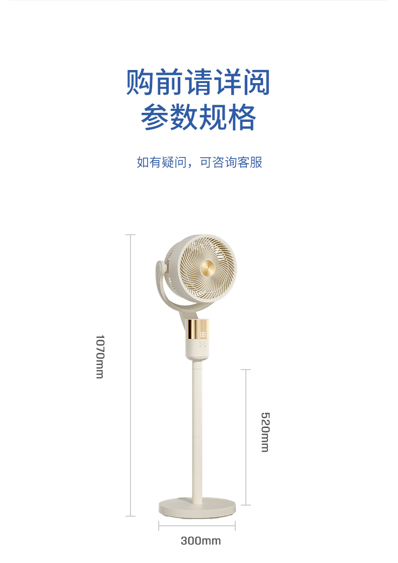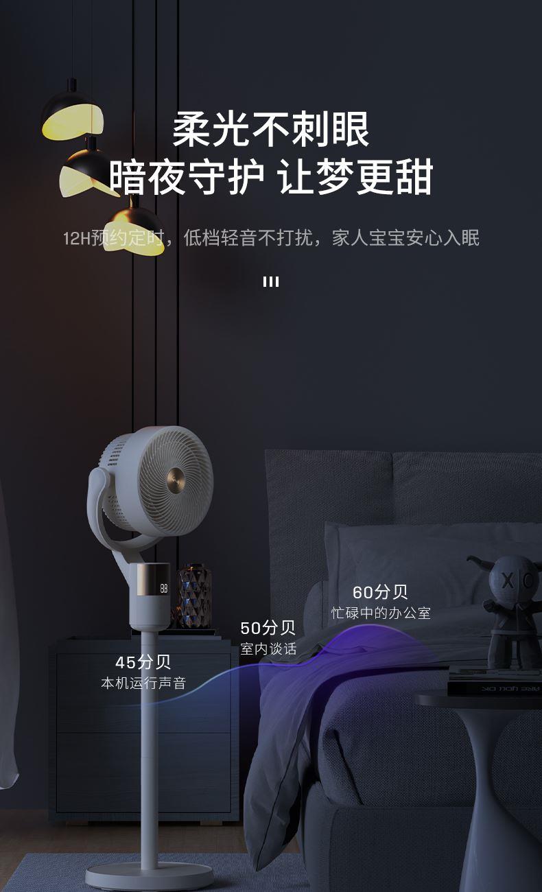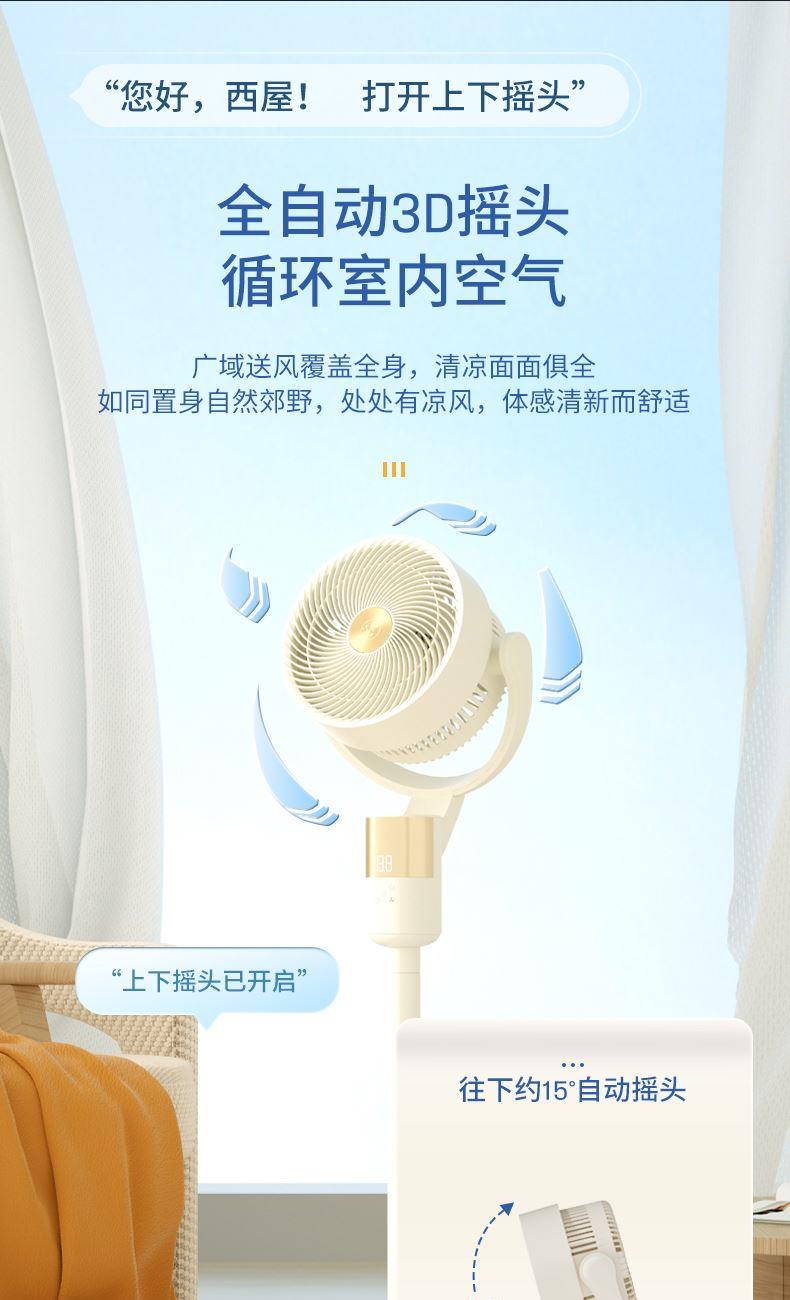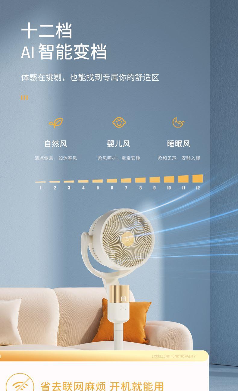 额定功率:35W 定时范围:12小时 档位:12档调节 控制方式:触控、遥控、语音、手机小程序 净重/毛重:4.4kg/5.4kg 产品尺寸:300*300*1070mm 1、首创超声波智能驱蚊,开机即开启; 2、12档风速调节,12小时预约定时,AI智能变频; 3、全自动3D遥头,上下90°,左右65°广域送风; 4、多种控制方式:触摸、遥控、手机小程序、AI智能语音交互; 5、自带记忆功能,隐藏式香熏盒,香随风远; 6、AI智能风,生态负离子净化,循环微气候; 7、高度可伸缩,台、立两用,满足不同摆放需求。 8、自带暖光小夜灯,静柔不刺眼