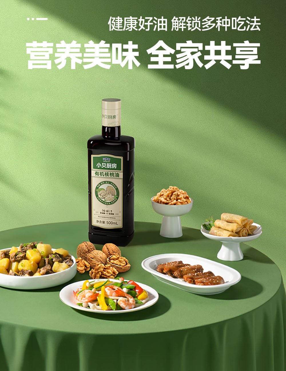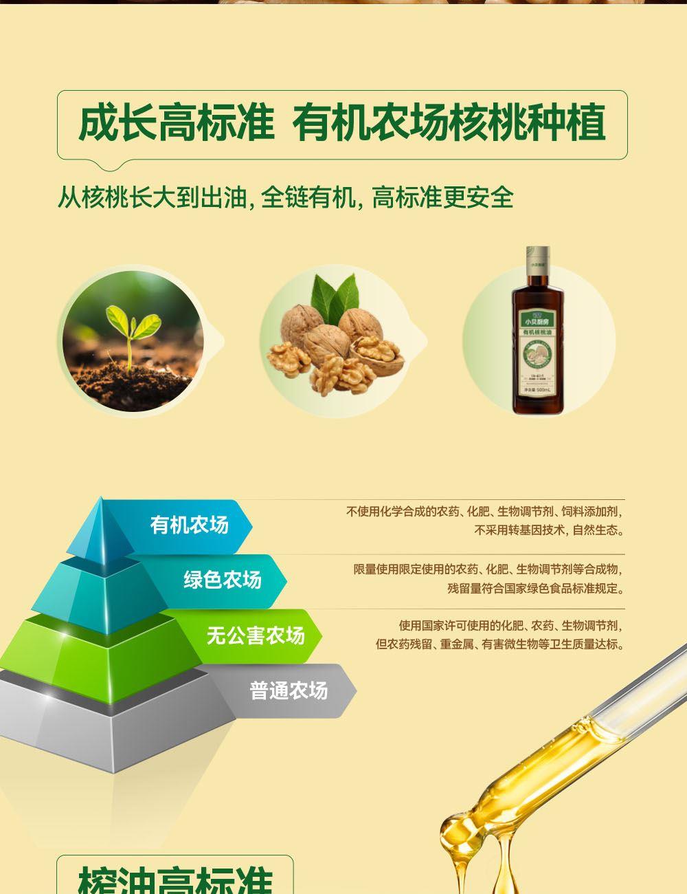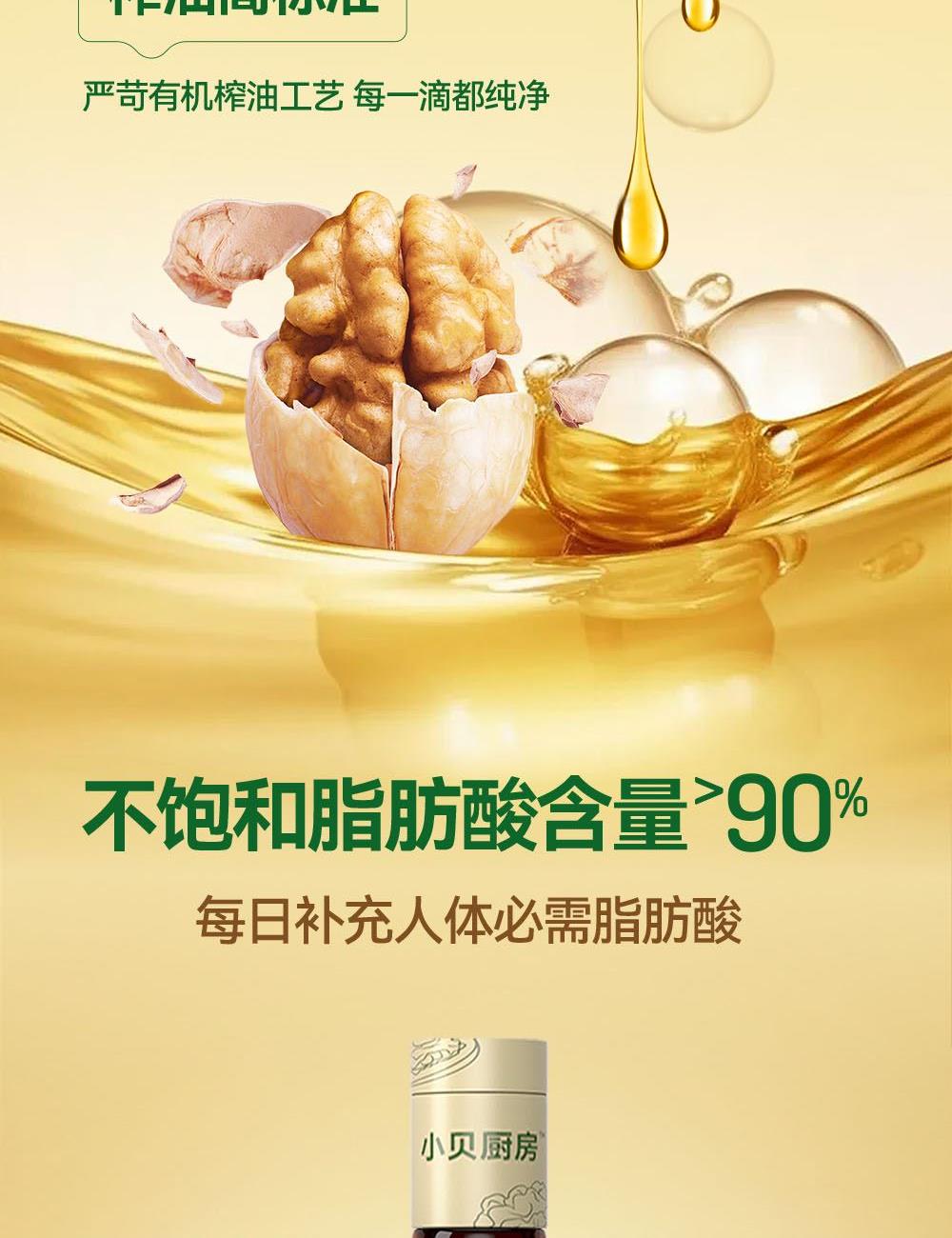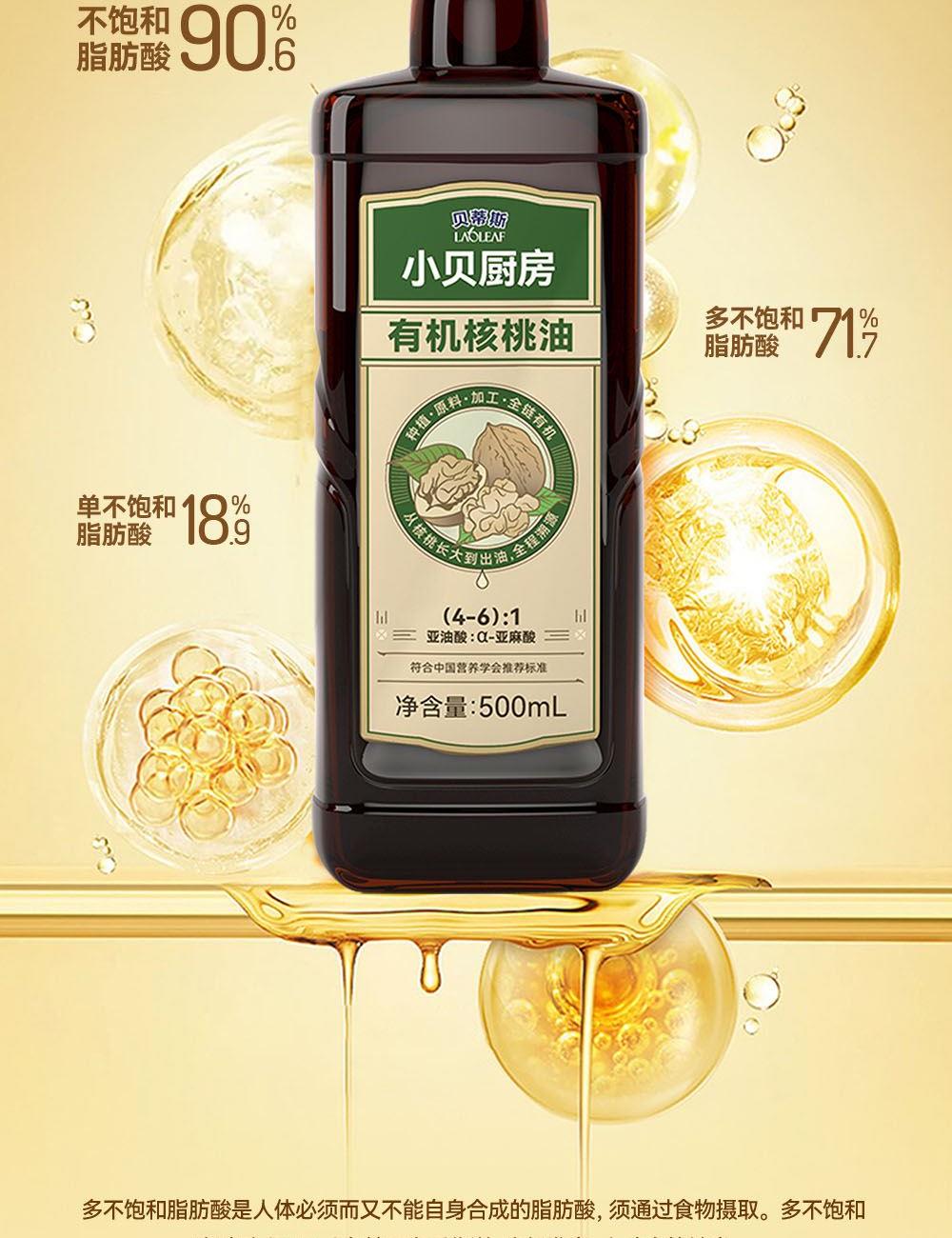 小贝厨房有机核桃油 容量:500ml 1、甄选新疆叶城25000亩有机核桃认证基地核桃,从核桃长大到出油,全链有机 2、中国、欧盟、美国的三重有机认证,全链有机可追溯 3、亚油酸:α-亚麻酸(4~6):1,脂肪酸黄金比例 ,符合中国营养 学会脂肪酸摄入推荐标准 4、 通过15项欧盟标准检测