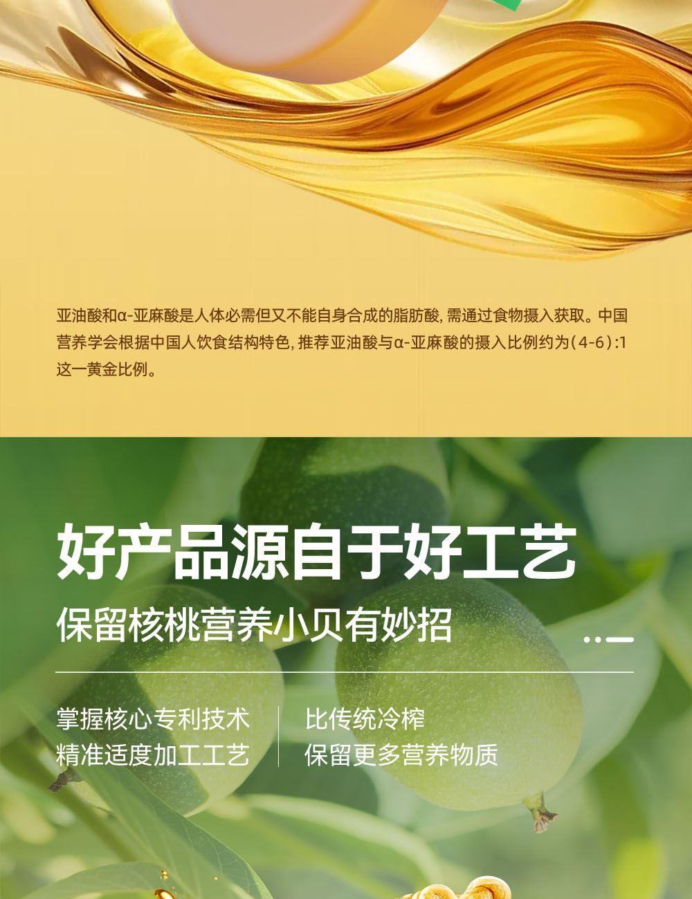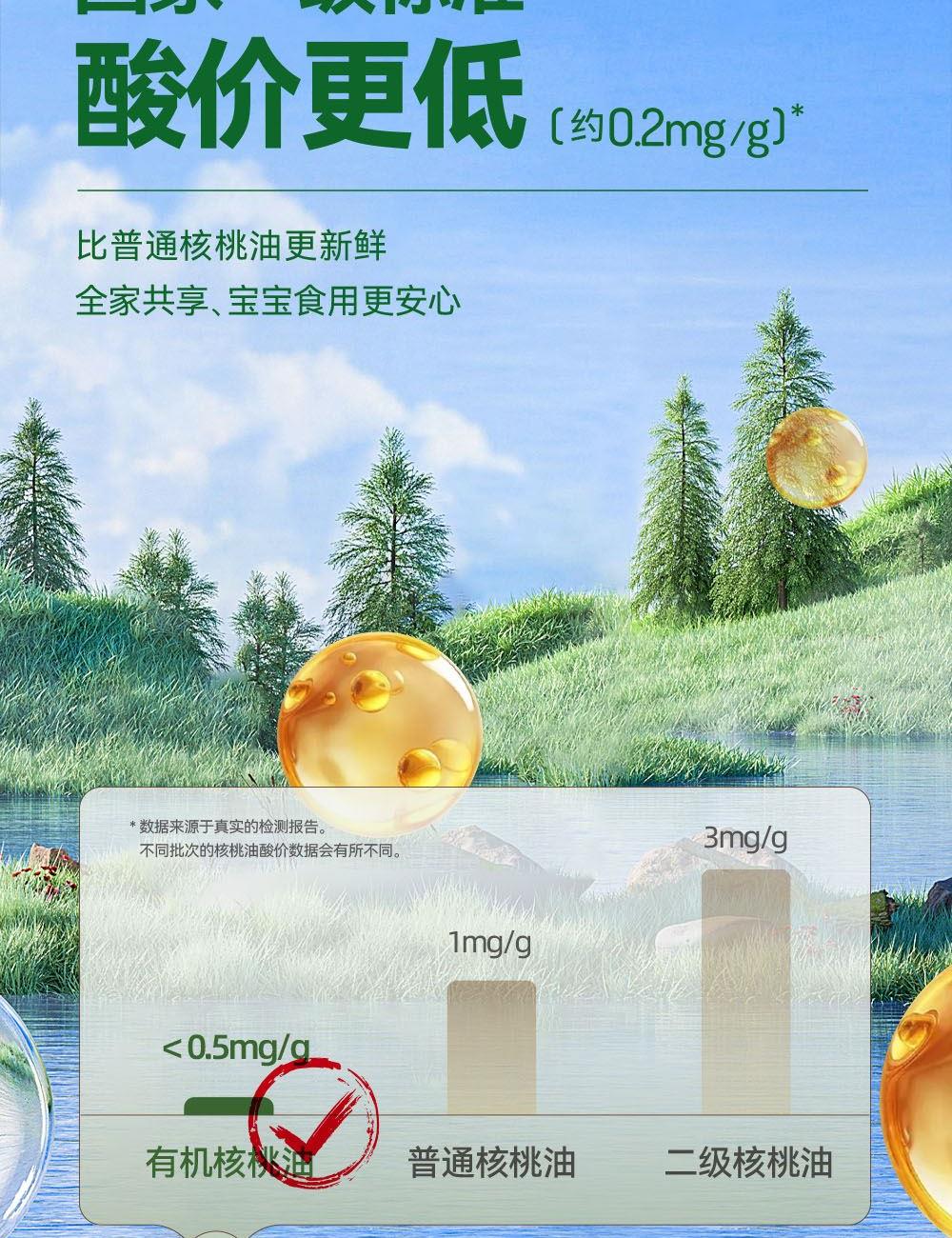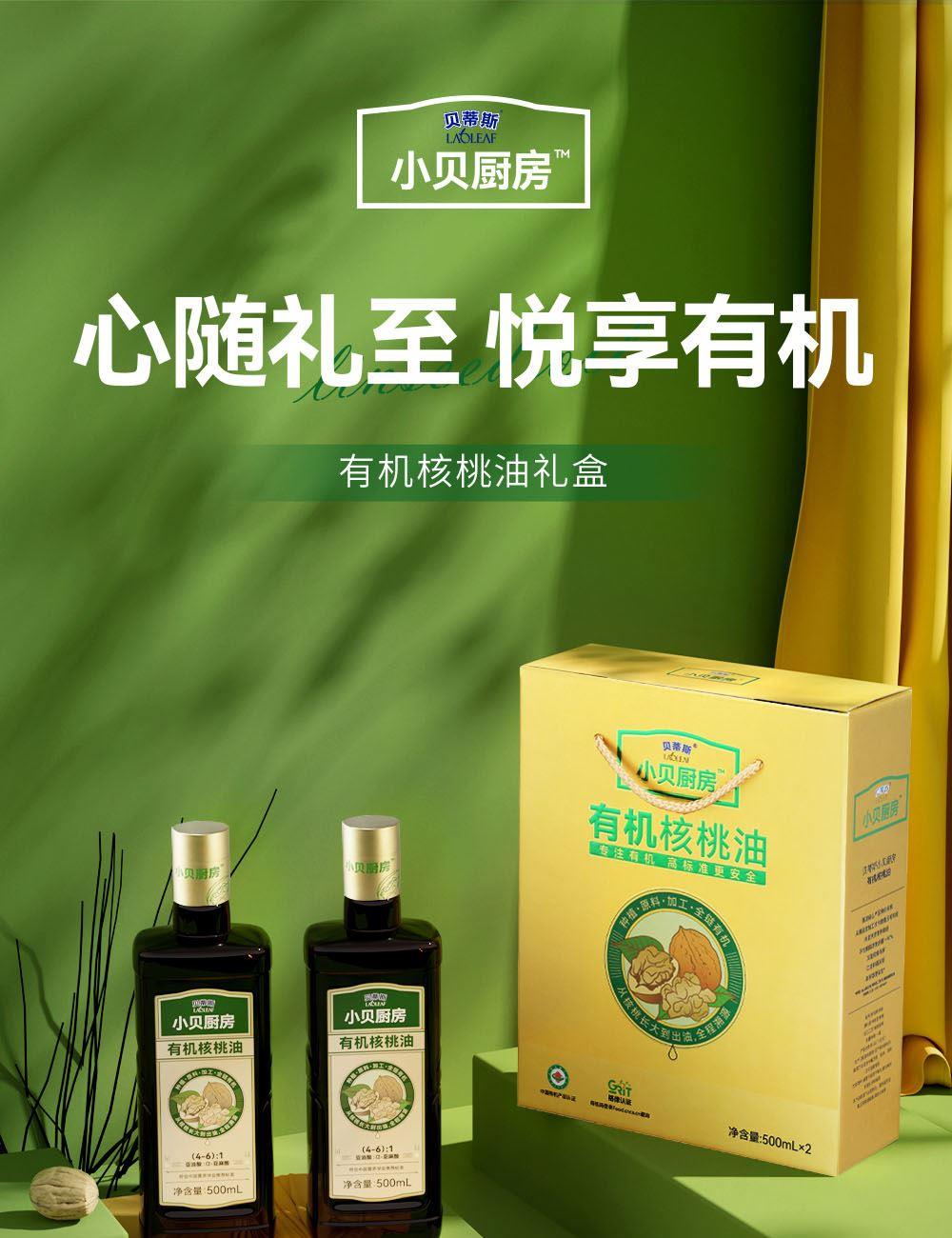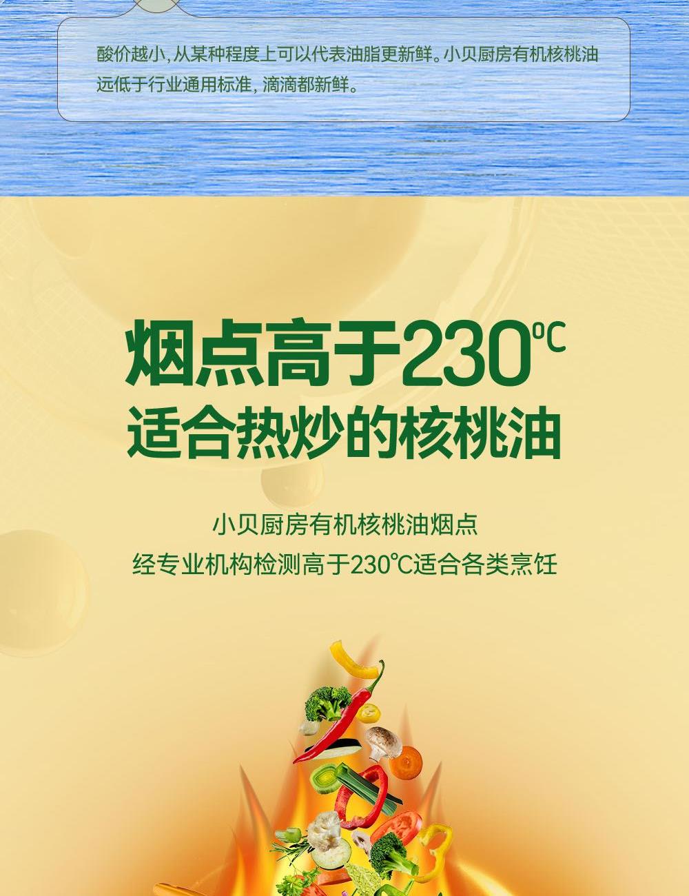 小贝厨房有机核桃油 容量:500ml 1、甄选新疆叶城25000亩有机核桃认证基地核桃,从核桃长大到出油,全链有机 2、中国、欧盟、美国的三重有机认证,全链有机可追溯 3、亚油酸:α-亚麻酸(4~6):1,脂肪酸黄金比例 ,符合中国营养 学会脂肪酸摄入推荐标准 4、 通过15项欧盟标准检测