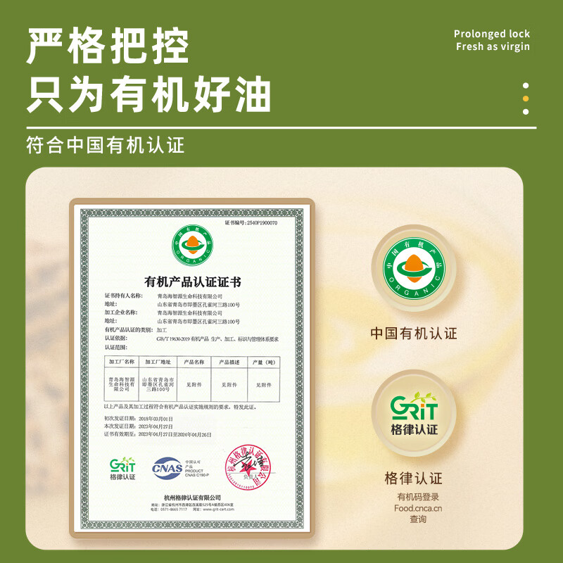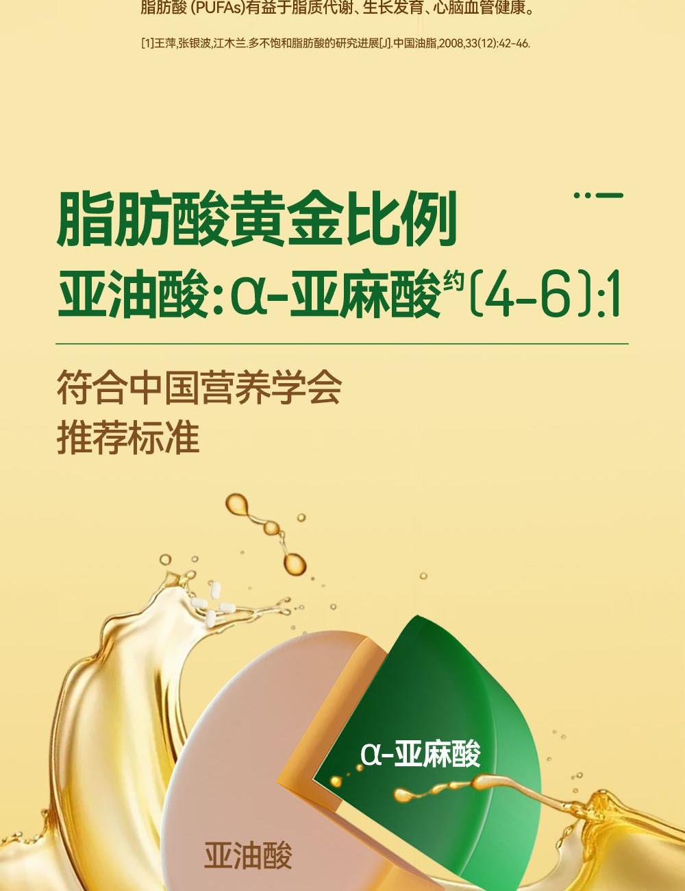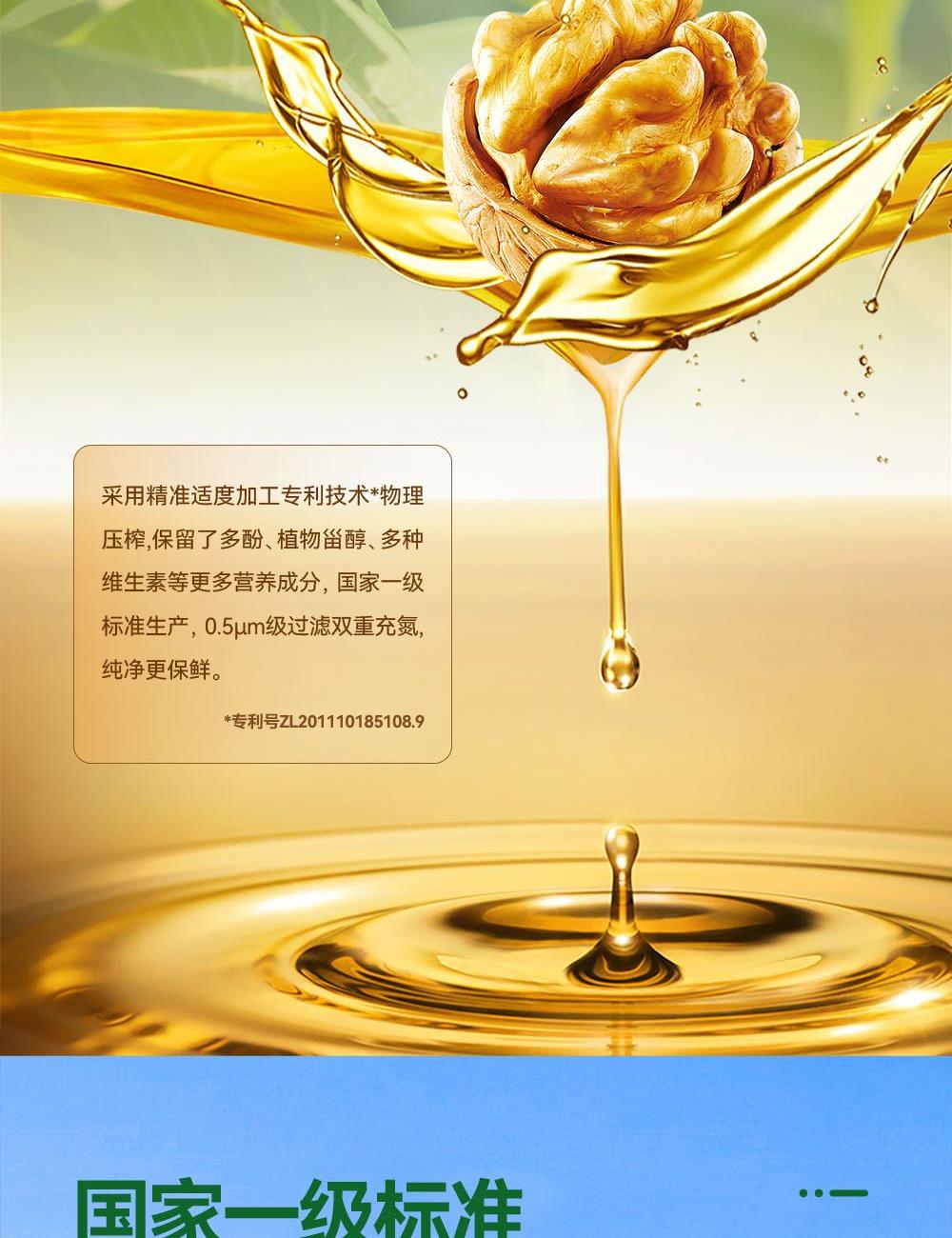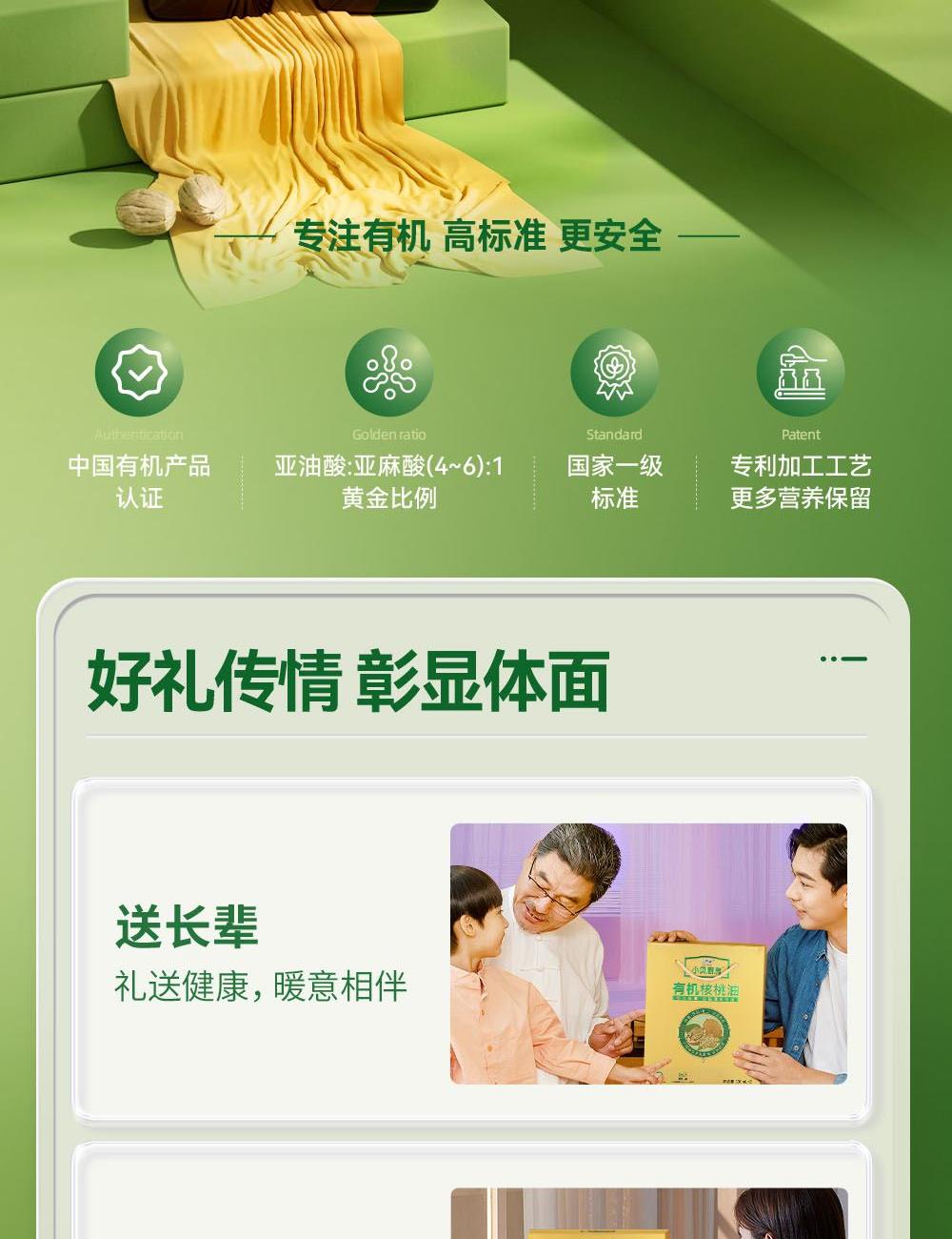小贝厨房有机核桃油 容量:500ml 1、甄选新疆叶城25000亩有机核桃认证基地核桃,从核桃长大到出油,全链有机 2、中国、欧盟、美国的三重有机认证,全链有机可追溯 3、亚油酸:α-亚麻酸(4~6):1,脂肪酸黄金比例 ,符合中国营养 学会脂肪酸摄入推荐标准 4、 通过15项欧盟标准检测